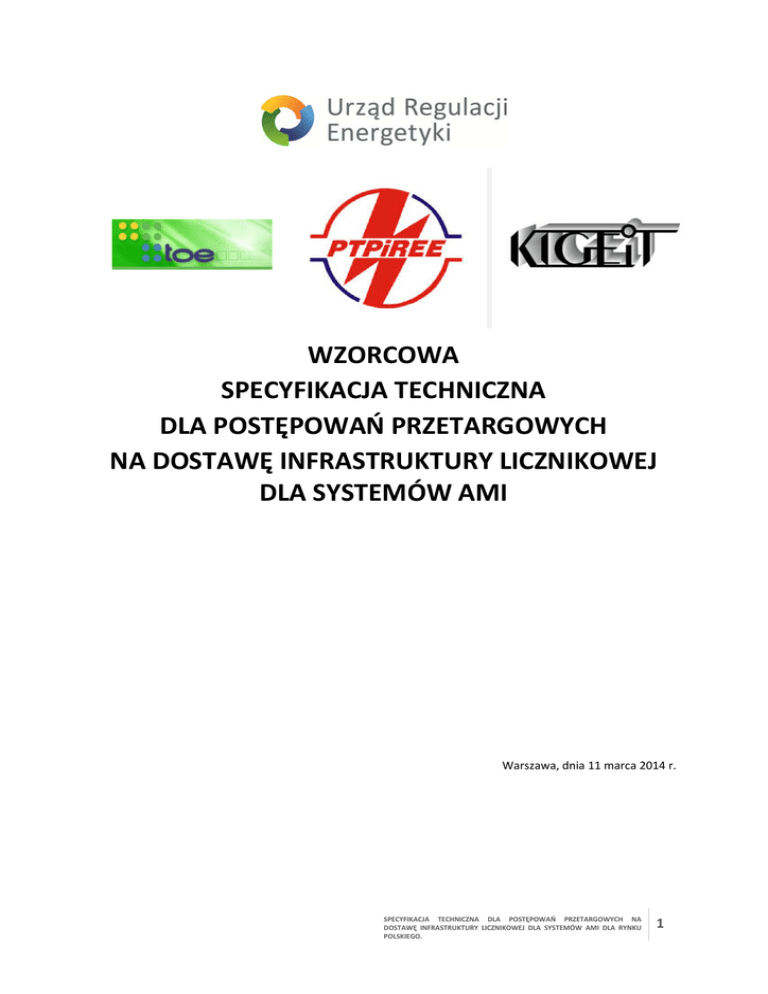 WZORCOWA SPECYFIKACJA TECHNICZNA DLA POSTĘPOWAŃ PRZETARGOWYCH NA DOSTAWĘ INFRASTRUKTURY LICZNIKOWEJ DLA SYSTEMÓW AMI Warszawa, dnia 11 marca 2014 r. SPECYFIKACJA TECHNICZNA DLA POSTĘPOWAŃ PRZETARGOWYCH NA DOSTAWĘ INFRASTRUKTURY LICZNIKOWEJ DLA SYSTEMÓW AMI DLA RYNKU POLSKIEGO. 1 WZORCOWA SPECYFIKACJA TECHNICZNA DLA POSTĘPOWAŃ PRZETARGOWYCH NA DOSTAWĘ INFRASTRUKTURY LICZNIKOWEJ DLA SYSTEMÓW AMI Spis treści I.PREAMBUŁA..................................................................................................................................4 II.DEFINICJE. ....................................................................................................................................7 III.WYMAGANIA TECHNICZNE..........................................................................................................9 WYMAGANIA DLA LICZNIKÓW KOMUNALNYCH 1 ORAZ 3‐FAZOWYCH.............................................................. 9 1.Pomiar i rejestracja wielkości fizycznych. ..............................................................................9 2.Sterowanie ...........................................................................................................................9 3.Konfiguracja licznika........................................................................................................... 10 4.Wykrywanie i rejestracja zdarzeń........................................................................................ 11 5.Prezentacja danych na wyświetlaczu. ................................................................................. 12 6.Komunikacja....................................................................................................................... 13 Wymagania ogólne. ........................................................................................................................................... 13 Komunikacja bezpośrednia z Systemem Centralnym .......................................................................................... 14 Komunikacja zewnętrzna ................................................................................................................................... 14 Komunikacja lokalna .......................................................................................................................................... 15 7.Port USB. ............................................................................................................................ 16 8.Parametry techniczne. ........................................................................................................ 17 9.Obsługa licznika.................................................................................................................. 18 10.Oprogramowanie.............................................................................................................. 18 11.Bezpieczeństwo................................................................................................................. 19 WYMAGANIA DLA LICZNIKÓW BILANSUJĄCYCH. ......................................................................................... 20 1.Pomiar i rejestracja wielkości fizycznych. ............................................................................ 20 2.Konfiguracja licznika........................................................................................................... 21 3. Wykrywanie i rejestracja zdarzeń....................................................................................... 22 4. Komunikacja……………………………………………………………………………………………………………………..23 Wymagania ogólne. ........................................................................................................................................... 23 Komunikacja bezpośrednia z Systemem Centralnym. ......................................................................................... 24 Komunikacja zewnętrzna …………………………………………………………………………………………………………………..…………….24 Komunikacja lokalna. ......................................................................................................................................... 24 5. Parametry techniczne. ....................................................................................................... 24 6. Obsługa licznika. ................................................................................................................ 25 7. Oprogramowanie............................................................................................................... 26 8. Bezpieczeństwo.................................................................................................................. 26 WYMAGANIA DLA LICZNIKÓW PÓŁPOŚREDNICH. ........................................................................................ 27 1.Pomiar i rejestracja wielkości fizycznych. ............................................................................ 27 2.Sterowanie. ........................................................................................................................ 28 3.Konfiguracja licznika........................................................................................................... 29 4.Wykrywanie i rejestracja zdarzeń........................................................................................ 30 SPECYFIKACJA TECHNICZNA DLA POSTĘPOWAŃ PRZETARGOWYCH NA DOSTAWĘ INFRASTRUKTURY LICZNIKOWEJ DLA SYSTEMÓW AMI DLA RYNKU POLSKIEGO. 2 5.Prezentacja danych na wyświetlaczu. ................................................................................. 30 6.Komunikacja....................................................................................................................... 31 Wymagania ogólne. ........................