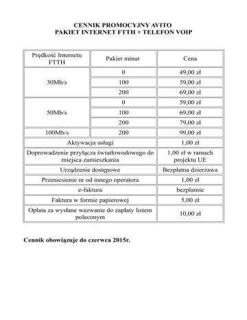 CENNIK PROMOCYJNY AVITO PAKIET INTERNET FTTH + TELEFON VOIP Prędkość Internetu FTTH Pakiet minut Cena 0 49,00 zł 100 59,00 zł 200 69,00 zł 0 59,00 zł 100 69,00 zł 200 79,00 zł 200 99,00 zł 30Mb/s 50Mb/s 100Mb/s Aktywacja usługi 1,00 zł Doprowadzenie przyłącza światłowodowego do miejsca zamieszkania 1,00 zł w ramach projektu UE Urządzenie dostępowe Bezpłatna dzierżawa Przeniesienie nr od innego operatora 1,00 zł e-faktura bezpłatnie Faktura w formie papierowej 5,00 zł Opłata za wysłane wezwanie do zapłaty listem poleconym 10,00 zł Cennik obowiązuje do czerwca 2015r.