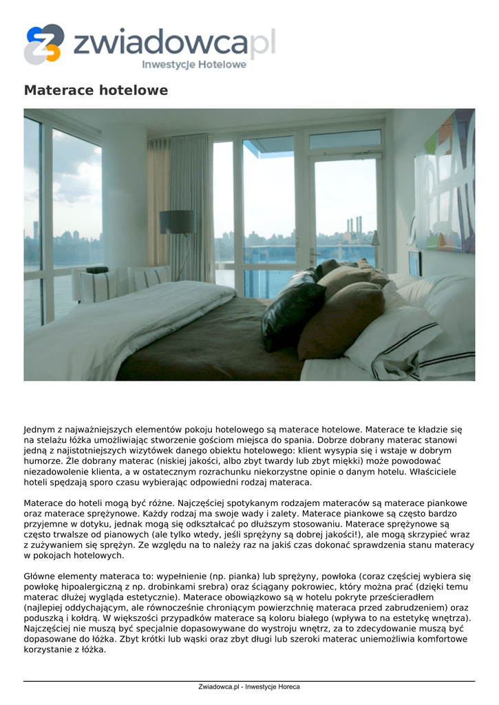 Materace hotelowe Jednym z najważniejszych elementów pokoju hotelowego są materace hotelowe. Materace te kładzie się na stelażu łóżka umożliwiając stworzenie gościom miejsca do spania. Dobrze dobrany materac stanowi jedną z najistotniejszych wizytówek danego obiektu hotelowego: klient wysypia się i wstaje w dobrym humorze. Źle dobrany materac (niskiej jakości, albo zbyt twardy lub zbyt miękki) może powodować niezadowolenie klienta, a w ostatecznym rozrachunku niekorzystne opinie o danym hotelu. Właściciele hoteli spędzają sporo czasu wybierając odpowiedni rodzaj materaca. Materace do hoteli mogą być różne. Najczęściej spotykanym rodzajem materaców są materace piankowe oraz materace sprężynowe. Każdy rodzaj ma swoje wady i zalety. Materace piankowe są często bardzo przyjemne w dotyku, jednak mogą się odkształcać po dłuższym stosowaniu. Materace sprężynowe są często trwalsze od pianowych (ale tylko wtedy, jeśli sprężyny są dobrej jakości!), ale mogą skrzypieć wraz z zużywaniem się sprężyn. Ze względu na to należy raz na jakiś czas dokonać sprawdzenia stanu materacy w pokojach hotelowych. Główne elementy materaca to: wypełnienie (np. pianka) lub sprężyny, powłoka (coraz częściej wybiera się powłokę hipoalergiczną z np. drobinkami srebra) oraz ściągany pokrowiec, który można prać (dzięki temu materac dłużej wygląda estetycznie). Materace obowiązkowo są w hotelu pokryte prześcieradłem (najlepiej oddychającym, ale równocześnie chroniącym powierzchnię materaca przed zabrudzeniem) oraz poduszką i kołdrą. W większości przypadków materace są koloru białego (wpływa to na estetykę wnętrza). Najczęściej nie muszą być specjalnie dopasowywane do wystroju wnętrz, za to zdecydowanie muszą być dopasowane do łóżka. Zbyt krótki lub wąski oraz zbyt długi lub szeroki materac uniemożliwia komfortowe korzystanie z łóżka. Zwiadowca.pl - Inwestycje Horeca Obecnie na rynku jest bardzo dużo firm zajmujących się produkcją różnego rodzaju materaców. Mają one przeróżne fasony, wzory, wypełnienie i pokrycie. Na życzenie klienta pokrycie może mieć wygrawerowany emblemat (np. nazwę i logo hotelu). Materace mogą być także produkowane na indywidualne zamówienie klientów (np. jeśli klient chce mieć nowy materac do starodawnego łóżka o nietypowych wymiarach). Materace występują we wszystkich obiektach hotelowych: hotelach, pensjonatach, domach wczasowych oraz różnego rodzaju ośrodkach wypoczynkowych. Ceny materaców wahają się od kilkudziesięciu złotych (w przypadku np. materaca do łóżeczka dziecięcego) do kilku tysięcy złotych (w przypadku porządnego materaca do łóżka dwuosobowego). O czystość materaca hotelowego dba zazwyczaj serwis sprzątający. Zwiadowca.pl - Inwestycje Horeca Powered by TCPDF (www.tcpdf.org)