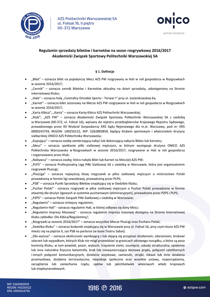 Regulamin sprzedaży biletów i karnetów na sezon rozgrywkowy 2016/2017 Akademicki Związek Sportowy Politechniki Warszawskiej SA § 1. Definicje „Bilet” – oznacza bilet na pojedynczy Mecz AZS PW rozgrywany w Hali w roli gospodarza w Rozgrywkach w sezonie 2016/2017; „Cennik” – oznacza cennik Biletów i Karnetów aktualny na dzieo sprzedaży, udostępniony na Stronie internetowej Klubu; „Hala” – oznacza halę „Centralny Ośrodek Sportu - Torwar I” przy ul. Łazienkowskiej 6a; „Karnet” – oznacza bilet sezonowy na Mecze AZS PW rozgrywane w Hali w roli gospodarza w Rozgrywkach w sezonie 2016/2017; „Karta Kibica”; „Karta” – oznacza Kartę Kibica AZS Politechniki Warszawskiej; „Klub”; „AZS PW” – oznacza Akademicki Związek Sportowy Politechniki Warszawskiej SA z siedzibą w Warszawie (00-372, ul. Foksal 16), wpisany do rejestru przedsiębiorców Krajowego Rejestru Sądowego, prowadzonego przez XII Wydział Gospodarczy KRS Sądu Rejonowego dla m.st. Warszawy, pod nr: KRS 0000243759, REGON: 140250122, NIP: 5262883859, będący klubem sportowym i właścicielem drużyny siatkarskiej ONICO AZS Politechnika Warszawska; „Kupujący” – oznacza osobę zamierzającą nabyd lub dokonującą nabycia Biletu lub Karnetu; „Mecz” – oznacza spotkanie piłki siatkowej mężczyzn, w którym występuje drużyna ONICO AZS Politechnika Warszawska w Rozgrywkach w sezonie 2016/2017, rozgrywane w Hali w roli gospodarza i organizowane przez Klub; „Nabywca” – oznacza osobę, która nabyła Bilet lub Karnet na Mecz(e) AZS PW; „PLPS” – oznacza Profesjonalną Ligę Piłki Siatkowej SA z siedzibą w Warszawie, która jest organizatorem rozgrywek PlusLigi; „PlusLiga” – oznacza najwyższą klasę rozgrywek w piłce siatkowej mężczyzn o mistrzostwo Polski prowadzoną w formie ligi zawodowej, prowadzoną przez PLPS; „PSB” – oznacza Punkt Sprzedaży Biletów znajdujący się w Siedzibie Klubu; „Puchar Polski” - oznacza rozgrywki w piłce siatkowej mężczyzn o Puchar Polski prowadzone w formie otwartej dla drużyn ligowych w systemie pucharowym (eliminacyjnym), prowadzone przez PZPS i PLPS; „PZPS” – oznacza Polski Związek Piłki Siatkowej z siedzibą w Warszawie; „Regulamin” – oznacza niniejszy regulamin; „Regulamin Hali” - oznacza regulamin Hali, w której odbywa się dany Mecz; „Regulamin Imprezy Masowej” - oznacza regulamin imprezy masowej dostępny na Stronie Internetowej Klubu zakładka: Dla Kibica/Regulaminy/; „Rozgrywki w sezonie 2016/2017” – oznacza wszystkie Mecze PlusLigi oraz Pucharu Polski; „Siedziba Klubu” – oznacza budynek znajdujący się w Warszawie przy ul. Foksal 16, przy czym biuro AZS PW mieści się na piętrze II, zaś PSB na parterze (w kasie Teatru Sabat). „Siła wyższa” – oznacza okolicznośd wynikającą z lub dającą się przypisad działaniom, zdarzeniom, brakowi zdarzeo lub wypadkom, których Klub nie mógł przewidzied w granicach zdrowego rozsądku, a które są poza kontrolą Klubu, w tym powódź, pożar, wybuch, trzęsienie ziemi, osunięcie, szkoda strukturalna, epidemia lub inna naturalna fizyczna katastrofa, brak lub niewystarczająca dostawa prądu, połączeo satelitarnych i innych połączeo komunikacyjnych, działania wojskowe, zamieszki, strajki, lokaut lub inne działania przemysłowe, działania terrorystyczne, niepokoje społeczne oraz wszelkie ustawy, rozporządzenia, zarządzenia lub zaniechania rządu, sądów lub jakichkolwiek właściwych władz krajowych lub międzynarodowych. „Strona internetowa Klubu” – oznacza stronę www.azspw.com. „System internetowy” – oznacza system sprzedaży internetowej Biletów oraz Karnetów, który jest prowadzony przez Klub, udostępniony pod adresem strony internetowej: azspw.ticketik.pl oraz – na potrzeby niniejszego regulaminu – elektroniczny system płatności internetowych za Bilety oraz Karnety. „Użytkownik” – oznacza osobę zarejestrowaną w Systemie internetowym, posiadającą login i hasło do Systemu internetowego. § 2. Postanowienia ogólne 1. 2. Sprzedaż Biletów i Karnetów prowadzona jest przez Klub. Sprzedaż prowadzona jest z wykorzystaniem Systemu internetowego od zewnętrznego Administratora – firmy Ticketik Sp. z o.o. (www.ticketik.pl) 3. Przez dokonanie zakupu Biletu i/lub Karnetu, jego Nabywca akceptuje niniejszy Regulamin oraz Regulamin Hali i Regulamin Imprezy Masowej. 4. Klub prowadzi sprzedaż Biletów i Karnetów na Mecze w terminach określonych w odrębnych informacjach prezentowanych na Stronie internetowej Klubu oraz na oficjalnych kontach Klubu w portalach społecznościowych. Klub nie ponosi odpowiedzialności za dane dotyczące terminów Meczów, pozyskane z innych źródeł niż powyższe oraz nie gwarantuje ich prawidłowości. 5. Klub zastrzega, iż terminy Meczów mogą ulegad zmianom na żądanie PZPS bądź PLPS, za co Klub nie ponosi odpowiedzialności. 6. Ceny sprzedaży Biletów i Karnetów umieszczane na Stronie internetowej Klubu oraz na innych oficjalnych kanałach dystrybucyjnych zawierają podatek VAT. Ceny Biletów i Karnetów są cenami ostatecznymi. 7. Kupujący, dokonując zakupu Biletów i Karnetów, zobowiązuje się do przestrzegania powszechnie obowiązujących przepisów prawa oraz ponosi odpowiedzialnośd za oświadczenia składane w związku z zakupem i korzystaniem z Biletów i Karnetów. 8. Klub nie sprzedaje Biletów i Karnetów osobom wobec których: a. orzeczono obowiązujący w chwili sprzedaży Biletu bądź Karnetu zakaz wstępu na imprezę masową lub zobowiązanie do powstrzymywania się od przebywania w miejscach przeprowadzania imprez masowych w związku z warunkowym zawieszeniem wykonania kary pozbawienia wolności albo wobec nieletniego na podstawie art. 6 pkt.2 ustawy z dnia 26 października 1982 r. o postępowaniu w sprawach nieletnich; b. został wydany obowiązujący w chwili sprzedaży zakaz klubowy. 9. Po wejściu N