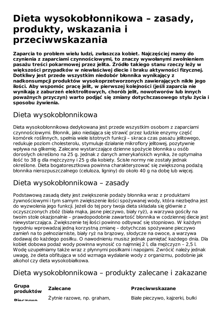 Dieta wysokobłonnikowa – zasady, produkty, wskazania i przeciwwskazania Zaparcia to problem wielu ludzi, zwłaszcza kobiet. Najczęściej mamy do czynienia z zaparciami czynnościowymi, to znaczy wywołanymi zwolnieniem pasażu treści pokarmowej przez jelita. Źródło takiego stanu rzeczy leży w większości przypadków w niewłaściwej diecie i braku aktywności fizycznej. Dotkliwy jest przede wszystkim niedobór błonnika wynikający z nadkonsumpcji produktów wysokoprzetworzonych zawierających nikłe jego ilości. Aby wspomóc pracę jelit, w pierwszej kolejności (jeśli zaparcia nie wynikają z zaburzeń elektrolitowych, chorób jelit, nowotworów lub innych poważnych przyczyn) warto podjąć się zmiany dotychczasowego stylu życia i sposobu żywienia. Dieta wysokobłonnikowa Dieta wysokobłonnikowa dedykowana jest przede wszystkim osobom z zaparciami czynnościowymi. Błonnik, jako niedająca się strawić przez ludzkie enzymy część komórek roślinnych, spełnia wiele istotnych funkcji – skraca czas pasażu jelitowego, redukuje poziom cholesterolu, stymuluje działanie mikroflory jelitowej, pozytywnie wpływa na glikemię. Zalecane wystarczające dzienne spożycie błonnika u osób dorosłych określono na 25 g. Jednak z danych amerykańskich wynika, że optymalna ilość to 38 g dla mężczyzny i 25 g dla kobiety. Ścisłe normy nie zostały jednak określone. Dieta bogatoresztkowa powinna charakteryzować się zwiększoną podażą błonnika nierozpuszczalnego (celuloza, ligniny) do około 40 g na dobę lub więcej. Dieta wysokobłonnikowa – zasady Podstawową zasadą diety jest zwiększenie podaży błonnika wraz z produktami żywnościowymi i tym samym zwiększenie ilości spożywanej wody, która niezbędna jest do wyzwolenia jego funkcji. Jeżeli do tej pory twoja dieta składała się głównie z oczyszczonych zbóż (biała mąka, jasne pieczywo, biały ryż), a warzywa gościły na twoim stole okazjonalnie – prawdopodobnie zawartość błonnika w codziennej diecie jest niewystarczająca. Zwiększenie tej ilości powinno odbywać się stopniowo. W każdym tygodniu wprowadzaj jedną korzystną zmianę – dotychczas spożywane pieczywo zamień na to pełnoziarniste, biały ryż na brązowy, słodycze na owoce, a warzywa dodawaj do każdego posiłku. O nawodnieniu musisz jednak pamiętać każdego dnia. Dla kobiet dobowa podaż wody powinna wynosić co najmniej 2 l, dla mężczyzn – 2,5 l. Wodę uzupełniamy także wraz z płynnymi posiłkami i napojami. Zwrócić należy jednak uwagę, że dieta obfitująca w sód wzmaga wydalanie wody z organizmu, podobnie jak alkohol czy dieta wysokobiałkowa. Dieta wysokobłonnikowa – produkty zalecane i zakazane Grupa produktów Pieczywo Zalecane Przeciwwskazane Żytnie razowe, np. graham, Białe pieczywo, kajzerki, bułki Pieczywo pieczywo chrupkie, pumpernikiel drożdżowe, pieczywo cukiernicze Mąka wysokooczyszczona, mąka kukurydziana Mąka Mąka z pełnego przemiału Kasza Gryczana, pęczak, brązowy ryż, jaglana, płatki owsiane, otręby Manna, kukurydziana Warzywa, owoce, cukry Każdy rodzaj warzyw, owoce, głównie pestkowe, galaretki Słodycze, czekolada, przetwory wysokosłodzone Napoje Woda, fermentowane napoje mleczne, napary z ziół, słaba herbata Alkohol, mocna kawa, herbata Oprócz wymienionych powyżej grup produktów, w obrębie których warto dokonać zmiany jest jeszcze kilka ważnych wskazówek: spożywaj co najmniej 5 porcji warzyw i dodatkowo 1 porcję owoców każdego dnia; ogranicz do minimum tłuszcze zwierzęce na korzyść olejów roślinnych (olej rzepakowy, lniany, oliwa z oliwek); unikaj smażenia i tradycyjnego pieczenia, zastąp je gotowaniem w wodzie lub na parze, pieczeniem w folii, duszeniem; pij minimum 2 litry wody dziennie. Porcji wody nie zastępuj słodkimi sokami, napojami gazowanymi. Można natomiast spożywać soki warzywne. Dieta wysokobłonnikowa – wskazania Dieta ta stosowana jest przede wszystkim w leczeniu zaparć czynnościowych jelit. Taki sposób żywienia może jednak okazać się pomocny w procesie odchudzania, gdyż zwiększona podaż błonnika w posiłku zmniejsza apetyt i tym samym przyjmowanie kalorii. Dieta bogata w błonnik to dieta racjonalna, oparta na produktach bogatych w składniki odżywcze. Pomimo to istnieją pewne przeciwwskazania jej stosowania. Dieta wysokobłonnikowa – przeciwwskazania Diety bogatoresztkowej nie zaleca się osobom cierpiącym na stany zapalne żołądka, jelit, trzustki, dróg żółciowych, nieswoiste zapalenia jelit w okresie zaostrzeń, osobom niedożywionym. Z błonnikiem związana jest też obecność kwasu fitynowego, który utrudnia wchłanianie żelaza, wapnia i cynku, co jest istotne np. u osób cierpiących na niedokrwistość z niedoboru żelaza. Z racji zmniejszenia wchłaniania tłuszczu utrudnione jest jednocześnie wchłanianie witamin w nim rozpuszczalnych – A, D, E i K. Warto przyjrzeć się swojemu jadłospisowi i przeanalizować go pod kątem zawartości błonnika. Szczególnie jeśli cierpisz na zaparcia lub nadwagę. Zdrowa, dorosła osoba potrzebuje włókna pokarmowego w sporych ilościach Aby zapewnić to swojemu organizmowi wystarczy dokonać kilku korzystnych zmian. Literatura: Thor Piotr; Podstawy patofizjologii człowieka; Uniwersyteckie Wydawnictwo Medyczne „Vesalius” Jarosz Mirosław; Normy żywienia dla populacji polskiej – nowelizacja; Instytut Żywności i Żywienia 2012 Maciej Bienkiewicz i in.; Błonnik pokarmowy i jego znaczenie w profilaktyce zdrowotnej; Probl Hig Epidemiol 2015, 96(1): 57-63 Author: Paulina Hetwer Link do artykułu: http://bonavita.pl/dieta-wysokoblonnikowa-zasady-produktywskazania-i-przeciwwskazania