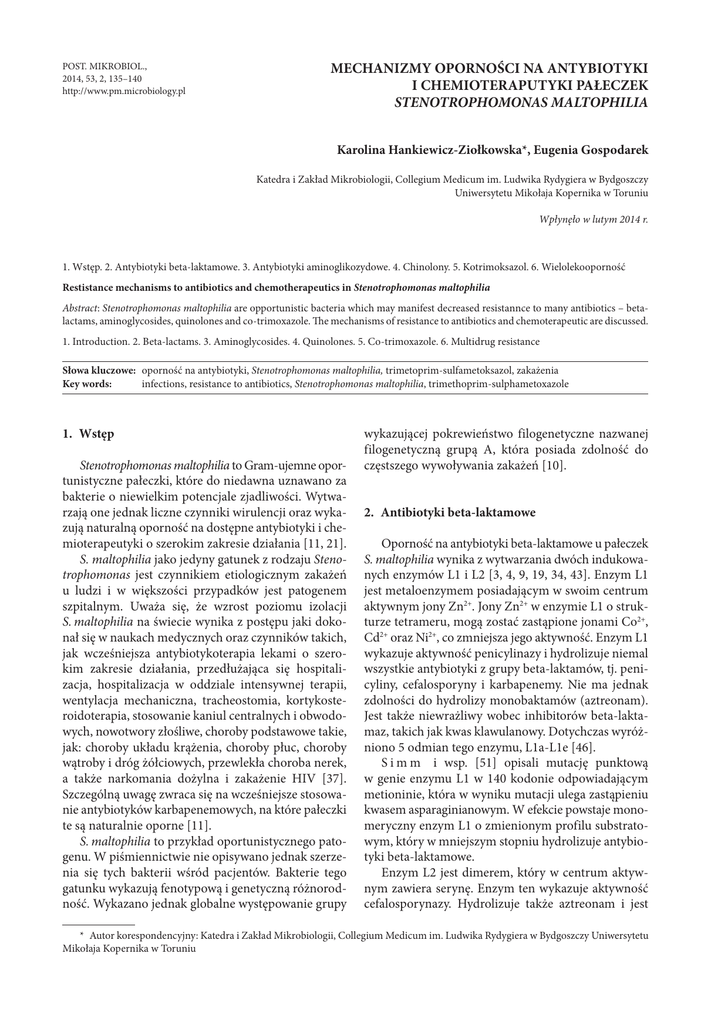 POST. MIKROBIOL., 2014, 53, 2, 135–140 http://www.pm.microbiology.pl MECHANIZMY OPORNOŚCI NA ANTYBIOTYKI I CHEMIOTERAPUTYKI PAŁECZEK STENOTROPHOMONAS MALTOPHILIA Karolina Hankiewicz-Ziołkowska*, Eugenia Gospodarek Katedra i Zakład Mikrobiologii, Collegium Medicum im. Ludwika Rydygiera w Bydgoszczy Uniwersytetu Mikołaja Kopernika w Toruniu Wpłynęło w lutym 2014 r. 1. Wstęp. 2. Antybiotyki beta-laktamowe. 3. Antybiotyki aminoglikozydowe. 4. Chinolony. 5. Kotrimoksazol. 6. Wielolekooporność Restistance mechanisms to antibiotics and chemotherapeutics in Stenotrophomonas maltophilia Abstract: Stenotrophomonas maltophilia are opportunistic bacteria which may manifest decreased resistannce to many antibiotics – betalactams, aminoglycosides, quinolones and co-trimoxazole. The mechanisms of resistance to antibiotics and chemoterapeutic are discussed. 1. Introduction. 2. Beta-lactams. 3. Aminoglycosides. 4. Quinolones. 5. Co-trimoxazole. 6. Multidrug resistance Słowa kluczowe: oporność na antybiotyki, Stenotrophomonas maltophilia, trimetoprim-sulfametoksazol, zakażenia Key words: infections, resistance to antibiotics, Stenotrophomonas maltophilia, trimethoprim-sulphametoxazole 1. Wstęp Stenotrophomonas maltophilia to Gram-ujemne oportunistyczne pałeczki, które do niedawna uznawano za bakterie o niewielkim potencjale zjadliwości. Wytwarzają one jednak liczne czynniki wirulencji oraz wykazują naturalną oporność na dostępne antybiotyki i chemioterapeutyki o szerokim zakresie działania [11, 21]. S. maltophilia jako jedyny gatunek z rodzaju Stenotrophomonas jest czynnikiem etiologicznym zakażeń u ludzi i w większości przypadków jest patogenem szpitalnym. Uważa się, że wzrost poziomu izolacji S. maltophilia na świecie wynika z postępu jaki dokonał się w naukach medycznych oraz czynników takich, jak wcześniejsza antybiotykoterapia lekami o szerokim zakresie działania, przedłużająca się hospitalizacja, hospitalizacja w oddziale intensywnej terapii, wentylacja mechaniczna, tracheostomia, kortykosteroidoterapia, stosowanie kaniul centralnych i obwodowych, nowotwory złośliwe, choroby podstawowe takie, jak: choroby układu krążenia, choroby płuc, choroby wątroby i dróg żółciowych, przewlekła choroba nerek, a także narkomania dożylna i zakażenie HIV [37]. Szczególną uwagę zwraca się na wcześniejsze stosowanie antybiotyków karbapenemowych, na które pałeczki te są naturalnie oporne [11]. S. maltophilia to przykład oportunistycznego patogenu. W piśmiennictwie nie opisywano jednak szerzenia się tych bakterii wśród pacjentów. Bakterie tego gatunku wykazują fenotypową i genetyczną różnorodność. Wykazano jednak globalne występowanie grupy wykazującej pokrewieństwo filogenetyczne nazwanej filogenetyczną grupą A, która posiada zdolność do częstszego wywoływania zakażeń [10]. 2. Antibiotyki beta-laktamowe Oporność na antybiotyki beta-laktamowe u pałeczek S. maltophilia wynika z wytwarzania dwóch indukowanych enzymów L1 i L2 [3, 4, 9, 19, 34, 43]. Enzym L1 jest metaloenzymem posiadającym w swoim centrum aktywnym jony Zn2+. Jony Zn2+ w enzymie L1 o strukturze tetrameru, mogą zostać zastąpione jonami Co2+, Cd2+ oraz Ni2+, co zmniejsza jego aktywność. Enzym L1 wykazuje aktywność penicylinazy i hydrolizuje niemal wszystkie antybiotyki z grupy beta-laktamów, tj. penicyliny, cefalosporyny i karbapenemy. Nie ma jednak zdolności do hydrolizy monobaktamów (aztreonam). Jest także niewrażliwy wobec inhibitorów beta-laktamaz, takich jak kwas klawulanowy. Dotychczas wyróżniono 5 odmian tego enzymu, L1a-L1e [46]. S i m m i wsp. [51] opisali mutację punktową w genie enzymu L1 w 140 kodonie odpowiadającym metioninie, która w wyniku mutacji ulega zastąpieniu kwasem asparaginianowym. W efekcie powstaje monomeryczny enzym L1 o zmienionym profilu substratowym, który w mniejszym stopniu hydrolizuje antybiotyki beta-laktamowe. Enzym L2 jest dimerem, który w centrum aktywnym zawiera serynę. Enzym ten wykazuje aktywność cefalosporynazy. Hydrolizuje także aztreonam i jest * Autor korespondencyjny: Katedra i Zakład Mikrobiologii, Collegium Medicum im. Ludwika Rydygiera w Bydgoszczy Uniwersytetu Mikołaja Kopernika w Toruniu 136 KAROLINA HANKIEWICZ-ZIOŁKOWSKA, EUGENIA GOSPODAREK wrażliwy wobec inhibitorów beta-laktamaz [45]. Podatność enzymu L2 jest większa na inhibicję kwasem klawulanowym niż tazobaktamem lub sulbaktamem, jednak nie wykazano korelacji między podatnością na inhibitor beta-laktamaz, a wartością najmniejszego stężenia hamującego (Minimal Inhibitory Concentration, MIC) inhibitora beta-laktamaz. Znane są cztery odmiany tego enzym L2a-L2d. Zarówno enzym L1, jak i L2 kodowane są chromosomalnie i mają charakter enzymów indukowanych. A v i s o n i wsp. [3, 4] w swoich badaniach opisali występowanie genów kodujących obydwa enzymy na plazmidzie wielkości około 200 kpz. Tłumaczy to szybkie narastanie oporności na tą grupę antybiotyków wśród szczepów S. malotophilia. H u a n g i wsp. [26] podkreślają rolę operonu AmpN-AmpG niezbędnego do prawidłowej ekspresji enzymów L1 i L2. Geny ampN i ampG są niezbędne do indukcji beta-laktamaz. H u a n g i wsp. [28] opisali także krytyczne znaczenie obecności beta-N-acetylogukozaminidazy (NagZ) kodowanej przez gen nagZ w procesie derepresji enzymu ampC (ampC – Cephalosporinase, chromosomalna cefalosporynaza). Ekspresja genu nagZ ma charakter konstytutywny. 3. Antybiotyki aminoglikozydowe Szczepy S. maltophilia wykazują naturalną oporność na wysokie stężenia antybiotyków aminoglikozydowych, pomimo tego, że większość Gram-ujemnych pałeczek znajduje się w zakresie ich działania. Opisano wiele mechanizmów oporności na tą grupę antybiotyków takich, jak mutacje w obrębie podjednostki 16S rRNA, enzymatyczne modyfikacje podjednostki 16S rRNA, aktywne wypompowywanie aminoglikozydów z komórki bakteryjnej czy modyfikacje 