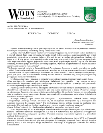 Placówka z certyfikatem ISO 9001:2000 z akredytacją Łódzkiego Kuratora Oświaty ANNA STRÓśEWSKA Szkoła Podstawowa Nr 2 w Skierniewicach EDUKACJA DOBREGO SERCA „Dokądkolwiek idziesz, Kieruj się zawsze sercem!” Konfucjusz Pojęcie „edukacja dobrego serca” pokazuje wyraźnie, Ŝe oprócz wiedzy człowiek potrzebuje równieŜ kluczowych kompetencji z dziedziny emocji i znajomości ludzi. „Młody człowiek, który został wychowany w szczęśliwej prostocie, motywowany jest do delikatnych i czułych odczuć. Jego serce poruszają cierpienia innych ludzi; ogarnia go ogromna radość, gdy widzi przyjaciela; obejmuje go wzruszony i płacze. Wstydzi się, gdy wywołuje niezadowolenie i Ŝałuje, gdy kogoś urazi. Kiedy gorąca krew wywołuje w nim złość, rozpoznamy całą dobroć jego serca w przypływie Ŝalu. Jego wzburzenie wygasa, jego duma chyli czoła przed popełnionym błędem. Gdy on sam zostanie obraŜony, wybacza juŜ po pierwszych słowach przeprosin. Wybacza niesprawiedliwość innych tak samo szczerze, jak naprawia swoją własną”. Tak bogate serce-jak opisuje je francuski filozof Jean-Jacques Rousseau w swojej powieści, nie spada z nieba! Emocjonalne zdolności nie są wrodzone; rozwijają się krok po kroku w codziennych kontaktach z innymi ludźmi od najwcześniejszego dzieciństwa do późnej starości. Uczucia tworzą tory dla pociągu, jakim jest Ŝycie. Jeśli w dzieciństwie zostaną ułoŜone szerokie i stabilne tory, wtedy wykolejenie się pociągu jest mało prawdopodobne. Myślenie, odczuwanie i nauka są ze sobą nierozerwalnie powiązane, tworzą związek na całe Ŝycie. „Przy pozytywnych emocjach cała inteligencja funkcjonuje bez zarzutów i jest gotowa na nowe doświadczenia. Negatywne emocje przerywają ten proces, hamują myślenie i powodują stałe powracanie w zwolnionym tempie myśli obciąŜonych bólem”. Neurolog Antonio Damasio wraz z kolegami udowodnił w swoich sławnych eksperymentach, Ŝe przy chorobliwym zaburzeniu emocji niemoŜliwe jest racjonalne zachowanie i nauka. PoniewaŜ emocje są rejestrowane fizycznie, ciało stanowi jakby miernik i probierz dla myślenia. Uczucia nie przeszkadzają więc w myśleniu, wręcz przeciwnie: dopiero nasza zdolność emocjonalnego zabarwiania doświadczeń umoŜliwia rozsądne myślenie! WaŜnego odkrycia, tym razem dla nauczycieli i wychowawców, dokonał badacz mózgu z Magdeburga, Henning Scheich. Stwierdził on, Ŝe umiejętność zachwycania się u nauczyciela ma ogromne znaczenie dla procesu nauki:” Dla niedojrzałego jeszcze mózgu wzorce są niezbędne jako orientacja. RównieŜ zachwyt działa dyscyplinująco - chcemy przecieŜ dorównać wzorcowi”. Roman Rolland twierdził, Ŝe: „Inteligencja myślenia jest niczym bez inteligencji serca” Przez długie okresy XX w. w naukowych laboratoriach uczucia były zakazane jako zbyt subiektywne, rozmyte i absolutnie sprzeczne z rozsądkiem. Ale teza ta w historii wciąŜ była poddawana w wątpliwość przez wielu filozofów, pedagogów i poetów. Wyraźnie pokazuje to poniŜsza wyprawa w „ przeszłość edukacji dobrego serca”. „Serce ma powody, o których rozsądek nic nie wie”, poddawał pod rozwagę juŜ w XVII w. Francuski matematyk i filozof Blaise Pascal, gdy walczył o prawo do intuicyjnej pewności. Pascal wierzył, Ŝe tylko powody serca, a nie rozsądku, mogą zaprowadzić błądzącego i wątpiącego człowieka do wiedzy i zrozumienia. Ojciec liberalizmu naukowego, filozof John Locke radził: „Wszystko, co uczynicie dla korzyści edukacji umysłu i serca swojego syna, objawi swoją prawdziwą dobroć, nawet jeśli przyczyni się do zmniejszenia posiadanych przez niego dóbr”. Kilka dziesięcioleci później francuski poeta i moralista Luc de Clapier Vauvenargues trafnie to sformułował: „Wielkie myśli pochodzą z serca”. W połowie XVIII w. francusko-szwajcarski filozof Jean - Jacques Rousseau posługiwał się takimi pojęciami, jak education du coeur albo „edukacja człowieka”. W swojej powieści przedstawia ideał bliskiego natury, pozbawionego dogmatów wychowania, w trakcie którego naturalne zdolności dziecka powinny się swobodnie rozwijać. A do tego naleŜy oczywiście równieŜ prawo do wolności uczuć i pasji. Pedagog Johann Heinrich Pestalozzi domagał się: „Pierwsza lekcja dziecka nigdy nie jest sprawą głowy, nigdy nie jest ona sprawą rozsądku- odwiecznie jest sprawą zmysłów i serca”. Pestalozzi podkreślał, Ŝe poszczególne kroki w nauce oraz rozwój osobowości dziecka są bezpośrednio uzaleŜnione od umiejętności obcowania z innymi ludźmi u wychowawcy i nauczyciela. Przywódca indyjskiego ruchu wolności, Mahatma Gandhi miał całkowitą rację: za pomocą samego rozsądku, mądrości i bystrości umysłu niewiele zyskujemy. Aby wyzwolić nasz wewnętrzny rozwój i zewnętrzne przemiany, tak samo duŜe znaczenie ma energia serca. KaŜda przemiana zaczyna się od optymizmu i przede wszystkim od nas samych. Jeśli chcesz zaprowadzić porządek w kraju, Musisz najpierw zaprowadzić porządek w prowincjach. Jeśli chcesz zaprowadzić porządek w prowincjach, Musisz zaprowadzić porządek w miastach. Jeśli chcesz zaprowadzić porządek w miastach, Musisz zaprowadzić porządek w rodzinach. Jeśli chcesz zaprowadzić porządek w rodzinach, Musisz zaprowadzić porządek we własnej rodzinie. Jeśli chcesz zaprowadzić porządek w swojej rodzinie, Musisz doprowadzić siebie do porządku. Konfucjusz Co więc pedagodzy powinni wziąć sobie do serca? - Uczucia i myślenie nie wykluczają siebie nawzajem. Wszystkie informacje docierające do narządów zmysłów są emocjonalnie zabarwione i oceniane. KaŜda informacja równieŜ wywołuje uczucia! Dopiero nasza umiejętność emocjonalnego oznaczania doświadczeń umoŜliwia nam rozsądne myślenie! - Pamięć zapisuje nie tylko rzeczową część danej informacji, ale równieŜ jej emocjonalne zabarwienie. Dlatego te