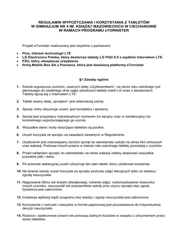 REGULAMIN WYPOŻYCZANIA I KORZYSTANIA Z TABLETÓW W GIMNAZJUM NR 4 IM. KSIĄŻĄT MAZOWIECKICH W CIECHANOWIE W RAMACH PROGRAMU eTORNISTER Projekt eTornister realizowany jest wspólnie z partnerami: • • • • Plus, liderem technologii LTE LG Electronics Polska, który dostarcza tablety LG PAD 8.0 z szybkim Internetem LTE. PZU, który ubezpiecza urządzenia firmą Mobile Box SA z Poznania, która jest dostawcą platformy eTornister §1 Zasady ogólne 1. Szkoła wypożycza uczniom, zwanymi dalej „Użytkownikami”, na okres roku szkolnego (od pierwszego do ostatniego dnia zajęć szkolnych) tablety marki LG wraz z akcesoriami. Tablety łączą się z Internetem LTE. 2. Tablet zwany dalej „sprzętem” jest własnością szkoły. 3. Sprzęt, który otrzymuje uczeń, jest kompletny i sprawny. 4. Sprzęt jest przypisany indywidualnym numerem (nr seryjny oraz nr ewidencyjny) do konkretnego wypożyczającego go ucznia. 5. Wszystkie dane i kody dotyczące tabletów są poufne. 6. Uczeń korzysta ze sprzętu na zasadach zawartych w Regulaminie. 7. Użytkownik jest zobowiązany zwrócić sprzęt do sekretariatu szkoły na okres ferii zimowych oraz wakacji. Podczas innych przerw w trakcie roku szkolnego tablety pozostają u uczniów. 8. Przed oddaniem sprzętu do sekretariatu na okres wakacji należy skasować wszystkie prywatne pliki i dane. 9. Po przerwie wakacyjnej uczeń otrzymuje ten sam tablet, który użytkował wcześniej. 10. Na terenie szkoły uczeń korzysta ze sprzętu podczas zajęć lekcyjnych tylko za wiedzą i zgodą nauczyciela. 11. Nagrywanie (filmu lub ścieżki dźwiękowej), robienie zdjęć, wykorzystywanie wizerunku innych uczniów, nauczycieli lub pracowników szkoły przy użyciu sprzętu bez zgody Dyrektora jest zabronione. 12. Instalacja aplikacji bądź programu bez wiedzy i zgody nauczyciela jest zabroniona. 13. Korzystanie z ćwiczeń i zeszytów w formie papierowej jest pozostawione do indywidualnej decyzji nauczyciela. 14. Rodzice i opiekunowie prawni nie ponoszą żadnych kosztów w związku z otrzymaniem przez dzieci tabletów. 15. Koszty związane z naprawą usterek nieobjętych gwarancją ponosi ubezpieczyciel. 16. Decyzja o zakupie podręczników w formie tradycyjnej na kolejny rok szkolny zależy od rodziców. § 2 Zasady użytkowania 1. Do szkoły Użytkownik przynosi tablet zawsze naładowany w minimum 80%. 2. Użytkownik zobowiązany jest do dbania o sprzęt. Nie może świadomie narażać sprzętu, baterii, ładowarki na ostre wstrząsy, upadek lub inne czynności mogące spowodować uszkodzenie sprzętu: • Nie wolno narażać sprzętu na działanie zbyt wysokich lub zbyt niskich temperatur. • Nie wolno uderzać, rzucać, wyginać czy poddawać sprzętu stałemu naciskowi. • Należy dbać o to, aby sprzęt był suchy - nie może mieć kontaktu z wodą czy parą wodną; nie należy także korzystać ze sprzętu mając mokre ręce. Takie zachowanie może doprowadzić do zwarcia lub korozji części wewnętrznych, co może spowodować awarię. • Podczas przerw należy korzystać ze sprzętu jedynie przy klasopracowni. Użytkowanie w czasie chodzenia po korytarzu, schodach czy boisku szkolnym jest zabronione. 3. Zabronione jest wprowadzanie (dodawanie lub usuwanie) przez użytkowników jakichkolwiek zmian w oprogramowaniu i konfiguracji systemów operacyjnych. 4. Instalowanie nowych aplikacji czy wprowadzania jakichkolwiek zmian mogą dokonać tylko administratorzy wyznaczeni przez Dyrektora Szkoły. 5. Uczeń jest zobowiązany do śledzenia na bieżąco aplikacji App4Gim, gdzie zamieszczane są informacje o zastępstwach bądź innych zmianach w planie klas pierwszych. 6. Zabronione jest wprowadzanie tabletu bez uzasadnionej potrzeby w stan awaryjny, ponieważ powoduje opóźnienie w pracy systemu, a co za tym idzie w konsekwencji może prowadzić do uszkodzenia sprzętu. 7. Zabronione jest zmienianie ustawień fabrycznych. 8. Wszelkie problemy z działaniem tabletu bądź problemy z łącznością z Internetem należy zgłosić do jednego z administratorów: • p. Agnieszki Wendy • p. Anny Szymańczyk • p. Patryka Wądołowskiego • p. Piotra Świercza 9. W razie awarii mechanicznej użytkownik zobowiązany jest do jak najszybszego zgłoszenia zaistniałego faktu do p. Barbary Derbin lub p. Wioletty Kazimierskiej, które przeprowadzą czynności związane z ubezpieczeniem, a tym samym naprawą sprzętu.