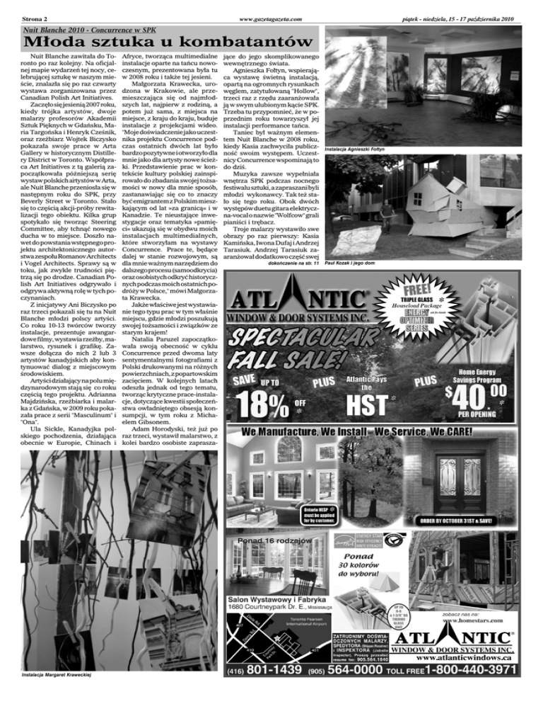 www.gazetagazeta.com Strona 2 piątek - niedziela, 15 - 17 października 2010 Nuit Blanche 2010 - Concurrence w SPK Młoda sztuka u kombatantów Nuit Blanche zawitała do Toronto po raz kolejny. Na oficjalnej mapie wydarzeń tej nocy, celebrującej sztukę w naszym mieście, znalazła się po raz czwarty wystawa zorganizowana przez Canadian Polish Art Initiatives. Zaczęło się jesienią 2007 roku, kiedy trójka artystów, dwoje malarzy profesorów Akademii Sztuk Pięknych w Gdańsku, Maria Targońska i Henryk Cześnik, oraz rzeźbiarz Wojtek Biczysko pokazała swoje prace w Arta Gallery w historycznym Distillery District w Toronto. Współpraca Art Initiatives z tą galerią zapoczątkowała późniejszą serię wystaw polskich artystów w Arta, ale Nuit Blanche przeniosła się w następnym roku do SPK, przy Beverly Street w Toronto. Stało się to częścią akcji-próby rewitalizacji tego obiektu. Kilka grup spotykało się tworząc Steering Committee, aby tchnąć nowego ducha w to miejsce. Doszło nawet do powstania wstępnego projektu architektonicznego autorstwa zespołu Romanov Architects i Vogel Architects. Sprawy są w toku, jak zwykle trudności piętrzą się po drodze. Canadian Polish Art Initiatives odgrywało i odgrywa aktywną rolę w tych poczynaniach. Z inicjatywy Ani Biczysko po raz trzeci pokazali się tu na Nuit Blanche młodzi polscy artyści. Co roku 10-13 twórców tworzy instalacje, prezentuje awangardowe filmy, wystawia rzeźby, malarstwo, rysunek i grafikę. Zawsze dołącza do nich 2 lub 3 artystów kanadyjskich aby kontynuować dialog z miejscowym środowiskiem. Artyści działający na polu międzynarodowym stają się; co roku częścią tego projektu. Adrianna Majdzińska, rzeźbiarka i malarka z Gdańska, w 2009 roku pokazała prace z serii "Masculinum" i "Ona". Ula Sickle, Kanadyjka polskiego pochodzenia, działająca obecnie w Europie, Chinach i Instalacja Margaret Kraweckiej Afryce, tworząca multimedialne instalacje oparte na tańcu nowoczesnym, prezentowana była tu w 2008 roku i także tej jesieni. Małgorzata Krawecka, urodzona w Krakowie, ale przemieszczająca się od najmłodszych lat, najpierw z rodziną, a potem już sama, z miejsca na miejsce, z kraju do kraju, buduje instalacje z projekcjami wideo. "Moje doświadczenie jako uczestnika projektu Concurrence podczas ostatnich dwóch lat było bardzo pozytywne i otworzyło dla mnie jako dla artysty nowe ścieżki. Przedstawienie prac w kontekście kultury polskiej zainspirowało do zbadania swojej tożsamości w nowy dla mnie sposób, zastanawiając się co to znaczy być emigrantem z Polskim mieszkającym od lat »za granicą« i w Kanadzie. Te nieustające inwestygacje oraz tematyka »pamięci« ukazują się w obydwu moich instalacjach multimedialnych, które stworzyłam na wystawy Concurrence.; Prace te, będące dalej w stanie rozwojowym, są dla mnie ważnym narzędziem do dalszego procesu (samoodkrycia) oraz osobistych odkryć historycznych podczas moich ostatnich podróży w Polsce," mówi Małgorzata Krawecka. Jakże właściwe jest wystawianie tego typu prac w tym właśnie miejscu, gdzie młodzi poszukują swojej tożsamości i związków ze starym krajem! Natalia Paruzel zapoczątkowała swoją obecność w cyklu Concurrence przed dwoma laty sentymentalnymi fotografiami z Polski drukowanymi na różnych powierzchniach, z popartowskim zacięciem. W kolejnych latach odeszła jednak od tego tematu, tworząc krytyczne prace-instalacje, dotyczące kwestii społeczeństwa owładniętego obsesją konsumpcji, w tym roku z Michaelem Gibsonem. Adam Horodyski, też już po raz trzeci, wystawił malarstwo, z kolei bardzo osobiste zaprasza- jące do jego skomplikowanego wewnętrznego świata. Agnieszka Fołtyn, wspierająca wystawę świetną instalacją, opartą na ogromnych rysunkach węglem, zatytułowaną "Hollow", trzeci raz z rzędu zaaranżowała ją w swym ulubionym kącie SPK. Trzeba tu przypomnieć, że w poprzednim roku towarzyszył jej instalacji performance tańca. Taniec był ważnym elementem Nuit Blanche w 2008 roku, kiedy Kasia zachwyciła publiczność swoim występem. Uczestnicy Concurrence wspominają to do dziś. Muzyka zawsze wypełniała wnętrza SPK podczas nocnego festiwalu sztuki, a zapraszani byli młodzi; wykonawcy. Tak też stało się tego roku. Obok dwóch występów duetu gitara elektryczna-vocal o nazwie "Wolfcow" grali pianiści i trębacz. Troje malarzy wystawiło swe obrazy po raz pierwszy: Kasia Kamińska, Iwona Dufaj i Andrzej Tarasiuk. Andrzej Tarasiuk zaaranżował dodatkowo część swej dokończenie na str. 11 Instalacja Agnieszki Fołtyn Paul Kozak i jego dom