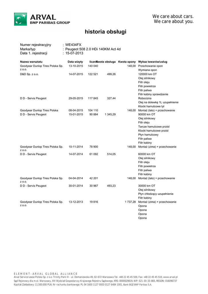We care about cars. We care about you. historia obsługi Numer rejestracyjny Marka/typ Data 1. rejestracji : WE434FX : Peugeot 508 2.0 HDi 140KM Act 4d : 15-07-2013 Nazwa warsztatu Goodyear Dunlop Tires Polska Sp. z o.o. Data wizyty 13-10-2015 licznik Kwota obsługa Kwota opony Wykaz towarów/usług 140 040 148,00 Przechowanie opon Wymiana opon 122 521 499,26 120000 km OT Olej silnikowy Filtr oleju Filtr powietrza Filtr paliwa Filtr kabiny sprawdzenie 117 845 327,44 Robocizna Olej na dolewkę 1L uzupełnienie Klocki hamulcowe tył 104 110 148,00 Montaż (lato) + przechowanie 90 884 1 345,29 90000 km OT Olej silnikowy Filtr oleju Tarcze hamulcowe przód Klocki hamulcowe przód Płyn hamulcowy Filtr paliwa Filtr kabiny 78 900 148,00 Montaż (zima) + przechowanie D&D Sp. z o.o. 14-07-2015 D D - Servis Peugeot 29-05-2015 Goodyear Dunlop Tires Polska D D - Servis Peugeot 08-04-2015 15-01-2015 Goodyear Dunlop Tires Polska Sp. z o.o. D D - Servis Peugeot 10-11-2014 14-07-2014 61 092 Goodyear Dunlop Tires Polska Sp. z o.o. D D - Servis Peugeot 04-04-2014 42 201 30-01-2014 30 967 Goodyear Dunlop Tires Polska Sp. z o.o. 13-12-2013 19 816 ELEMENT-ARVAL GLOBAL ALLIANCE 514,05 60000 km OT Olej silnikowy Filtr oleju Filtr powietrza Filtr paliwa Filtr kabiny 148,00 Montaż (lato) + przechowanie 493,23 30000 km OT Olej silnikowy Płyn chłodzący uzupełnienie Filtr kabiny 1 737,28 Montaż (zima) + przechowanie Opona Opona Opona Opona Arval Service Lease Polska Sp. z o.o. Trinity Park III - ul. Domaniewska 49, 02-672 Warszawa Tel. +48 22 45 45 500, Fax: +48 22 45 45 510, www.arval.pl Sąd Rejonowy dla m.st. Warszawy, XIII Wydział Gospodarczy Krajowego Rejestru Sądowego, KRS: 0000029819, NIP: 521-30-33-865, REGON: 016096737 Kapitał Zakładowy: 11.500.000 PLN; Nr rachunku bankowego: PL 04 1600 1127 0003 0127 6484 1001, Bank BGŻ BNP Paribas S.A.