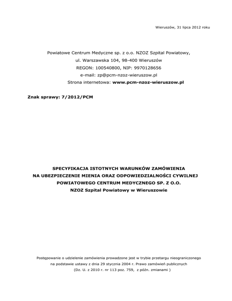 Wieruszów, 31 lipca 2012 roku Powiatowe Centrum Medyczne sp. z o.o. NZOZ Szpital Powiatowy, ul. Warszawska 104, 98-400 Wieruszów REGON: 100540800, NIP: 9970128656 e-mail: [email protected] Strona internetowa: www.pcm-nzoz-wieruszow.pl Znak sprawy: 7/2012/PCM SPECYFIKACJA ISTOTNYCH WARUNKÓW ZAMÓWIENIA NA UBEZPIECZENIE MIENIA ORAZ ODPOWIEDZIALNOŚCI CYWILNEJ POWIATOWEGO CENTRUM MEDYCZNEGO SP. Z O.O. NZOZ Szpital Powiatowy w Wieruszowie Postępowanie o udzielenie zamówienia prowadzone jest w trybie przetargu nieograniczonego na podstawie ustawy z dnia 29 stycznia 2004 r. Prawo zamówień publicznych (Dz. U. z 2010 r. nr 113 poz. 759, z późn. zmianami ) ) TRYB UDZIELENIA ZAMÓWIENIA Postępowanie prowadzone jest w trybie przetargu nieograniczonego na podstawie ustawy z dnia 29 stycznia 2004 r. Prawo zamówień publicznych (Dz. U. z 2010 r. nr 113 poz. 759, z późn. zmianami ) o wartości szacunkowej poniŜej progów określonych w przepisach wydanych na podstawie art. 11 ust. 8 Ustawy PZP. Podstawa prawna wyboru trybu udzielenia zamówienia publicznego - art. 10 ust. 1 oraz art. 39-46 Ustawy PZP. Postępowanie prowadzone przy udziale brokera PWS Konstanta SA wpisana do rejestru przedsiębiorców prowadzonego przez Sąd Rejonowy w Bielsku Białej VIII Wydział Gospodarczy Krajowego Rejestru Sądowego pod nr 0000073190. PWS Konstanta SA. – broker ubezpieczeniowy: Zezwolenie Ministra Finansów nr 516 z dnia 31 marca 1995r., potwierdzone decyzją Państwowego Urzędu Nadzoru Ubezpieczeń z dnia 25 czerwca 1997 r. I. ZAMAWIAJĄCY (UBEZPIECZAJĄCY, UBEZPIECZONY) 1. Pełna nazwa: Powiatowe Centrum Medyczne sp. z o.o. NZOZ Szpital Powiatowy, 2. Dokładny adres siedziby: ul. Warszawska 104, 98-400 Wieruszów 3. Telefon / Fax: Tel./fax: (62) 784 55 02, 4. Reprezentacja: Prezes zarządu: Eunika Adamus 5. Numer NIP – 997-01-28-656 6. Numer Regon – 100540800 7. Strona internetowa - www.pcm-nzoz-wieruszow.pl 8. Adres email – [email protected] II. PRZEDMIOT ZAMÓWIENIA 1. Przedmiotem zamówienia jest ubezpieczenie Powiatowego Centrum Medycznego Sp. z o.o NZOZ Szpital Powiatowy w Wieruszowie o wspólnym Słowniku Zamówienia (CPV): 66510000 – 8 Usługi ubezpieczeniowe, w poniŜszym zakresie: a. Ubezpieczenie mienia od ognia i innych zdarzeń losowych; b. Ubezpieczenie mienia od kradzieŜy z włamaniem i rabunku; c. Ubezpieczenie sprzętu elektronicznego od wszystkich ryzyk; d. Obowiązkowe ubezpieczenie odpowiedzialności cywilnej świadczeniodawcy udzielającego świadczeń opieki zdrowotnej; Specyfikacja Istotnych Warunków Zamówienia na ubezpieczenia mienia oraz odpowiedzialności cywilnej Powiatowego Centrum Medycznego Sp. z o.o. NZOZ Szpital Powiatowy w Wieruszowie © PWS Konstanta S.A. 2 e. Dobrowolne ubezpieczenie odpowiedzialności cywilnej podmiotu leczniczego za szkody wyrządzone osobie trzeciej w następstwie udzielania świadczeń zdrowotnych albo niezgodnego z prawem zaniechania udzielania świadczeń zdrowotnych w związku z wykonywaniem działalności leczniczej f. Dobrowolne ubezpieczenie odpowiedzialności cywilnej z tytułu prowadzonej działalności i z tytułu posiadanego mienia. 2. Umowy ubezpieczenia będą zawarte i wykonywane przy udziale i za pośrednictwem brokera ubezpieczeniowego PWS Konstanta SA z siedzibą w Bielsku-Białej przy ul. Warszawska 153. 3. Wszelkie informacje zawarte w niniejszej Specyfikacji Istotnych Warunków Zamówienia przeznaczone są wyłącznie do przygotowania oferty i w Ŝadnym wypadku nie powinny być wykorzystane w innym celu ani udostępniane osobom trzecim nieuczestniczącym w postępowaniu, chyba Ŝe jest to konieczne i niezbędne do udziału w postępowaniu i przygotowania oferty. 4. Szczegółowy opis przedmiotu zamówienia zawarty jest w Załączniku nr 1 do SIWZ. 5. TERMIN WYKONANIA ZAMÓWIENIA Wymagany termin realizacji zamówienia obejmuje okres ubezpieczenia od 01.09.2012 do 31.08.2013 6. WARUNKI UDZIAŁU W POSTĘPOWANIU ORAZ OPIS SPOSOBU DOKONYWANIA OCENY SPEŁNIENIA TYCH WARUNKÓW O udzielenie zamówienia, określonego w niniejszej specyfikacji mogą ubiegać się Wykonawcy, którzy spełniają warunki, dotyczące: 1. Posiadania uprawnień do wykonywania określonej działalności lub czynności, jeŜeli przepisy prawa nakładają obowiązek posiadania takich uprawnień, tj. w szczególności: a) są uprawnieni do uczestnictwa w obrocie prawnym na podstawie odrębnych przepisów, b) prowadzą działalność ubezpieczeniową w myśl ustawy z dnia 22 maja 2003 roku o działalności ubezpieczeniowej (Dz. U. z 2003 roku Nr 124, poz. 1151), co najmniej w zakresie toŜsamym z przedmiotem niniejszego zamówienia, 2. Posiadania wiedzy i doświadczenia do wykonania zamówienia Za spełnienie warunku zamawiający uzna wykazanie się min. 1 usługą polegającą na ubezpieczeniu odpowiedzialności cywilnej z sumą gwarancyjną co najmniej 400 000,00 zł. Spełnienie powyŜszego warunku udziału w postępowaniu naleŜy potwierdzić w oświadczeniuZałącznik nr 3. 3. Dysponowania odpowiednim potencjałem technicznym oraz osobami zdolnymi do wykonania zamówienia, tj.: są w stanie zapewnić bieŜącą obsługę, szybką reakcję w przypadku zaistnienia szkody i sprawną jej likwidację oraz dysponują odpowiednim zapleczem personalnym. Spełnienie powyŜszego warunku udziału w postępowaniu naleŜy potwierdzić w oświadczeniu - Załącznik nr 3. 4. Sytuacji ekonomicznej i finansowej, tj. w szczególności: Specyfikacja Istotnych Warunków Zamówienia na ubezpieczenia mienia oraz odpowiedzialności cywilnej Powiatowego Centrum Medycznego Sp. z o.o. NZOZ Szpital Powiatowy w Wieruszowie © PWS Konstanta S.A. 3 a) posiadają, zgodnie z art. 154 ustawy z dnia 22 maja 2003 roku o działalności ubezpieczeniowej, na dzień 30.12.2011 roku wskaźnik pokrycia rezerw technicznoubezpieczeniowych aktywami co najmniej 100 %. b) posiadają, zgodnie z art. 146 ustawy z dnia 22 maja 2003 roku o działalności ubezpieczeniowej, na dzień 30.12.2011 