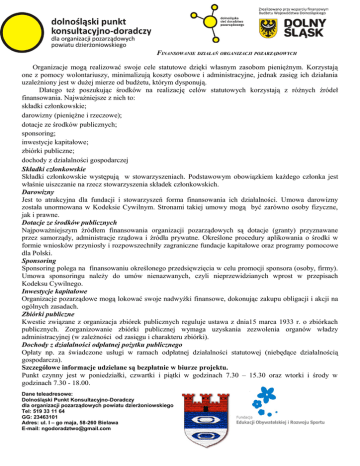 FINANSOWANIE DZIAŁAŃ ORGANIZACJI POZARZĄDOWYCH Organizacje mogą realizować swoje cele statutowe dzięki własnym zasobom pieniężnym. Korzystają one z pomocy wolontariuszy, minimalizują koszty osobowe i administracyjne, jednak zasięg ich działania uzależniony jest w dużej mierze od budżetu, którym dysponują. Dlatego też poszukując środków na realizację celów statutowych korzystają z różnych źródeł finansowania. Najważniejsze z nich to: składki członkowskie; darowizny (pieniężne i rzeczowe); dotacje ze środków publicznych; sponsoring; inwestycje kapitałowe; zbiórki publiczne; dochody z działalności gospodarczej Składki członkowskie Składki członkowskie występują w stowarzyszeniach. Podstawowym obowiązkiem każdego członka jest właśnie uiszczanie na rzecz stowarzyszenia składek członkowskich. Darowizny Jest to atrakcyjna dla fundacji i stowarzyszeń forma finansowania ich działalności. Umowa darowizny została unormowana w Kodeksie Cywilnym. Stronami takiej umowy mogą być zarówno osoby fizyczne, jak i prawne. Dotacje ze środków publicznych Najpoważniejszym źródłem finansowania organizacji pozarządowych są dotacje (granty) przyznawane przez samorządy, administracje rządowa i źródła prywatne. Określone procedury aplikowania o środki w formie wniosków przyniosły i rozpowszechniły zagraniczne fundacje kapitałowe oraz programy pomocowe dla Polski. Sponsoring Sponsoring polega na finansowaniu określonego przedsięwzięcia w celu promocji sponsora (osoby, firmy). Umowa sponsoringu należy do umów nienazwanych, czyli nieprzewidzianych wprost w przepisach Kodeksu Cywilnego. Inwestycje kapitałowe Organizacje pozarządowe mogą lokować swoje nadwyżki finansowe, dokonując zakupu obligacji i akcji na ogólnych zasadach. Zbiórki publiczne Kwestie związane z organizacja zbiórek publicznych reguluje ustawa z dnia15 marca 1933 r. o zbiórkach publicznych. Zorganizowanie zbiórki publicznej wymaga uzyskania zezwolenia organów władzy administracyjnej (w zależności od zasięgu i charakteru zbiórki). Dochody z działalności odpłatnej pożytku publicznego Opłaty np. za świadczone usługi w ramach odpłatnej działalności statutowej (niebędące działalnością gospodarcza). Szczegółowe informacje udzielane są bezpłatnie w biurze projektu. Punkt czynny jest w poniedziałki, czwartki i piątki w godzinach 7.30 – 15.30 oraz wtorki i środy w godzinach 7.30 - 18.00. Dane teleadresowe: Dolnośląski Punkt Konsultacyjno-Doradczy dla organizacji pozarządowych powiatu dzierżoniowskiego Tel: 519 33 11 64 GG: 23463101 Adres: ul. I – go maja, 58-260 Bielawa E-mail: [email protected]