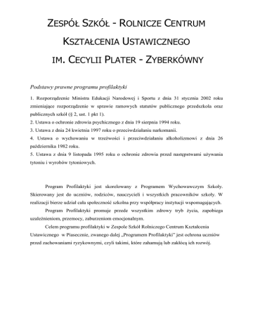 ZESPÓŁ SZKÓŁ - ROLNICZE CENTRUM KSZTAŁCENIA USTAWICZNEGO IM. CECYLII PLATER - ZYBERKÓWNY Podstawy prawne programu profilaktyki 1. Rozporządzenie Ministra Edukacji Narodowej i Sportu z dnia 31 stycznia 2002 roku zmieniające rozporządzenie w sprawie ramowych statutów publicznego przedszkola oraz publicznych szkół (§ 2, ust. 1 pkt 1). 2. Ustawa o ochronie zdrowia psychicznego z dnia 19 sierpnia 1994 roku. 3. Ustawa z dnia 24 kwietnia 1997 roku o przeciwdziałaniu narkomanii. 4. Ustawa o wychowaniu w trzeźwości i przeciwdziałaniu alkoholizmowi z dnia 26 października 1982 roku. 5. Ustawa z dnia 9 listopada 1995 roku o ochronie zdrowia przed następstwami używania tytoniu i wyrobów tytoniowych. Program Profilaktyki jest skorelowany z Programem Wychowawczym Szkoły. Skierowany jest do uczniów, rodziców, nauczycieli i wszystkich pracowników szkoły. W realizacji bierze udział cała społeczność szkolna przy współpracy instytucji wspomagających. Program Profilaktyki promuje przede wszystkim zdrowy tryb życia, zapobiega uzależnieniom, przemocy, zaburzeniom emocjonalnym. Celem programu profilaktyki w Zespole Szkół Rolniczego Centrum Kształcenia Ustawicznego w Piasecznie, zwanego dalej „Programem Profilaktyki” jest ochrona uczniów przed zachowaniami ryzykownymi, czyli takimi, które zahamują lub zakłócą ich rozwój. Szczegółowy plan działań profilaktycznych w roku szkolnym 2010/2011. Działania skierowane do uczniów Zakres Działanie Diagnoza zachowań ryzykownych Profilaktyka (klasy I) Rozdawanie materiałów uzależnień i i ulotek zawierających informacje o nałogu. niedostosowań Rozwieszanie plakatów dotyczących tematu. społecznych Godziny wychowawcze poświęcone nałogowi palenia papierosów (wszystkie klasy) Alkohol – projekcja filmów edukacyjnych o szkodliwości nałogu, dyskusja z młodzieżą, ( wszystkie klasy) Program „Bądź odpowiedzialny” • odpowiedzialność prawna nieletnich i osób dorosłych • agresja w zespole rówieśniczym (wszystkie klasy) Podwyższanie bezpieczeństwa na terenie szkoły - nadzór nauczycieli podczas przerw, - przestrzeganie zapisów Statutu, dotyczących zwolnień uczniów z obowiązkowych zajęć lekcyjnych Osoba Instytucja Termin odpowiedzialna wspomagająca realizacji Pedagog, Poradnia I półrocze psycholog PsychologicznoPedagogiczna Pedagog, Powiatowa Stacja Światowy Dzień bez Papierosa wychowawcy Sanitarnoklas Epidemiologiczna Maj 2009 Pedagog, wychowawcy klas Powiatowa Stacja Wg programów Sanitarnowychowawczych Epidemiologiczna klas Psycholog wychowawcy klas Policja Straż Miejska Kurator sądowy Wg programów wychowawczych klas Nauczyciel dyżurujący, wychowawcy klas, pozostali nauczyciele Policja Straż Miejska Przez cały rok szkolny Jak wyżej Jak wyżej Profilaktyka prozdrowotna Zajęcia integracyjne w formie treningów (klasy I) Podniesienie efektywności nauki własnej poprzez uczenie technik pracy umysłowej Trening umiejętności wychowawczych i komunikacji – kształtowanie u uczniów postawy asertywnej oraz usunięcie blokad komunikacji interpersonalnej Budowanie poczucia własnej wartości – jak poprawić poczucie własnej wartości, mocne strony ucznia Propagowanie aktywności ruchowej – rozgrywki, zawody sportowe Wychowanie do życia w rodzinie Program edukacyjny dla maturzystów „Stres pod kontrolą” Zorganizowanie i przeprowadzenie testu wiedzy na temat HIV i AIDS i na jego podstawie podjęcie działań edukacyjnych. Udział w akcjach honorowego krwiodawstwa (zainteresowani uczniowie pełnoletni) Propagowanie haseł akcji “Różowa Wstążeczka” (klasy II, III liceum i IV technikum ) Pedagog, psycholog Wrzesień 2008 Pedagog Wg programów wychowawczych klas Psycholog Przez cały rok szkolny Pedagog, psycholog Przez cały rok szkolny Nauczyciele wychowania fizycznego, wychowawcy klas Nauczyciel przedmiotu Pedagog GOSiR Powiatowa Stacja Sanitarno- Zgodnie z planami organizatorów zawodów Przez cały rok szkolny I półrocze Epidemiologiczna Pedagog, wychowawcy klas Powiatowa Stacja I półrocze SanitarnoEpidemiologiczna Opiekun PCK Pedagog, pielęgniarka Wg harmonogramu akcji Avon jako ambasador akcji. I póŁrocze Upowszechnianie informacji na temat profilaktyki cewy nerwowej (dziewczęta klas maturalnych) Pielęgniarka Powiatowa Stacja II półrocze SanitarnoEpidemiologiczna Działania skierowane do Rodziców Działanie Spotkania informacyjne – dzień otwarty dla Rodziców Warsztaty umiejętności wychowawczych. dla rodziców Systematyczne informowanie o sukcesach (zapraszanie Rodziców na wszystkie uroczystości szkolne, listy gratulacyjne itp.) Pomoc Rodzicom w rozwiązywaniu problemów wychowawczych Osoba odpowiedzialna Dyrektor Instytucja wspomagająca Psycholog Termin realizacji zgodnie z harmonogramem zgodnie z harmonogramem Przez cały rok szkolny Dyrektor, wychowawcy klas Starostwo Powiatowe Pedagog, wychowawcy klas Centrum Pomocy Rodzinie, PPP Wg potrzeb Osoba odpowiedzialna Instytucja wspomagająca Dyrektor EKO-TUR i inne Termin realizacji zgodnie z harmonogramem Działania skierowane do nauczycieli Działanie Zajęcia w ramach Wewnątrzszkolnego Systemu Doskonalenia Nauczycieli