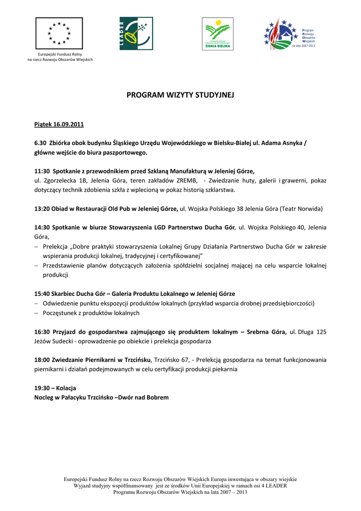 Europejski Fundusz Rolny na rzecz Rozwoju Obszarów Wiejskich PROGRAM WIZYTY STUDYJNEJ Piątek 16.09.2011 6.30 Zbiórka obok budynku Śląskiego Urzędu Wojewódzkiego w Bielsku-Białej ul. Adama Asnyka / główne wejście do biura paszportowego. 11:30 Spotkanie z przewodnikiem przed Szklaną Manufakturą w Jeleniej Górze, ul. Zgorzelecka 1B, Jelenia Góra, teren zakładów ZREMB, - Zwiedzanie huty, galerii i grawerni, pokaz dotyczący technik zdobienia szkła z wplecioną w pokaz historią szklarstwa. 13:20 Obiad w Restauracji Old Pub w Jeleniej Górze, ul. Wojska Polskiego 38 Jelenia Góra (Teatr Norwida) 14:30 Spotkanie w biurze Stowarzyszenia LGD Partnerstwo Ducha Gór, ul. Wojska Polskiego 40, Jelenia Góra, − Prelekcja „Dobre praktyki stowarzyszenia Lokalnej Grupy Działania Partnerstwo Ducha Gór w zakresie wspierania produkcji lokalnej, tradycyjnej i certyfikowanej” − Przedstawienie planów dotyczących założenia spółdzielni socjalnej mającej na celu wsparcie lokalnej produkcji 15:40 Skarbiec Ducha Gór – Galeria Produktu Lokalnego w Jeleniej Górze − Odwiedzenie punktu ekspozycji produktów lokalnych (przykład wsparcia drobnej przedsiębiorczości) − Poczęstunek z produktów lokalnych 16:30 Przyjazd do gospodarstwa zajmującego się produktem lokalnym – Srebrna Góra, ul. Długa 125 Jeżów Sudecki - oprowadzenie po obiekcie i prelekcja gospodarza 18:00 Zwiedzanie Piernikarni w Trzcińsku, Trzcińsko 67, - Prelekcją gospodarza na temat funkcjonowania piernikarni i działań podejmowanych w celu certyfikacji produkcji piekarnia 19:30 – Kolacja Nocleg w Pałacyku Trzcińsko –Dwór nad Bobrem Europejski Fundusz Rolny na rzecz Rozwoju Obszarów Wiejskich Europa inwestująca w obszary wiejskie Wyjazd studyjny współfinansowany jest ze środków Unii Europejskiej w ramach osi 4 LEADER Programu Rozwoju Obszarów Wiejskich na lata 2007 – 2013 Europejski Fundusz Rolny na rzecz Rozwoju Obszarów Wiejskich Sobota 17.09.2011 9: 40 Przyjazd do gospodarstwa zajmującego się produktem lokalnym – Kowalowe Skały, Wrzeszczyn 25, − Oprowadzenie po gospodarstwie − Warsztaty filcowana wełny 13:00 Sklep z lnem przy Pałacu Łomnica i jarmark produktów lokalnych 14:00 Obiad w Restauracji Stara Stajnia w Łomnicy - Restauracja Stara Stajnia to przykład wykorzystania lokalnych zasobów do rozwoju przedsiębiorczości i turystyki 16:00 Chata Walońska w Szklarskiej Porębie, ul. Kołłątaja 12 szklarska Poręba, - Historia walońskich poszukiwaczy skarbów, prezentacja minerałów, które można znaleźć w Karkonoszach oraz opowieści i legendy o Duchu Gór. Chata Walońska jako przykład wykorzystania lokalnych zasobów do działań promocyjnych regionu w kontekście turystycznym. 17:30 Wodospad Szklarki w Szklarskiej Porębie, (Wodospad na terenie Enklawy Karkonoskiego Parku Narodowego obejmującej przełomowy odcinek potoku Szklarka tzw. Wąwóz Szklarki). 18:15 Kolacja, Gospodarstwo Agroturystyczne Farma 69, Kopaniec 69 − Gospodarstwo Agroturystyczne Farma 69 to przykład wykorzystania lokalnych zasobów do rozwoju przedsiębiorczości i turystyki Po kolacji powrót do Bielska-Białej LGD ZIEMIA BIELSKA POKRYWA WSZYSTKIE KOSZTY WIZYTY STUDYJNEJ Europejski Fundusz Rolny na rzecz Rozwoju Obszarów Wiejskich Europa inwestująca w obszary wiejskie Wyjazd studyjny współfinansowany jest ze środków Unii Europejskiej w ramach osi 4 LEADER Programu Rozwoju Obszarów Wiejskich na lata 2007 – 2013