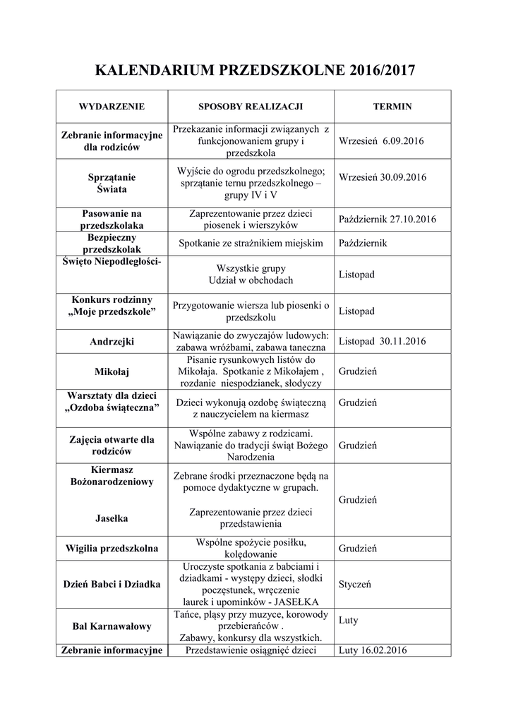 KALENDARIUM PRZEDSZKOLNE 2016/2017