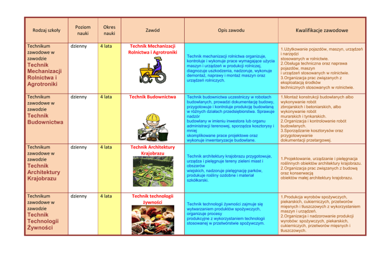 Rodzaj szkoły Technikum zawodowe w zawodzie Poziom nauki dzienny Okres nauki 4 lata Zawód Technik Mechanizacji Rolnictwa i Agrotroniki Technik Mechanizacji Rolnictwa i Agrotroniki Technikum zawodowe w zawodzie dzienny 4 lata Technik Budownictwa dzienny 4 lata Technik Architektury Krajobrazu Technik Budownictwa Technikum zawodowe w zawodzie Technik Architektury Krajobrazu Technikum zawodowe w zawodzie Technik Technologii Żywności dzienny 4 lata Technik technologii żywności Opis zawodu Kwalifikacje zawodowe Technik mechanizacji rolnictwa organizuje, kontroluje i wykonuje prace wymagające użycia maszyn i urządzeń w produkcji rolniczej, diagnozuje uszkodzenia, nadzoruje, wykonuje demontaż, naprawy i montaż maszyn oraz urządzeń rolniczych. 1.Użytkowanie pojazdów, maszyn, urządzeń i narzędzi stosowanych w rolnictwie. 2.Obsługa techniczna oraz naprawa pojazdów, maszyn i urządzeń stosowanych w rolnictwie. 3.Organizacja prac związanych z eksploatacją środków technicznych stosowanych w rolnictwie. Technik budownictwa uczestniczy w robotach budowlanych, prowadzi dokumentację budowy, przygotowuje i kontroluje produkcję budowlaną w różnych działach przedsiębiorstwa. Sprawuje nadzór budowlany w imieniu inwestora lub organu administracji terenowej, sporządza kosztorysy i mniej skomplikowane prace projektowe oraz wykonuje inwentaryzacje budowlane. 1.Montaż konstrukcji budowlanych albo wykonywanie robót zbrojarskich i betoniarskich, albo wykonywanie robót murarskich i tynkarskich. 2.Organizacja i kontrolowanie robót budowlanych. 3.Sporządzanie kosztorysów oraz przygotowywanie dokumentacji przetargowej. Technik architektury krajobrazu przygotowuje, urządza i pielęgnuje tereny zieleni miast i obszarów wiejskich, nadzoruje pielęgnację parków, produkuje rośliny ozdobne i materiał szkółkarski. 1.Projektowanie, urządzanie i pielęgnacja roślinnych obiektów architektury krajobrazu. 2.Organizacja prac związanych z budową oraz konserwacją obiektów małej architektury krajobrazu. Technik technologii żywności zajmuje się wytwarzaniem produktów spożywczych, organizuje procesy produkcyjne z wykorzystaniem technologii stosowanej w przetwórstwie spożywczym. 1.Produkcja wyrobów spożywczych, piekarskich, cukierniczych, przetworów mięsnych i tłuszczowych z wykorzystaniem maszyn i urządzeń. 2.Organizacja i nadzorowanie produkcji wyrobów: spożywczych, piekarskich, cukierniczych, przetworów mięsnych i tłuszczowych. Rodzaj szkoły Poziom nauki dzienny Zasadnicza Szkoła Zawodowa Wielozawodowa Okres nauki Kwalifikacje zawodowe Zawód Opis zawodu mechanik – operator pojazdów i maszyn rolniczych Mechanik-operator pojazdów i maszyn rolniczych obsługuje ciągniki i maszyny rolnicze oraz wykonuje zabiegi agrotechniczne, takie jak: orka, bronowanie, włókowanie, opryski, wysiewanie nawozów sztucznych. 1.Użytkowanie pojazdów, maszyn, urządzeń i narzędzi stosowanych w rolnictwie. 2.Obsługa techniczna oraz naprawa pojazdów, maszyn i urządzeń stosowanych w rolnictwie. rolnik Rolnik prowadzi czynności związane z produkcją roślinną i zwierzęcą przy użyciu urządzeń i środków technicznych. Prowadzenie produkcji rolniczej. Operator maszyn i urządzeń do przetwórstwa tworzyw sztucznych wykonuje maszynowo obróbkę materiałów, której celem jest wyprodukowanie wyrobów i półwyrobów z tworzyw sztucznych. Obsługa maszyn i urządzeń do przetwórstwa tworzyw sztucznych. mechanik – monter maszyn i urządzeń Mechanik-monter maszyn i urządzeń montuje, obsługuje, naprawia i utrzymuje w stałej sprawności technicznej maszyny i urządzenia. Montaż i obsługa maszyn i urządzeń. monter zabudowy i robót wykończeniowych w budownictwie Monter zabudowy i robót wykończeniowych w budownictwie wykonuje montaż systemów suchej zabudowy, roboty malarskotapeciarskie oraz posadzkarskie i okładzinowe. 3 lata operator maszyn i urządzeń do przetwórstwa tworzyw sztucznych (w/w zawód- we współpracy z firmą Hellerman Tyton w Słupcy) monter sieci, instalacji i urządzeń sanitarnych dekarz Monter sieci, instalacji i urządzeń sanitarnych odpowiada za prawidłowy montaż i remonty sieci oraz instalacji wodociągowych, kanalizacyjnych i gazowych, sieci i węzłów ciepłowniczych oraz instalacji grzewczych, wentylacyjnych i klimatyzacyjnych. Dekarz pokrywa i naprawia dachy materiałami dekarskimi. Zakłada, konserwuje i remontuje urządzenia służące do 1.Montaż systemów suchej zabudowy. 2.Wykonywanie robót malarskotapeciarskich. 3.Wykonywanie robót posadzkarsko-okładzinowych. 1.Wykonywanie robót związanych z budową i remontem sieci komunalnych. 2.Wykonywanie robót związanych z montażem i remontem instalacji sanitarnych. Wykonywanie robót dekarskich. odprowadzania wody z dachów. Wykonywanie i naprawa elementów, wyrobów oraz pokryć z blachy. operator maszyn i urządzeń przemysłu spożywczego Blacharz wykonuje operacje blacharskie polegające na obróbce i kształtowaniu elementów z blach. Cieśla wykonuje, konserwuje, naprawia i rozbiera konstrukcje drewniane z okrąglaków i tarcicy na budowie, wykonuje naprawy ciesielskie i stolarskie różnych konstrukcji, urządzeń i części drewnianych znajdujących się na statkach przy użyciu maszyn i prostych narzędzi ciesielskich. Betoniarz-zbrojarz realizuje zadania związane z budową obiektów inżynierii lądowej i wodnej przez wykonywanie robót zbrojarskich i betoniarskich. Kamieniarz przeprowadza obróbkę ręczną i mechaniczną różnego rodzaju kamieni naturalnych i sztucznych oraz montuje elementy z kamienia. Wykonuje też roboty renowacyjne oraz konserwację elementów kamiennych. Murarz-tynkarz wykonuje z kamienia, cegły, bloczków, pustaków itp. konstrukcyjne i niekonstrukcyjne elementy budynków, a także prowadzi w tym zakresie prace remontowe i konserwatorskie. Wykonuje także tynki w budynkach i innych budowlach z różnych rodzajów zapraw za pomocą 