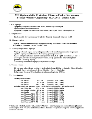 _______________________________________________________________________________________________________ XIX Ogólnopolskie Kryterium Uliczne o Puchar Karkonoszy z okazji "Wiosny Cieplickiej" 30.04.2016 - Jelenia Góra ____________________________________________________________ I. Cel wyścigu - popularyzacja kolarstwa wśród dzieci, młodzieży i dorosłych - promocja miasta Jelenia Góra - popularyzacja walorów kulturalnych i turystycznych ziemii jeleniogórskiej II. Organizator Karkonoskie Stowarzyszenie Cyklistów Jeleniej Górze ul. Kiepury 61/17 III. Klasa wyścigu Wyścig z kalendarza dolnośląskiego punktowany do CHALLENGE DZKol oraz Kalendarza Masters Puchar Polski, CHG IV. Zasady rozgrywania wyścigu Wyścig odbędzie się na okrążeniu przy całkowicie zamkniętym ruchu drogowym zgodnie z przepisami PZKol i obowiązującym regulaminem. Każde okrążenie będzie punktowane ( co trzecie 5, 3, 2, 1 pkt pozostałe 2, 1 pkt . ) Zwycięzcą kryterium zostaje ten zawodnik, który zgromadzi największą ilość punktów i ukończy wyścig . Zawodnicy zdublowani będą wycofywani z wyścigu. V. Termin i trasa Kryterium odbędzie się w dniu 30 kwietnia (sobota) 2016 r. w Jeleniej Górze-Cieplice Zdrój ul. Cervi (start i meta) -Hotel Cieplice >Cervi >Cieplicka> Pułaskiego>Staszica>Cervi , długość jednego okrążenia 1900 m VI. Uczestnictwo - kategorie wiekowe : - kat. Dzieci 6 - 8 lat (rocznik 2010 - 2008) - kat. Dzieci 9 - 10 lat (rocznik 2007 - 2006) - kat. Dzieci 11 - 12 lat (rocznik 2005 - 2004) dzieci startują za pisemną zgodą rodziców lub opiekunów i w ich obecności - kat. Młodzik 13 - 14 lat (rocznik 2003 - 2002) - kat. Junior młodszy 15-16 lat (rocznik 2001 - 2000) - kat. Junior 17 - 18 lat (rocznik 1999-1998) - kat. Masters M 30 30 - 39 lat (rocznik 1986 - 1977) - kat. Masters M 40 40 - 49 lat (rocznik 1976 - 1967) - kat. Masters M 50 50 - 59 lat (rocznik 1966 - 1957) - kat. Masters M 60 60 - 69 lat (rocznik 1956 - 1947) - kat. Masters M 70 70 – i starsi (rocznik 1946 - ……) W kategorii Młodzik, Junior mł., Junior i Masters - obowiązuje posiadanie aktualnej licencji kolarskiej na 2016 rok oraz badań lekarskich . Ponadto wszystkie kategorie obowiązują kaski kolarskie sztywne. VII. Dystans - kat. Dzieci 6 - 8 lat - kat. Dzieci 9 - 10 lat - kat. Dzieci 11 - 12 lat - kat. Młodzik 13 - 14 lat - kat. Junior mł. 15 - 16 lat - kat. Junior 17 - 18 lat - kat. Masters M30 30 - 39 lat - kat. Masters M40 40 - 49 lat - kat. Masters M50 50 - 59 lat - kat. Masters M60 60 – 69 lat - kat. Masters M70 70 i starsi - kat. Kobiety Open dystans dystans dystans dystans dystans dystans dystans dystans dystans dystans dystans dystans 500 m 1900 m 3800 m 17,1 km 22,8 km 34,2 km 34,2 km 28,5 km 28,5 km 22,8 km 17,1 km 17,1 km ( 1 okr.) ( 2 okr.) ( 9 okr.) (12 okr.) (18 okr.) (18 okr.) (15 okr.) (15 okr.) (12 okr.) ( 9 okr.) ( 9 okr.) na kreskę na kreskę na kreskę na punkty na punkty na punkty na punkty na punkty na punkty na punkty na punkty na punkty VIII. Zgłoszenia Przyjmowanie zgłoszeń w biurze wyścigu Hotel Cieplice ul.Cervi) w dniu 30 kwietnia 2016r. (sobota) dla kategorii dzieci od 9.00 do 10.00, dla kategorii młodzik, junior mł., junior i masters od godz. 9.00. do godz.10.30 Program minutowy kryterium odprawa techniczna dla kat. Młodzik, Junior mł., Junior, Kobiety i Masters start kat. Dzieci 6-8 lat start kat. Dzieci 9-10 lat start kat Dzieci 11-12 lat odprawa techniczna dla kat. Młodzik, Junior mł., Junior, Elita i Masters start kat. Młodzik start kat Junior mł start kat Junior start kat. Kobiety Open, M70 start kat. Masters M50, M60 , start kat. Masters M30, M40 godz. 15.30 zakończenie kryterium godz. 10.20 godz. 10.30 godz. 10.40 godz. 10.50 godz. 10.40 godz. 11.00 IX. Nagrody Puchary I miejsca , nagrody rzeczowe w każdej kategorii dla trzech pierwszych zawodników a dyplomy dla sześciu. Dla dzieci pamiątkowe medale i dyplomy oraz drobne upominki. X. Zasady finansowania Organizatorzy pokrywają koszty zabezpieczenia medycznego, organizacyjnego, sędziowskiego i inne wydatki związane z organizacją wyścigu. Opłaty startowe zgodnie z przepisami PZKol i Komisji Masters Dzieci startują bez opłaty startowej XI . Postanowienia końcowe. Komisję sędziowską powoła DZKol w porozumieniu z organizatorem. Organizator nie odpowiada za wypadki spowodowane przez zawodników bądź osoby towarzyszące w trakcie trwania wyścigu. Organizator nie ponosi odpowiedzialności za rzeczy skradzione ,zagubione lub zniszczone przed , w trakcie i po imprezie. Organizator w porozumieniu z sędzią głównym zastrzegają sobie prawo ewentualnych zmian w regulaminie we wszystkich sprawach w nim nie ujętych. Ponadto prawo startu mają zawodnicy posiadający badanie lekarskie oraz ubezpieczenie NW i OC XII. Osoby odpowiedzialne za organizację imprezy: - Michał Włoszczowski - Karkonoskie Stowarzyszenie Cyklistów Jelenia Góra - Aleksandra Kucab - Karkonoskie Stowarzyszenie Cyklistów Jelenia Góra Adres szpitala: Wojewódzkie Centrum Szpitalne Kotliny Jeleniogórskiej JELENIA GÓRA, ul. Ogińskiego 6, tel. +48 75 75-37-100 Noclegi: Hotel Cieplice: Hotel “Cieplice“ MEDI & SPA Jelenia Góra ul. Cervi 11 www.hotelcieplice.pl tel. 75-755 1041 Regulamin zatwierdzono dn. 20.03.2016 DZKol Wrocław: Zbigniew Jaszowski Mapka Kryterium