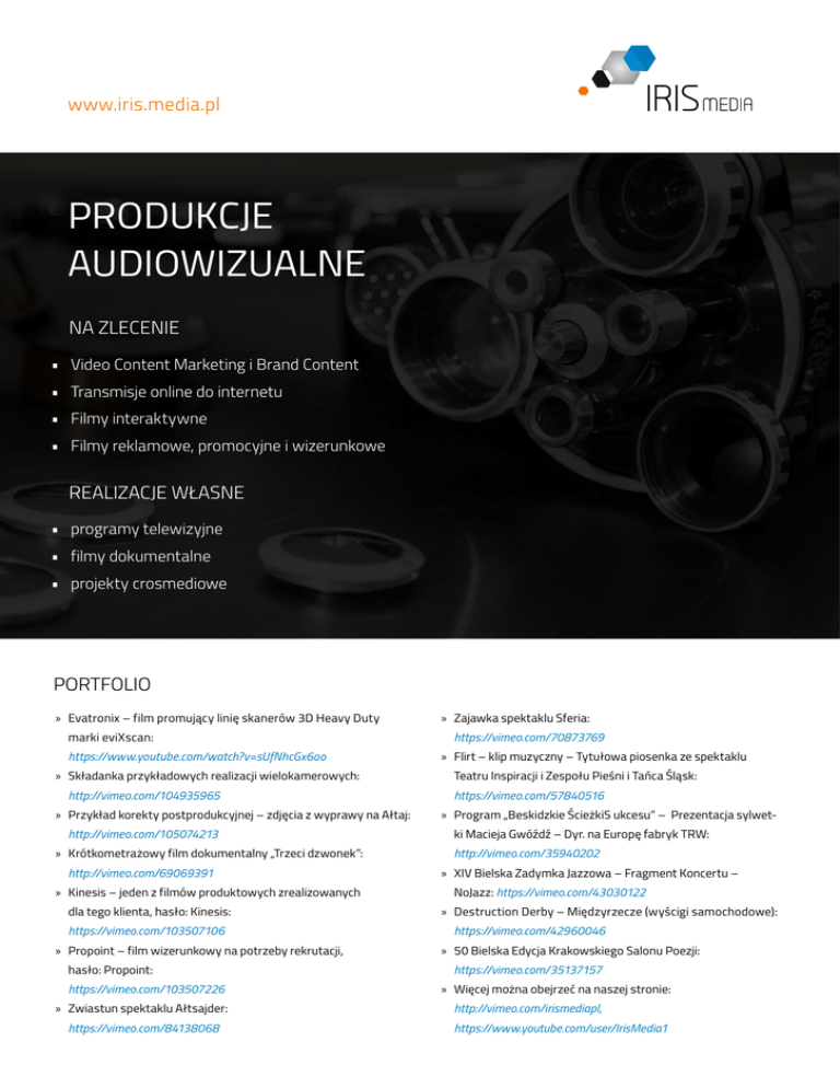 www.iris.media.pl PRODUKCJE AUDIOWIZUALNE NA ZLECENIE • Video Content Marketing i Brand Content • Transmisje online do internetu • Filmy interaktywne • Filmy reklamowe, promocyjne i wizerunkowe REALIZACJE WŁASNE • programy telewizyjne • filmy dokumentalne • projekty crosmediowe PORTFOLIO »» Evatronix – film promujący linię skanerów 3D Heavy Duty marki eviXscan: https://www.youtube.com/watch?v=sUfNhcGx6oo »» Składanka przykładowych realizacji wielokamerowych: http://vimeo.com/104935965 »» Przykład korekty postprodukcyjnej – zdjęcia z wyprawy na Ałtaj: http://vimeo.com/105074213 »» Krótkometrażowy film dokumentalny „Trzeci dzwonek”: http://vimeo.com/69069391 »» Kinesis – jeden z filmów produktowych zrealizowanych dla tego klienta, hasło: Kinesis: https://vimeo.com/103507106 »» Propoint – film wizerunkowy na potrzeby rekrutacji, hasło: Propoint: https://vimeo.com/103507226 »» Zwiastun spektaklu Ałtsajder: https://vimeo.com/84138068 »» Zajawka spektaklu Sferia: https://vimeo.com/70873769 »» Flirt – klip muzyczny – Tytułowa piosenka ze spektaklu Teatru Inspiracji i Zespołu Pieśni i Tańca Śląsk: https://vimeo.com/57840516 »» Program „Beskidzkie ŚcieżkiS ukcesu” – Prezentacja sylwetki Macieja Gwóźdź – Dyr. na Europę fabryk TRW: http://vimeo.com/35940202 »» XIV Bielska Zadymka Jazzowa – Fragment Koncertu – NoJazz: https://vimeo.com/43030122 »» Destruction Derby – Międzyrzecze (wyścigi samochodowe): https://vimeo.com/42960046 »» 50 Bielska Edycja Krakowskiego Salonu Poezji: https://vimeo.com/35137157 »» Więcej można obejrzeć na naszej stronie: http://vimeo.com/irismediapl, https://www.youtube.com/user/IrisMedia1