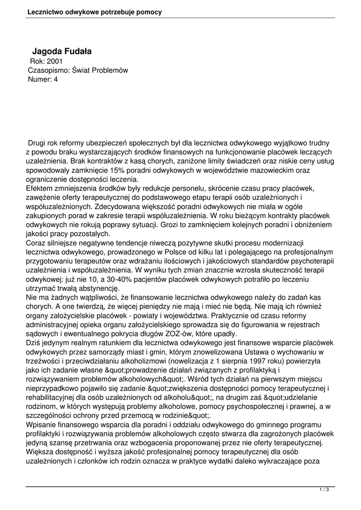 Lecznictwo odwykowe potrzebuje pomocy Jagoda Fudała Rok: 2001 Czasopismo: Świat Problemów Numer: 4 Drugi rok reformy ubezpieczeń społecznych był dla lecznictwa odwykowego wyjątkowo trudny z powodu braku wystarczających środków finansowych na funkcjonowanie placówek leczących uzależnienia. Brak kontraktów z kasą chorych, zaniżone limity świadczeń oraz niskie ceny usług spowodowały zamknięcie 15% poradni odwykowych w województwie mazowieckim oraz ograniczenie dostępności leczenia. Efektem zmniejszenia środków były redukcje personelu, skrócenie czasu pracy placówek, zawężenie oferty terapeutycznej do podstawowego etapu terapii osób uzależnionych i współuzależnionych. Zdecydowana większość poradni odwykowych nie miała w ogóle zakupionych porad w zakresie terapii współuzależnienia. W roku bieżącym kontrakty placówek odwykowych nie rokują poprawy sytuacji. Grozi to zamknięciem kolejnych poradni i obniżeniem jakości pracy pozostałych. Coraz silniejsze negatywne tendencje niweczą pozytywne skutki procesu modernizacji lecznictwa odwykowego, prowadzonego w Polsce od kilku lat i polegającego na profesjonalnym przygotowaniu terapeutów oraz wdrażaniu ilościowych i jakościowych standardów psychoterapii uzależnienia i współuzależnienia. W wyniku tych zmian znacznie wzrosła skuteczność terapii odwykowej: już nie 10, a 30-40% pacjentów placówek odwykowych potrafiło po leczeniu utrzymać trwałą abstynencję. Nie ma żadnych wątpliwości, że finansowanie lecznictwa odwykowego należy do zadań kas chorych. A one twierdzą, że więcej pieniędzy nie mają i mieć nie będą. Nie mają ich również organy założycielskie placówek - powiaty i województwa. Praktycznie od czasu reformy administracyjnej opieka organu założycielskiego sprowadza się do figurowania w rejestrach sądowych i ewentualnego pokrycia długów ZOZ-ów, które upadły. Dziś jedynym realnym ratunkiem dla lecznictwa odwykowego jest finansowe wsparcie placówek odwykowych przez samorządy miast i gmin, którym znowelizowana Ustawa o wychowaniu w trzeźwości i przeciwdziałaniu alkoholizmowi (nowelizacja z 1 sierpnia 1997 roku) powierzyła jako ich zadanie własne "prowadzenie działań związanych z profilaktyką i rozwiązywaniem problemów alkoholowych". Wśród tych działań na pierwszym miejscu nieprzypadkowo pojawiło się zadanie "zwiększenia dostępności pomocy terapeutycznej i rehabilitacyjnej dla osób uzależnionych od alkoholu", na drugim zaś "udzielanie rodzinom, w których występują problemy alkoholowe, pomocy psychospołecznej i prawnej, a w szczególności ochrony przed przemocą w rodzinie". Wpisanie finansowego wsparcia dla poradni i oddziału odwykowego do gminnego programu profilaktyki i rozwiązywania problemów alkoholowych często stwarza dla zagrożonych placówek jedyną szansę przetrwania oraz wzbogacenia proponowanej przez nie oferty terapeutycznej. Większa dostępność i wyższa jakość profesjonalnej pomocy terapeutycznej dla osób uzależnionych i członków ich rodzin oznacza w praktyce wydatki daleko wykraczające poza 1/3 Lecznictwo odwykowe potrzebuje pomocy finansowe możliwości placówek, określone przez kontrakty z kasami chorych: na dodatkowe zatrudnienie i refundację specjalistycznych szkoleń terapeutów, na remonty i wyposażenie pomieszczeń do pracy terapeutycznej oraz wydatki niezbędne przy wdrażaniu nowoczesnych programów leczenia uzależnienia od alkoholu i współuzależnienia (alkotesty, sprzęt RTV, książki, komputery, drukarki, duże ilości papieru itd.). Takie inwestycje umożliwiają wydłużenie czasu pracy placówek, wzrost kompetencji ich personelu, wzbogacenie oferty terapeutycznej, a co za tym idzie - skuteczniejsze leczenie. Jako kierownik Wojewódzkiego Ośrodka Terapii Uzależnienia od Alkoholu i Współuzależnienia w województwie mazowieckim z uwagą przyglądam się polityce samorządów niektórych miast i gmin wobec placówek odwykowych. Część z nich od lat je dofinansowuje. Kilkanaście poradni przetrwało ubiegły rok wyłącznie dzięki pomocy uzyskanej od samorządów. Zawarto porozumienia, w myśl których miasta i gminy zobowiązują się do opłacenia wynagrodzeń za dodatkową pracę pracowników (pracujących w wymiarze 60 lub 120 godzin miesięcznie w ramach tzw. ryczałtu), niektórych zajęć terapeutycznych, czasami konsultacji lekarskich. Zakupiły dla placówek odwykowych elementy wyposażenia gabinetów i sal terapeutycznych, materiały piśmienne i edukacyjne, refundowały pracownikom koszty szkoleń, szczególnie tych, które stanowią kolejne etapy procesu certyfikowania terapeutów uzależnień, a więc Studium Pomocy Psychologicznej, Studium Terapii Uzależnień, stażów i superwizji klinicznej. Na szczególne podkreślenie zasługuje wieloletnia stabilność pomocy dla placówek ze strony tych gmin. Jaką korzyść może mieć miasto lub gmina z tak wydatkowanych pieniędzy? Przede wszystkim to, że na jej terenie lub w sąsiedztwie pracuje dobra placówka leczenia uzależnień, dysponująca szeroką ofertą terapeutyczną dla osób uzależnionych, współuzależnionych, ofiar przemocy domowej, czasami młodzieży czy nawet dzieci. W sytuacji, gdy istnieje zaplecze fachowców, nabiera sensu motywacyjna praca zespołów interwencyjnych gminnych komisji rozwiązywania problemów alkoholowych. Urzędnicy gminy, pracownicy pomocy społecznej, nauczyciele wiedzą, że w sytuacjach trudnych mogą liczyć na pomoc kompetentnych osób - na interwencje, konsultacje, szkolenia. Zarówno wśród urzędników, jak i ogółu mieszkańców wzrasta wiara w sens i skuteczność angażowania się w rozwiązywanie lokalnych problemów alkoholowych. Większość gmin nie dostrzega jednak konieczności finansowego wspierania placówek leczenia uzależnień. Argumenty, jakimi najczęściej uzasadniają odmowę udzielenia pomocy, świadczą o niskim poziomie wiedzy na temat