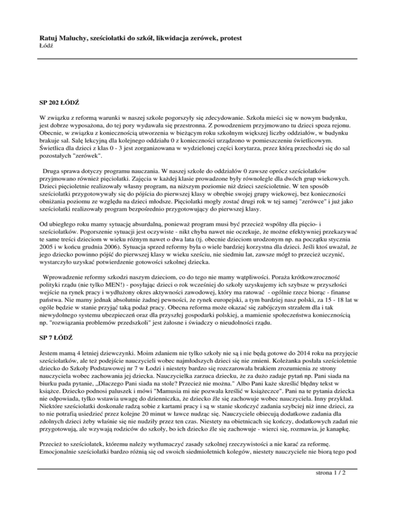 Ratuj Maluchy, sześciolatki do szkół, likwidacja zerówek, protest Łódź SP 202 ŁÓDŹ W związku z reformą warunki w naszej szkole pogorszyły się zdecydowanie. Szkoła mieści się w nowym budynku, jest dobrze wyposażona, do tej pory wydawała się przestronna. Z powodzeniem przyjmowano tu dzieci spoza rejonu. Obecnie, w związku z koniecznością utworzenia w bieżącym roku szkolnym większej liczby oddziałów, w budynku brakuje sal. Salę lekcyjną dla kolejnego oddziału 0 z konieczności urządzono w pomieszczeniu świetlicowym. Świetlica dla dzieci z klas 0 - 3 jest zorganizowana w wydzielonej części korytarza, przez którą przechodzi się do sal pozostałych "zerówek". Druga sprawa dotyczy programu nauczania. W naszej szkole do oddziałów 0 zawsze oprócz sześciolatków przyjmowano również pięciolatki. Zajęcia w każdej klasie prowadzone były równolegle dla dwóch grup wiekowych. Dzieci pięcioletnie realizowały własny program, na niższym poziomie niż dzieci sześcioletnie. W ten sposób sześciolatki przygotowywały się do pójścia do pierwszej klasy w obrębie swojej grupy wiekowej, bez konieczności obniżania poziomu ze względu na dzieci młodsze. Pięciolatki mogły zostać drugi rok w tej samej "zerówce" i już jako sześciolatki realizowały program bezpośrednio przygotowujący do pierwszej klasy. Od ubiegłego roku mamy sytuację absurdalną, ponieważ program musi być przecież wspólny dla pięcio- i sześciolatków. Pogorszenie sytuacji jest oczywiste - nikt chyba nawet nie oczekuje, że możne efektywniej przekazywać te same treści dzieciom w wieku różnym nawet o dwa lata (tj. obecnie dzieciom urodzonym np. na początku stycznia 2005 i w końcu grudnia 2006). Sytuacja sprzed reformy była o wiele bardziej korzystna dla dzieci. Jeśli ktoś uważał, że jego dziecko powinno pójść do pierwszej klasy w wieku sześciu, nie siedmiu lat, zawsze mógł to przecież uczynić, wystarczyło uzyskać potwierdzenie gotowości szkolnej dziecka. Wprowadzenie reformy szkodzi naszym dzieciom, co do tego nie mamy wątpliwości. Poraża krótkowzroczność polityki rządu (nie tylko MEN!) - posyłając dzieci o rok wcześniej do szkoły uzyskujemy ich szybsze w przyszłości wejście na rynek pracy i wydłużony okres aktywności zawodowej, który ma ratować - ogólnie rzecz biorąc - finanse państwa. Nie mamy jednak absolutnie żadnej pewności, że rynek europejski, a tym bardziej nasz polski, za 15 - 18 lat w ogóle będzie w stanie przyjąć taką podaż pracy. Obecna reforma może okazać się zabójczym strzałem dla i tak niewydolnego systemu ubezpieczeń oraz dla przyszłej gospodarki polskiej, a mamienie społeczeństwa koniecznością np. "rozwiązania problemów przedszkoli" jest żałosne i świadczy o nieudolności rządu. SP 7 ŁÓDŹ Jestem mamą 4 letniej dziewczynki. Moim zdaniem nie tylko szkoły nie są i nie będą gotowe do 2014 roku na przyjęcie sześciolatków, ale też podejście nauczycieli wobec najmłodszych dzieci się nie zmieni. Koleżanka posłała sześcioletnie dziecko do Szkoły Podstawowej nr 7 w Łodzi i niestety bardzo się rozczarowała brakiem zrozumienia ze strony nauczyciela wobec zachowania jej dziecka. Nauczycielka zarzuca dziecku, że za dużo zadaje pytań np. Pani siada na biurku pada pytanie, „Dlaczego Pani siada na stole? Przecież nie można." Albo Pani każe skreślić błędny tekst w książce. Dziecko podnosi paluszek i mówi "Mamusia mi nie pozwala kreślić w książeczce". Pani na te pytania dziecka nie odpowiada, tylko wstawia uwagę do dzienniczka, że dziecko źle się zachowuje wobec nauczyciela. Inny przykład. Niektóre sześciolatki doskonale radzą sobie z kartami pracy i są w stanie skończyć zadania szybciej niż inne dzieci, za to nie potrafią usiedzieć przez kolejne 20 minut w ławce nudząc się. Nauczyciele obiecują dodatkowe zadania dla zdolnych dzieci żeby właśnie się nie nudziły przez ten czas. Niestety na obietnicach się kończy, dodatkowych zadań nie przygotowują, ale wzywają rodziców do szkoły, bo ich dziecko źle się zachowuje - wierci się, rozmawia, je kanapkę. Przecież to sześciolatek, któremu należy wytłumaczyć zasady szkolnej rzeczywistości a nie karać za reformę. Emocjonalnie sześciolatki bardzo różnią się od swoich siedmioletnich kolegów, niestety nauczyciele nie biorą tego pod strona 1 / 2 Ratuj Maluchy, sześciolatki do szkół, likwidacja zerówek, protest Łódź uwagę. Uważam, że jeśli MEN chce zapewnić dostęp do wysokiej jakości edukacji to przede wszystkim nie powinien spieszyć się z reformą, ale zbadać jakość nauczania i podejście nauczycieli do ucznia we wszystkich szkołach, bo jak na razie z opinii znajomych rodziców wiem że nauczyciele obiecują pomoc młodszym dzieciom ale z obietnic się nie wywiązują. Do 2014 roku podejścia nie zmienią. Mamy 4-latków. strona 2 / 2