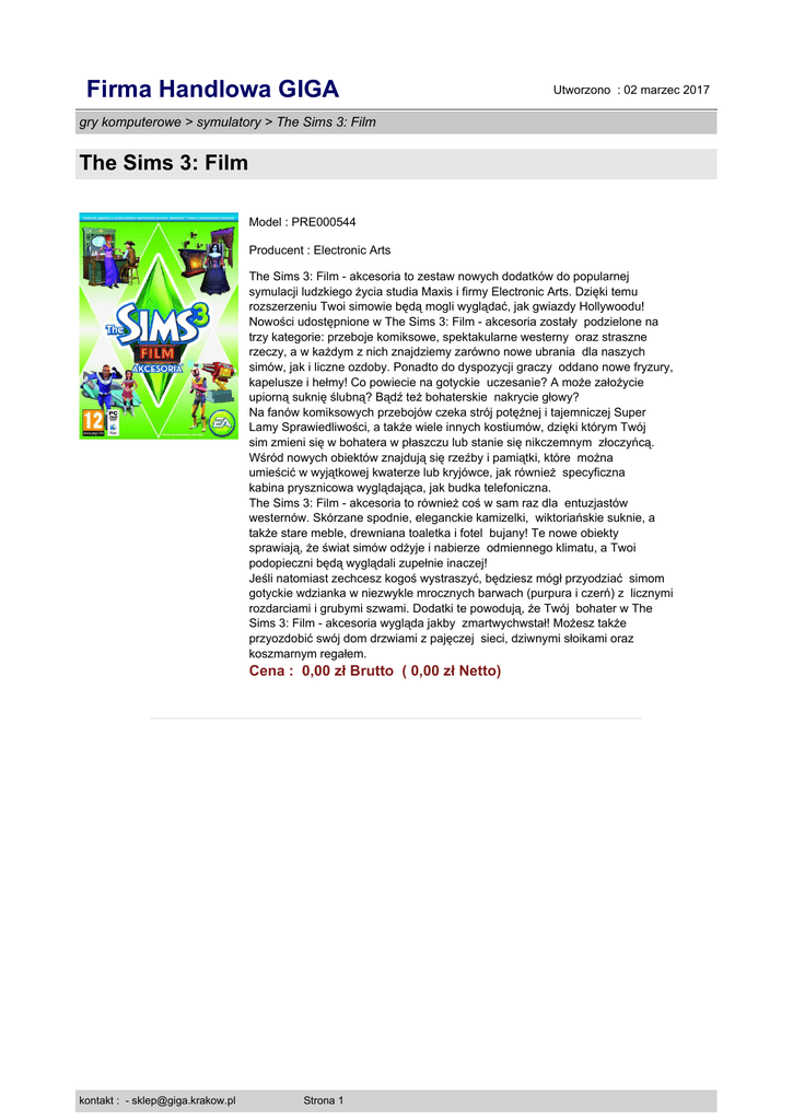 Firma Handlowa GIGA Utworzono : 02 marzec 2017 gry komputerowe > symulatory > The Sims 3: Film The Sims 3: Film Model : PRE000544 Producent : Electronic Arts The Sims 3: Film - akcesoria to zestaw nowych dodatków do popularnej symulacji ludzkiego życia studia Maxis i firmy Electronic Arts. Dzięki temu rozszerzeniu Twoi simowie będą mogli wyglądać, jak gwiazdy Hollywoodu! Nowości udostępnione w The Sims 3: Film - akcesoria zostały podzielone na trzy kategorie: przeboje komiksowe, spektakularne westerny oraz straszne rzeczy, a w każdym z nich znajdziemy zarówno nowe ubrania dla naszych simów, jak i liczne ozdoby. Ponadto do dyspozycji graczy oddano nowe fryzury, kapelusze i hełmy! Co powiecie na gotyckie uczesanie? A może założycie upiorną suknię ślubną? Bądź też bohaterskie nakrycie głowy? Na fanów komiksowych przebojów czeka strój potężnej i tajemniczej Super Lamy Sprawiedliwości, a także wiele innych kostiumów, dzięki którym Twój sim zmieni się w bohatera w płaszczu lub stanie się nikczemnym złoczyńcą. Wśród nowych obiektów znajdują się rzeźby i pamiątki, które można umieścić w wyjątkowej kwaterze lub kryjówce, jak również specyficzna kabina prysznicowa wyglądająca, jak budka telefoniczna. The Sims 3: Film - akcesoria to również coś w sam raz dla entuzjastów westernów. Skórzane spodnie, eleganckie kamizelki, wiktoriańskie suknie, a także stare meble, drewniana toaletka i fotel bujany! Te nowe obiekty sprawiają, że świat simów odżyje i nabierze odmiennego klimatu, a Twoi podopieczni będą wyglądali zupełnie inaczej! Jeśli natomiast zechcesz kogoś wystraszyć, będziesz mógł przyodziać simom gotyckie wdzianka w niezwykle mrocznych barwach (purpura i czerń) z licznymi rozdarciami i grubymi szwami. Dodatki te powodują, że Twój bohater w The Sims 3: Film - akcesoria wygląda jakby zmartwychwstał! Możesz także przyozdobić swój dom drzwiami z pajęczej sieci, dziwnymi słoikami oraz koszmarnym regałem. Cena : 0,00 zł Brutto ( 0,00 zł Netto) kontakt : - [email protected] Strona 1
