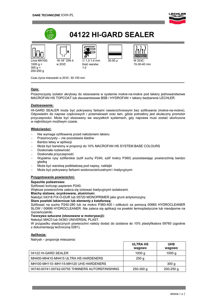 DANE TECHNICZNE 0309-PL 04122 HI-GARD SEALER Linia MH100: 1000 g + 300 g + 200-250 g 16-18’’ DIN 4 w 20°C ∅ 1,3-1,4 mm Ilość warstw: 1-2 30-50 µ W 20°C: 15-30-40 min Czas życia mieszanki w 20°C: 30-150 min Opis: Przezroczysty izolator akrylowy do stosowania w systemie mokre-na-mokre pod lakiery jednowarstwowe MACROFAN HS TOPCOAT lub dwuwarstwowe BSB / HYDROFAN + lakiery bezbarwne LECHLER. Zastosowanie: HI-GARD SEALER może być pokrywany farbami nawierzchniowymi bez szlifowania (mokre-na-mokre). Odpowiedni do napraw częściowych i przemalowań oraz tam, gdzie potrzebny jest skuteczny promotor przyczepności. Może być stosowany we wszystkich systemach, gdy naprawa musi zostać ukończona w najkrótszym możliwym czasie. Właściwości: − − − − − − − − − Nie wymaga szlifowania przed nałożeniem lakieru Przezroczysty – nie pozostawia śladów Bardzo łatwy w aplikacji Może być barwiony w proporcji do 10% MACROFAN HS SYSTEM BASE COLOURS Doskonała rozlewność Doskonała przyczepność Wypełnia rysy szlifierskie (szlif suchy P240, szlif mokry P360) pozostawiając powierzchnię bardzo gładką Może być warstwą podkładową pod napisy, naklejki Może być pokrywany farbami wodorozcieńczalnymi i tradycyjnymi Przygotowanie powierzchni: Szpachle poliestrowe: Szlifować kończąc papierem P240. Większe powierzchnie zaleca się izolować tradycyjnymi izolatorami. Blachy stalowe, ocynkowane, aluminium: Nałożyć 04318 FIX-O-DUR lub 05720 MONOPRIMER jako grunt antykorozyjny. Stare powłoki lakiernicze lub elementy z kataforezą: Szlifować na sucho P240-280 lub na mokro P360-400 i odtłuścić za pomocą 00665 HYDROCLEANER SLOW / 00699 HYDROCLEANER. Nie zaleca się aplikacji na powłoki termoplastyczne lub nieodporne na rozcieńczalniki. Tworzywa sztuczne (stosowane w motoryzacji): Nałożyć MAC0 lub 04363 UNIVERSAL PLAST. W przypadku elastycznych powierzchni należy dodać do izolatora do 10% plastyfikatora 09760 (zgodnie z dokumentacją techniczną 0281). Aplikacja: Natrysk – proporcje mieszania: ULTRA HS wagowo UHS wagowo 04122 HI-GARD SEALER 1000 g 1000 g MH400-MH410-MH415 ULTRA HS HARDENERS 250 g MH100-MH110–MH115-MH120 UHS HARDENERS 00740-00741-00742-00755 THINNERS AUTOREFINISHING 300 g 250-300 g 200-250 g strona 1 z 2 DANE TECHNICZNE 0309-PL Produkt rozcieńczony: UHS wagowo ULTRA HS wagowo 04122 HI-GARD SEALER 900 g 900 g MACROFAN HS SYSTEM BASE COLOURS 100 g 100 g MH400-MH410 -MH415 ULTRA HS HARDENERS 250 g MH100-MH110–MH115-MH120 UHS HARDENERS 300 g 00740-00741-00742-00755 THINNERS AUTOREFINISHING Utwardzacz Czas życia mieszanki w 20°C 250-300 g 200-250 g MH400 MH410 MH415 MH100 MH110 MH115 MH120 2,5 godz. 1,5 godz. 45 min 2 godz. 1,5 godz. 1 godz. 30 min Lepkość do natrysku w 20°C: 16-18’’ DIN 4 ø dyszy: HVLP 1,3-1,4 mm Ciśnienie powietrza: zgodnie z zaleceniami producenta pistoletu natryskowego Ilość warstw: ½ + 1 pełna warstwa Zalecana grubość pokrycia: 30-50 µ 2 Wydajność teoretyczna: 1 l mieszanki = 9,2 m przy 50 µ 2 1kg mieszanki = 7,9 m przy 50 µ DIR 2004/42/CE: Grunty IIB/c – VOC mieszanki gotowej do użycia 540 g/l Ten produkt gotowy do użycia zawiera nie więcej niż 540 g/l VOC Czas schnięcia: Czas odparowania: W 20°°C Duże powierzchnie (20-25°C) MH400 MH100 MH110 40 min 30 min 25 min Średniej wielkości powierzchnie (15-25°C) MH410 30 min MH115 20 min Naprawy miejscowe (15-25°C) MH415 15 min MH120 15 min 04122 może być pokrywany do 8 godzin od aplikacji. Po tym czasie musi zostać wysuszony i zmatowiony. Warstwy następne: − − MACROFAN HS TOP COAT BSB/HYDROFAN + lakier bezbarwny Lechler Uwagi: o W okresie letnim przy temperaturach powyżej 25-30 C i wysokiej wilgotności względnej powietrza, na powierzchni gotowej mieszanki, po 60 minutach od przygotowania może utworzyć się „skórka”. Zaleca się w takim wypadku przefiltrować produkt przez sitko #2000. Dane techniczne 0309-PL 06/2012 PRODUKT PRZEZNACZONY JEST DO ZASTOSOWAŃ PROFESJONALNYCH PRZEZ WYKWALIFIKOWANY PERSONEL. Powyższe dane sporządzono po uprzednim sprawdzeniu, mimo to nie odpowiadamy za ewentualne pomyłki i niedokładności. strona 2 z 2
