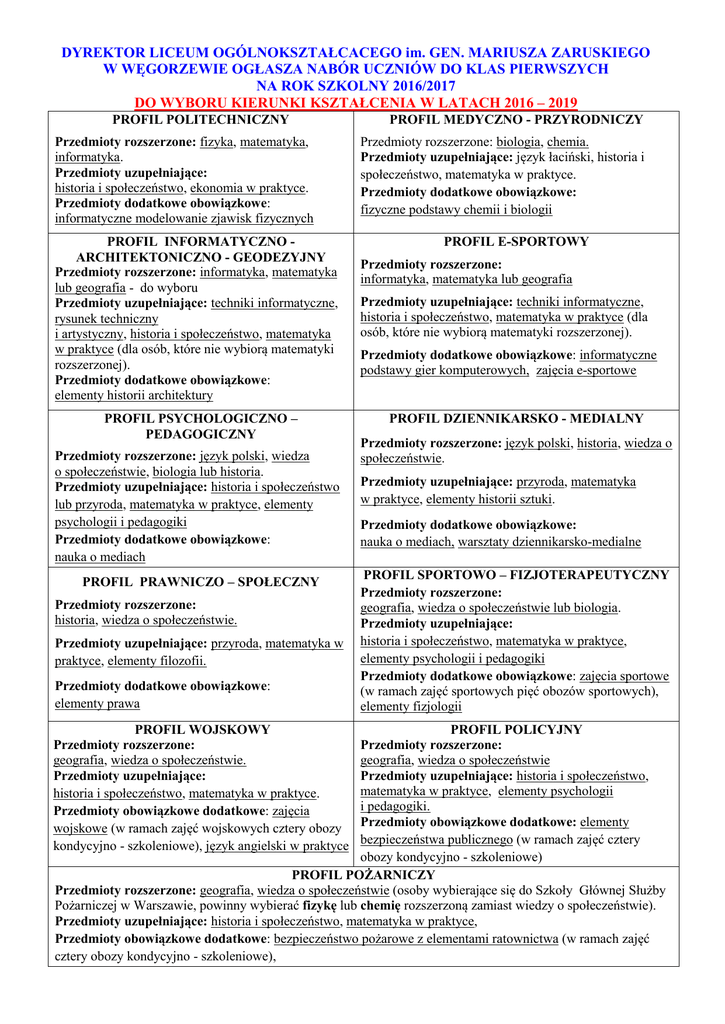 DYREKTOR LICEUM OGÓLNOKSZTAŁCACEGO im. GEN. MARIUSZA ZARUSKIEGO W WĘGORZEWIE OGŁASZA NABÓR UCZNIÓW DO KLAS PIERWSZYCH NA ROK SZKOLNY 2016/2017 DO WYBORU KIERUNKI KSZTAŁCENIA W LATACH 2016 – 2019 PROFIL POLITECHNICZNY Przedmioty rozszerzone: fizyka, matematyka, informatyka. Przedmioty uzupełniające: historia i społeczeństwo, ekonomia w praktyce. Przedmioty dodatkowe obowiązkowe: informatyczne modelowanie zjawisk fizycznych PROFIL INFORMATYCZNO ARCHITEKTONICZNO - GEODEZYJNY Przedmioty rozszerzone: informatyka, matematyka lub geografia - do wyboru Przedmioty uzupełniające: techniki informatyczne, rysunek techniczny i artystyczny, historia i społeczeństwo, matematyka w praktyce (dla osób, które nie wybiorą matematyki rozszerzonej). Przedmioty dodatkowe obowiązkowe: elementy historii architektury PROFIL PSYCHOLOGICZNO – PEDAGOGICZNY Przedmioty rozszerzone: język polski, wiedza o społeczeństwie, biologia lub historia. Przedmioty uzupełniające: historia i społeczeństwo lub przyroda, matematyka w praktyce, elementy psychologii i pedagogiki Przedmioty dodatkowe obowiązkowe: nauka o mediach PROFIL PRAWNICZO – SPOŁECZNY Przedmioty rozszerzone: historia, wiedza o społeczeństwie. Przedmioty uzupełniające: przyroda, matematyka w praktyce, elementy filozofii. Przedmioty dodatkowe obowiązkowe: elementy prawa PROFIL WOJSKOWY Przedmioty rozszerzone: geografia, wiedza o społeczeństwie. Przedmioty uzupełniające: historia i społeczeństwo, matematyka w praktyce. Przedmioty obowiązkowe dodatkowe: zajęcia wojskowe (w ramach zajęć wojskowych cztery obozy kondycyjno - szkoleniowe), język angielski w praktyce PROFIL MEDYCZNO - PRZYRODNICZY Przedmioty rozszerzone: biologia, chemia. Przedmioty uzupełniające: język łaciński, historia i społeczeństwo, matematyka w praktyce. Przedmioty dodatkowe obowiązkowe: fizyczne podstawy chemii i biologii PROFIL E-SPORTOWY Przedmioty rozszerzone: informatyka, matematyka lub geografia Przedmioty uzupełniające: techniki informatyczne, historia i społeczeństwo, matematyka w praktyce (dla osób, które nie wybiorą matematyki rozszerzonej). Przedmioty dodatkowe obowiązkowe: informatyczne podstawy gier komputerowych, zajęcia e-sportowe PROFIL DZIENNIKARSKO - MEDIALNY Przedmioty rozszerzone: język polski, historia, wiedza o społeczeństwie. Przedmioty uzupełniające: przyroda, matematyka w praktyce, elementy historii sztuki. Przedmioty dodatkowe obowiązkowe: nauka o mediach, warsztaty dziennikarsko-medialne PROFIL SPORTOWO – FIZJOTERAPEUTYCZNY Przedmioty rozszerzone: geografia, wiedza o społeczeństwie lub biologia. Przedmioty uzupełniające: historia i społeczeństwo, matematyka w praktyce, elementy psychologii i pedagogiki Przedmioty dodatkowe obowiązkowe: zajęcia sportowe (w ramach zajęć sportowych pięć obozów sportowych), elementy fizjologii PROFIL POLICYJNY Przedmioty rozszerzone: geografia, wiedza o społeczeństwie Przedmioty uzupełniające: historia i społeczeństwo, matematyka w praktyce, elementy psychologii i pedagogiki. Przedmioty obowiązkowe dodatkowe: elementy bezpieczeństwa publicznego (w ramach zajęć cztery obozy kondycyjno - szkoleniowe) PROFIL POŻARNICZY Przedmioty rozszerzone: geografia, wiedza o społeczeństwie (osoby wybierające się do Szkoły Głównej Służby Pożarniczej w Warszawie, powinny wybierać fizykę lub chemię rozszerzoną zamiast wiedzy o społeczeństwie). Przedmioty uzupełniające: historia i społeczeństwo, matematyka w praktyce, Przedmioty obowiązkowe dodatkowe: bezpieczeństwo pożarowe z elementami ratownictwa (w ramach zajęć cztery obozy kondycyjno - szkoleniowe),