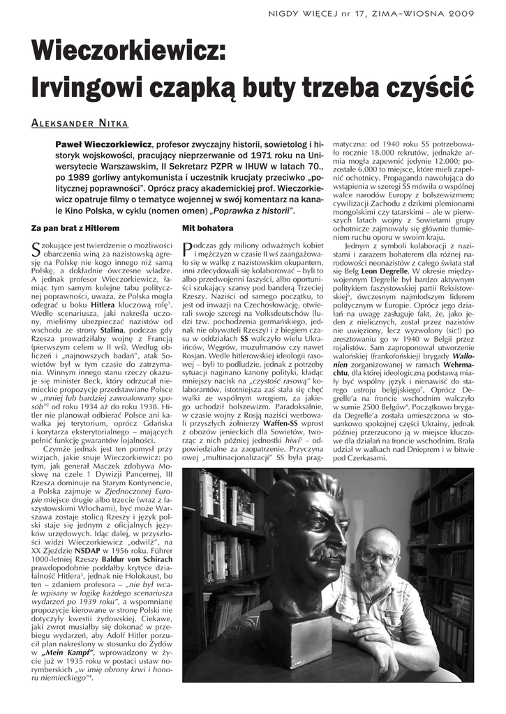 NIGDY WIĘCEJ nr 17, ZIMA-WIOSNA 2009 Wieczorkiewicz: Irvingowi czapką buty trzeba czyścić ALEKSANDER NITKA Paweł Wieczorkiewicz, profesor zwyczajny historii, sowietolog i historyk wojskowości, pracujący nieprzerwanie od 1971 roku na Uniwersytecie Warszawskim, II Sekretarz PZPR w IHUW w latach 70., po 1989 gorliwy antykomunista i uczestnik krucjaty przeciwko „politycznej poprawności”. Oprócz pracy akademickiej prof. Wieczorkiewicz opatruje filmy o tematyce wojennej w swój komentarz na kanale Kino Polska, w cyklu (nomen omen) „Poprawka z historii”. Za pan brat z Hitlerem Mit bohatera S P zokujące jest twierdzenie o możliwości obarczenia winą za nazistowską agresję na Polskę nie kogo innego niż samą Polskę, a dokładnie ówczesne władze. A jednak profesor Wieczorkiewicz, łamiąc tym samym kolejne tabu politycznej poprawności, uważa, że Polska mogła odegrać u boku Hitlera kluczową rolę1. Wedle scenariusza, jaki nakreśla uczony, mieliśmy ubezpieczać nazistów od wschodu ze strony Stalina, podczas gdy Rzesza prowadziłaby wojnę z Francją (pierwszym celem w II wś). Według obliczeń i „najnowszych badań”, atak Sowietów był w tym czasie do zatrzymania. Winnym innego stanu rzeczy okazuje się minister Beck, który odrzucał niemieckie propozycje przedstawiane Polsce w „mniej lub bardziej zawoalowany sposób”2 od roku 1934 aż do roku 1938. Hitler nie planował odbierać Polsce ani kawałka jej terytorium, oprócz Gdańska i korytarza eksterytorialnego – mających pełnić funkcję gwarantów lojalności. Czymże jednak jest ten pomysł przy wizjach, jakie snuje Wieczorkiewicz: po tym, jak generał Maczek zdobywa Moskwę na czele 1 Dywizji Pancernej, III Rzesza dominuje na Starym Kontynencie, a Polska zajmuje w Zjednoczonej Europie miejsce drugie albo trzecie (wraz z faszystowskimi Włochami), być może Warszawa zostaje stolicą Rzeszy i język polski staje się jednym z oficjalnych języków urzędowych. Idąc dalej, w przyszłości widzi Wieczorkiewicz „odwilż”, na XX Zjeździe NSDAP w 1956 roku. Führer 1000-letniej Rzeszy Baldur von Schirach prawdopodobnie poddałby krytyce działalność Hitlera3, jednak nie Holokaust, bo ten – zdaniem profesora – „nie był wcale wpisany w logikę każdego scenariusza wydarzeń po 1939 roku”, a wspomniane propozycje kierowane w stronę Polski nie dotyczyły kwestii żydowskiej. Ciekawe, jaki zwrot musiałby się dokonać w przebiegu wydarzeń, aby Adolf Hitler porzucił plan nakreślony w stosunku do Żydów w „Mein Kampf”, wprowadzony w życie już w 1935 roku w postaci ustaw norymberskich „w imię obrony krwi i honoru niemieckiego”4. odczas gdy miliony odważnych kobiet i mężczyzn w czasie II wś zaangażowało się w walkę z nazistowskim okupantem, inni zdecydowali się kolaborować – byli to albo przedwojenni faszyści, albo oportuniści szukający szansy pod banderą Trzeciej Rzeszy. Naziści od samego początku, to jest od inwazji na Czechosłowację, otwierali swoje szeregi na Volksdeutschów (ludzi tzw. pochodzenia germańskiego, jednak nie obywateli Rzeszy) i z biegiem czasu w oddziałach SS walczyło wielu Ukraińców, Węgrów, muzułmanów czy nawet Rosjan. Wedle hitlerowskiej ideologii rasowej – byli to podludzie, jednak z potrzeby sytuacji naginano kanony polityki, kładąc mniejszy nacisk na „czystość rasową” kolaborantów, istotniejsza zaś stała się chęć walki ze wspólnym wrogiem, za jakiego uchodził bolszewizm. Paradoksalnie, w czasie wojny z Rosją naziści werbowali przyszłych żołnierzy Waffen-SS wprost z obozów jenieckich dla Sowietów, tworząc z nich później jednostki hiwi5 – odpowiedzialne za zaopatrzenie. Przyczyna owej „multinacjonalizacji” SS była prag- matyczna: od 1940 roku SS potrzebowało rocznie 18.000 rekrutów, jednakże armia mogła zapewnić jedynie 12.000; pozostałe 6.000 to miejsce, które mieli zapełnić ochotnicy. Propaganda nawołująca do wstąpienia w szeregi SS mówiła o wspólnej walce narodów Europy z bolszewizmem; cywilizacji Zachodu z dzikimi plemionami mongolskimi czy tatarskimi – ale w pierwszych latach wojny z Sowietami grupy ochotnicze zajmowały się głównie tłumieniem ruchu oporu w swoim kraju. Jednym z symboli kolaboracji z nazistami i zarazem bohaterem dla różnej narodowości neonazistów z całego świata stał się Belg Leon Degrelle. W okresie międzywojennym Degrelle był bardzo aktywnym politykiem faszystowskiej partii Reksistowskiej6, ówczesnym najmłodszym liderem politycznym w Europie. Oprócz jego działań na uwagę zasługuje fakt, że, jako jeden z nielicznych, został przez nazistów nie uwięziony, lecz wyzwolony (sic!) po aresztowaniu go w 1940 w Belgii przez rojalistów. Sam zaproponował utworzenie walońskiej (frankofońskiej) brygady Wallonien zorganizowanej w ramach Wehrmachtu, dla której ideologiczną podstawą miały być wspólny język i nienawiść do starego ustroju belgijskiego7. Oprócz Degrelle’a na froncie wschodnim walczyło w sumie 2500 Belgów8. Początkowo brygada Degrelle’a została umieszczona w stosunkowo spokojnej części Ukrainy, jednak później przerzucono ją w miejsce kluczowe dla działań na froncie wschodnim. Brała udział w walkach nad Dnieprem i w bitwie pod Czerkasami. NIGDY WIĘCEJ nr 17, ZIMA-WIOSNA 2009 W 1943 roku z rozkazu Himmlera sam Degrelle za swoje oddanie nazistom zostaje odznaczony Krzyżem Rycerskim Krzyża Żelaznego z liśćmi dębowymi (Ritterkreuz des Eisernen Kreuzes zum Eichenlaub), jako jeden z nielicznych nie-Niemców, oraz „uhonorowany” słowami Hitlera: „Gdybym miał syna, chciałbym, żeby był taki jak ty”. Jego oddział rozbito pod Berlinem w roku 1945, Degrelle ocalał jako jeden z 850 ochotników w Wallonien9, zbiegł do Hiszpanii, gdzie rozpoczął karierę neofaszystowskiego bohatera. Mimo że w latach 50. i 60. współpraca siatki powojennych niedobitków dawała raczej mizerne efekty, na p