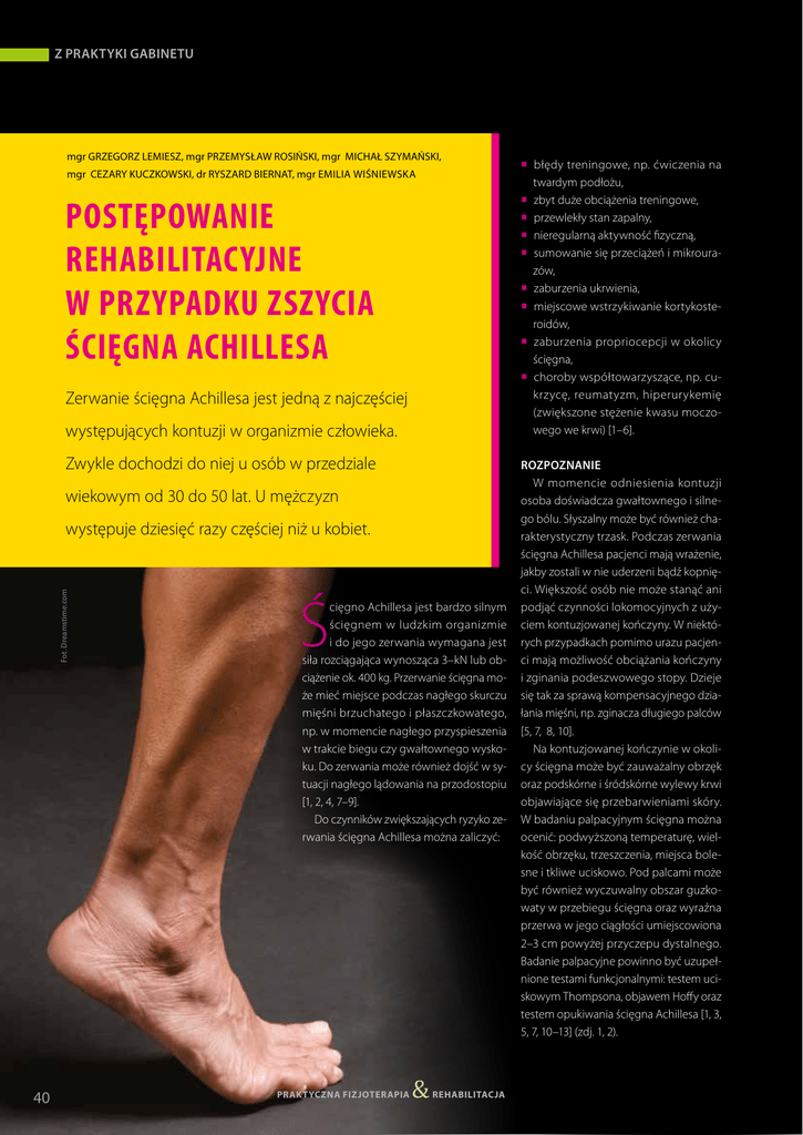 Z praktyki gabinetu mgr GRZEGORZ LEMIESZ, mgr PRZEMYSŁAW ROSIŃSKI, mgr MICHAŁ SZYMAŃSKI, mgr CEZARY KUCZKOWSKI, dr RYSZARD BIERNAT, mgr Emilia Wiśniewska Postępowanie rehabilitacyjne w przypadku zszycia ścięgna Achillesa Zerwanie ścięgna Achillesa jest jedną z najczęściej występujących kontuzji w organizmie człowieka. Zwykle dochodzi do niej u osób w przedziale wiekowym od 30 do 50 lat. U mężczyzn Fot. Dreamstime.com występuje dziesięć razy częściej niż u kobiet. 40 Ś cięgno Achillesa jest bardzo silnym ścięgnem w ludzkim organizmie i do jego zerwania wymagana jest siła rozciągająca wynosząca 3–kN lub obciążenie ok. 400 kg. Przerwanie ścięgna może mieć miejsce podczas nagłego skurczu mięśni brzuchatego i płaszczkowatego, np. w momencie nagłego przyspieszenia w trakcie biegu czy gwałtownego wyskoku. Do zerwania może również dojść w sytuacji nagłego lądowania na przodostopiu [1, 2, 4, 7–9]. Do czynników zwiększających ryzyko zerwania ścięgna Achillesa można zaliczyć: Praktyczna fizjoterapia & rehabilitacja błędy treningowe, np. ćwiczenia na twardym podłożu, zbyt duże obciążenia treningowe, przewlekły stan zapalny, nieregularną aktywność fizyczną, sumowanie się przeciążeń i mikrourazów, zaburzenia ukrwienia, miejscowe wstrzykiwanie kortykosteroidów, zaburzenia propriocepcji w okolicy ścięgna, choroby współtowarzyszące, np. cukrzycę, reumatyzm, hiperurykemię (zwiększone stężenie kwasu moczowego we krwi) [1–6]. Rozpoznanie W momencie odniesienia kontuzji osoba doświadcza gwałtownego i silnego bólu. Słyszalny może być również charakterystyczny trzask. Podczas zerwania ścięgna Achillesa pacjenci mają wrażenie, jakby zostali w nie uderzeni bądź kopnięci. Większość osób nie może stanąć ani podjąć czynności lokomocyjnych z użyciem kontuzjowanej kończyny. W niektórych przypadkach pomimo urazu pacjenci mają możliwość obciążania kończyny i zginania podeszwowego stopy. Dzieje się tak za sprawą kompensacyjnego działania mięśni, np. zginacza długiego palców [5, 7, 8, 10]. Na kontuzjowanej kończynie w okolicy ścięgna może być zauważalny obrzęk oraz podskórne i śródskórne wylewy krwi objawiające się przebarwieniami skóry. W badaniu palpacyjnym ścięgna można ocenić: podwyższoną temperaturę, wielkość obrzęku, trzeszczenia, miejsca bolesne i tkliwe uciskowo. Pod palcami może być również wyczuwalny obszar guzkowaty w przebiegu ścięgna oraz wyraźna przerwa w jego ciągłości umiejscowiona 2–3 cm powyżej przyczepu dystalnego. Badanie palpacyjne powinno być uzupełnione testami funkcjonalnymi: testem uciskowym Thompsona, objawem Hoffy oraz testem opukiwania ścięgna Achillesa [1, 3, 5, 7, 10–13] (zdj. 1, 2). Z praktyki gabinetu W diagnozowaniu zerwań ścięgna Achillesa pomocne mogą być badania obrazowe. Zdjęcie rentgenowskie (RTG) nie dostarczy informacji o tkankach miękkich, ale może ukazać zwapnienia w okolicy ścięgna oraz złamanie awulsyjne kości piętowej. Badanie rezonansem magnetycznym (magnetic resonance imaging – MRI) może pomóc w ocenie wielkości luki w ścięgnie, występowania krwotoku oraz stan i położenie rozdartych włókien. Podczas badania ultrasonograficznego (USG) możliwa jest ocena ścięgna w warunkach dynamicznych, co daje możliwość oceny objawu paradoksalnej ruchomości ścięgna. Przejawia się to tym, że podczas ruchów w stawie skokowym kikuty ścięgna oddalają się od siebie i zbliżają się do siebie [3, 8, 12, 14, 15]. Postępowanie operacyjne Przy całkowitych zerwaniach ścięgna Achillesa wyróżnia się zabiegi chirurgiczne otwarte i zamknięte. Do zabiegów otwartych zalicza się: technikę zespolenia „koniec do końca”, która polega na zszyciu obu kikutów ścięgna za pomocą szwów typu Kesslera lub Bunnela oraz zespolenia ścięgna za pomocą innych tkanek, np. ścięgna mięśnia strzałkowego krótkiego lub wycinka ze ścięgna mięśnia brzuchatego łydki (zespolenie Silverskjold) [3]. Do zabiegu zamkniętego zalicza się metodę szwu przezskórnego. Można ją zastosować, gdy do zerwania doszło 4–6 cm powyżej przyczepu na kości piętowej oraz gdy pod palcami wyraźnie wyczuwane są oba końce ścięgna. Metoda ta polega na wykonaniu sześciu małych nacięć wzdłuż przyśrodkowego i bocznego brzegu ścięgna i wprowadzeniu szwu zespalającego oba końce ścięgna [3, 12]. Postępowanie pooperacyjne Dawniej postępowanie po zespoleniu ścięgna Achillesa polegało na założeniu opatrunku gipsowego bądź szyny w podeszwowym zgięciu stopy. Takie ustawienie stosowało się przez 6 tygodni. W tym czasie zalecało się pacjentowi wykonywanie ćwiczeń izometrycznych mięśnia brzuchatego łydki. Po upływie wyżej wymienione- go czasu i zdjęciu unieruchomienia zaczynało się mobilizację ścięgna i rehabilitację [15]. Aktualnie odchodzi się od unieruchamiania ścięgna na tak długi okres na rzecz funkcjonalnej rehabilitacji. Zamiast sztywnego gipsu lub szyny stosuje się ortezę funkcjonalną. Umożliwia ona pełny zakres ruchu z wykluczeniem tylko zginania grzbietowego poza pozycję neutralną. Daje to możliwość ćwiczenia zakresu ruchomości oraz częściowego obciążania kończyny z użyciem kul od razu po zabiegu [4, 7, 12, 16]. Cele i zasady leczenia fizjoterapeutycznego bez unieruchomienia gipsowego Oczekując od rehabilitacji pożądanego efektu, należy zwrócić uwagę na następujące elementy: przedziały czasowe muszą być indywidualnie dopasowywane do pacjenta, należy unikać gwałtownych ruchów w stawie skokowym przez 10–12 tygodni, należy uważnie obserwować bliznę (pękanie skóry w okolicy blizny jest najczęstszym powikłaniem pooperacyjnym), bieganie, skoki, ćwiczenia balistyczne można rozpocząć po upływie 4–6 miesięcy, należy pamiętać o ćwiczeniach aerobowych, stabilizacyjnych i funkcjonalnych przez cały okres reh