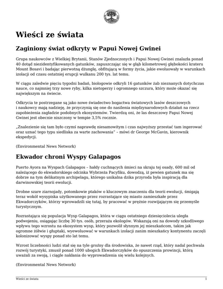 Wieści ze świata Zaginiony świat odkryty w Papui Nowej Gwinei Grupa naukowców z Wielkiej Brytanii, Stanów Zjednoczonych i Papui Nowej Gwinei znalazła ponad 40 dotąd niezidentyfikowanych gatunków, zapuszczając się w głąb kilometrowej głębokości krateru Mount Bosavi i badając pierwotną dżunglę, obfitującą w formy życia, jakie ewoluowały w warunkach izolacji od czasu ostatniej erupcji wulkanu 200 tys. lat temu. W ciągu zaledwie pięciu tygodni badań, biologowie odkryli 16 gatunków żab nieznanych dotychczas nauce, co najmniej trzy nowe ryby, kilka nietoperzy i ogromnego szczura, który może okazać się największym na świecie. Odkrycia te postrzegane są jako nowe świadectwo bogactwa światowych lasów deszczowych i naukowcy mają nadzieję, że przyczynią się one do nasilenia międzynarodowych działań na rzecz zapobieżenia zagładzie podobnych ekosystemów. Twierdzą oni, że las deszczowy Papui Nowej Gwinei jest obecnie niszczony w tempie 3,5% rocznie. „Znalezienie się tam było czymś naprawdę niesamowitym i czas najwyższy przestać tam ingerować oraz uznać tego typu siedliska za warte zachowania” – mówi dr George McGavin, kierownik ekspedycji. (Environmental News Network) Ekwador chroni Wyspy Galapagos Puerto Ayora na Wyspach Galapagos – hałdy cuchnących śmieci na skraju tej osady, 600 mil od należącego do ekwadorskiego odcinka Wybrzeża Pacyfiku, dowodzą, iż pewien gatunek ma się dobrze na tym delikatnym archipelagu, którego unikalna dzika przyroda była inspiracją dla darwinowskiej teorii ewolucji. Drobne szare ziarnojady, potomkowie ptaków o kluczowym znaczeniu dla teorii ewolucji, śmigają teraz wokół wysypiska użytkowanego przez rozrastające się miasto zamieszkałe przez Ekwadorczyków, którzy wprowadzili się tutaj, by pracować w prężnie rozwijającym się przemyśle turystycznym. Rozrastająca się populacja Wysp Galapagos, która w ciągu ostatniego dziesięciolecia uległa podwojeniu, osiągając liczbę 30 tys. osób, przeraża ekologów. Wskazują oni na dowody szkodliwego wpływu tego wzrostu na ekosystem wysp, który pozwolił słynnym jej mieszkańcom, takim jak ogromne żółwie i głuptaki, wyewoluować w warunkach izolacji zanim mieszkańcy kontynentu zaczęli kolonizować wyspy ponad sto lat temu. Wzrost liczebności ludzi stał się na tyle groźny dla środowiska, że nawet rząd, który nadal pochwala rozwój turystyki, zmusił ponad 1000 ubogich Ekwadorczyków do opuszczenia prowincji, którą uważali za swoją, i ciągle nakłania do wyprowadzenia się wielu kolejnych. (Environmental News Network) Wieści ze świata 1 Niedźwiedzie grizzly z Yellowstone powracają na Listę Gatunków Zagrożonych Sąd federalny w stanie Montana w USA przywrócił niedźwiedziom grizzly z Yellowstone status ochronny na mocy ustawy o gatunkach zagrożonych. fot. nagillum W toku postępowania wszczętego przez Greater Yellowstone Coalition, sędzia Danald Molloy uznał, iż mechanizmy regulacyjne, wprowadzone po zniesieniu federalnej ochrony na początku roku 2007, były nieadekwatne oraz że amerykańska Fish and Wildlife Service nie uwzględniła utraty podstawowego źródła pożywienia niedźwiedzi, jakim są nasiona sosny białej. Rada Ochrony Zasobów Naturalnych (National Resources Defence Council) wraz z kilkoma innymi grupami, reprezentowanymi przez Earthjustice, wszczęły podobne postępowanie sądowe w Idaho. Rada Ochrony Zasobów Naturalnych od lat silnie angażuje się w ochronę niedźwiedzi z Yellowstone i sosny białej. Lasy w nią obfitujące od lat są dziesiątkowane na całym obszarze ich występowania przez szereg czynników związanych ze zmianami klimatycznymi. Naukowcy obawiają się, że sosny te podlegają procesowi wymierania, dramatycznie zmieniając niektóre najbardziej charakterystyczne krajobrazy Ameryki oraz pozbawiając niedźwiedzie grizzly istotnego źródła pokarmu. Rada Ochrony Zasobów Naturalnych domagała się w grudniu 2008 r. dodania tego drzewa do federalnej Listy Gatunków Zagrożonych. Według Louisy Willcox, obrończyni przyrody reprezentującej NRDC, „Jest to szansa, by wcisnąć przycisk »reset« i wprowadzić sensowne posunięcia zanim będzie za późno. W związku z utratą sosny białej musimy podwoić wysiłki w kwestii przewidywania i minimalizowania konfliktów z ludnością: oznacza to upewnienie się, że ludzie utrzymują czystość w obozowiskach i posesjach, noszą spraye odstraszające niedźwiedzie i są przygotowani do bezpiecznego funkcjonowania w krainie grizzly”. (Environmental News Network) Topniejące indyjskie lodowce zagrażają milionom ludzi Indyjscy naukowcy alarmują, że przyspieszone topnienie lodowców w Kaszmirze zagraża milionom ludzi żyjącym w tym regionie. Geolodzy i geofizycy z Uniwersytetu Kaszmirskiego za topnienie lodowców obwiniają ocieplenie klimatu. Woda pochodząca z lodowców zagraża życiu dwóch trzecich z 10-milionowej populacji zamieszkującej rejon w pobliżu lodowców. Zagrożone są uprawy rolne, ogrodnictwo, hodowla zwierząt i leśnictwo. Według naukowców, największy lodowiec w Indiach – Kolahoi, skurczył się w ciągu minionych 40 lat z 13 km2 do około 11,5 km2 Profesor nadzwyczajny z uniwersytetu w Kaszmirze, Shakil Romshoo, który przez trzy lata prowadził badania nad lodowcami, określił tempo topnienia jako alarmujące. Wieści ze świata 2 Dodał, że łącznie lodowce występujące w regionie Kaszmiru zmniejszyły się o około 16% Wody z topniejącego lodowca Kolahoi zasilają rzekę Dżhelam (Jhelum) w północnych Indiach, która ma istotne znaczenie dla rolnictwa w pakistańskiej prowincji Pendżab. W ubiegłym roku międzynarodowa organizacja charytatywna ActionAid także ostrzegała, że w Kaszmirze kurczą się lodowce. Organizacja twierdzi, że ocieplający się klimat oddziałuje na warunki pogodowe, a te z kolei powodują zmniejszenie produkcji żywności. Geolog Rajeev Upadhay