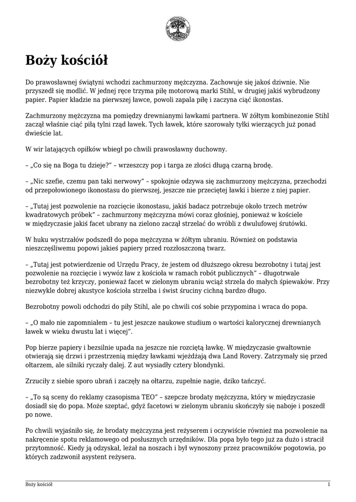 Boży kościół Do prawosławnej świątyni wchodzi zachmurzony mężczyzna. Zachowuje się jakoś dziwnie. Nie przyszedł się modlić. W jednej ręce trzyma piłę motorową marki Stihl, w drugiej jakiś wybrudzony papier. Papier kładzie na pierwszej ławce, powoli zapala piłę i zaczyna ciąć ikonostas. Zachmurzony mężczyzna ma pomiędzy drewnianymi ławkami partnera. W żółtym kombinezonie Stihl zaczął właśnie ciąć piłą tylni rząd ławek. Tych ławek, które szorowały tyłki wierzących już ponad dwieście lat. W wir latających opiłków wbiegł po chwili prawosławny duchowny. – „Co się na Boga tu dzieje?” – wrzeszczy pop i targa ze złości długą czarną brodę. – „Nic szefie, czemu pan taki nerwowy” – spokojnie odzywa się zachmurzony mężczyzna, przechodzi od przepołowionego ikonostasu do pierwszej, jeszcze nie przeciętej ławki i bierze z niej papier. – „Tutaj jest pozwolenie na rozcięcie ikonostasu, jakiś badacz potrzebuje około trzech metrów kwadratowych próbek” – zachmurzony mężczyzna mówi coraz głośniej, ponieważ w kościele w międzyczasie jakiś facet ubrany na zielono zaczął strzelać do wróbli z dwulufowej śrutówki. W huku wystrzałów podszedł do popa mężczyzna w żółtym ubraniu. Również on podstawia nieszczęśliwemu popowi jakieś papiery przed rozzłoszczoną twarz. – „Tutaj jest potwierdzenie od Urzędu Pracy, że jestem od dłuższego okresu bezrobotny i tutaj jest pozwolenie na rozcięcie i wywóz ław z kościoła w ramach robót publicznych” – długotrwale bezrobotny też krzyczy, ponieważ facet w zielonym ubraniu wciąż strzela do małych śpiewaków. Przy niezwykle dobrej akustyce kościoła strzelba i świst śruciny cichną bardzo długo. Bezrobotny powoli odchodzi do piły Stihl, ale po chwili coś sobie przypomina i wraca do popa. – „O mało nie zapomniałem – tu jest jeszcze naukowe studium o wartości kalorycznej drewnianych ławek w wieku dwustu lat i więcej”. Pop bierze papiery i bezsilnie upada na jeszcze nie rozciętą ławkę. W międzyczasie gwałtownie otwierają się drzwi i przestrzenią między ławkami wjeżdżają dwa Land Rovery. Zatrzymały się przed ołtarzem, ale silniki ryczały dalej. Z aut wysiadły cztery blondynki. Zrzuciły z siebie sporo ubrań i zaczęły na ołtarzu, zupełnie nagie, dziko tańczyć. – „To są sceny do reklamy czasopisma TEO” – szepcze brodaty mężczyzna, który w międzyczasie dosiadł się do popa. Może szeptać, gdyż facetowi w zielonym ubraniu skończyły się naboje i poszedł po nowe. Po chwili wyjaśniło się, że brodaty mężczyzna jest reżyserem i oczywiście również ma pozwolenie na nakręcenie spotu reklamowego od posłusznych urzędników. Dla popa było tego już za dużo i stracił przytomność. Kiedy ją odzyskał, leżał na noszach i był wynoszony przez pracowników pogotowia, po których zadzwonił asystent reżysera. Boży kościół 1 Ostatnie, co nieszczęśliwy pop zobaczył przed kolejną utratą przytomności, były wielkie beczki z napisem „Trucizna”, które przyniosła grupa ludzi w hermetycznych kombinezonach. Chłopi bez słowa zamknęli drzwi kościoła i zaczęli dookoła rozlewać zawartość kanistrów. Na ołtarzu wciąż tańczyły nagie kobiety, facet w zielonym ubraniu nadal strzelał do wróbli, oba Land Rovery zarzynały silniki, a zachmurzony mężczyzna wynosił rozcięty ikonostas. Reżyser spotu reklamowego stał na stercie rozciętych ławek i coś krzyczał do swojego asystenta. Zaczęły bić dzwony. *** Gdyby nieco zmodyfikować historię świątyni, otrzymamy historię naszych leśnych rezerwatów, naszych świętych zagajników. Historię naszych chronionych lasów. Fot. Effervescing Elephant, flickr.com Wstrząsającą historię małych obszarów, gdzie na podstawie dziwnych pozwoleń (a czasami i bez nich), podpartych naukowymi badaniami, w naszych leśnych świątyniach rżnie się drzewa, strzela do zwierząt, zostawia trucizny, jeździ autami, a na ołtarzach kręci tandetne filmy. Tym, czego brakuje naszemu społeczeństwu, nie są badania naukowe – w całym kraju robi się ich wystarczająco dużo, aby zostawić w spokoju chociaż te małe rezerwaty. Naszemu społeczeństwu brakuje moralności i etyki. I miłości do naszych leśnych rezerwatów. Juraj Lukáč Tłumaczenie Anna Patejuk Tekst pochodzi z internetowego bloga, który autor prowadzi pod adresem jurajlukac.blog.sme.sk na zaproszenie słowackiego dziennika „SME” (sme.sk). Przedruk za zgodą redakcji „SME”. Boży kościół 2