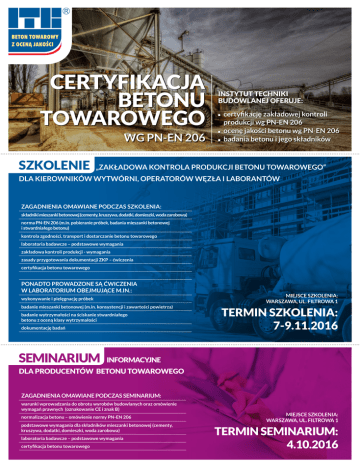 Certyfikacja betonu towarowego wg PN-EN 206 Instytut Techniki Budowlanej oferuje: certyfikację zakładowej kontroli produkcji wg PN-EN 206 ocenę jakości betonu wg PN-EN 206 badania betonu i jego składników Szkolenie „Zakładowa Kontrola Produkcji betonu towarowego” dla kierowników wytwórni, operatorów węzła i laborantów Zagadnienia omawiane podczas szkolenia: składniki mieszanki betonowej (cementy, kruszywa, dodatki, domieszki, woda zarobowa) norma PN-EN 206 (m.in. pobieranie próbek, badania mieszanki betonowej i stwardniałego betonu) kontrola zgodności, transport i dostarczanie betonu towarowego laboratoria badawcze – podstawowe wymagania zakładowa kontroli produkcji - wymagania zasady przygotowania dokumentacji ZKP – ćwiczenia certyfikacja betonu towarowego Ponadto prowadzone są ćwiczenia w laboratorium obejmujące m.in.: wykonywanie i pielęgnację próbek badanie mieszanki betonowej (m.in. konsystencji i zawartości powietrza) badanie wytrzymałości na ściskanie stwardniałego betonu z oceną klasy wytrzymałości dokumentację badań Seminarium Miejsce szkolenia: Warszawa, ul. Filtrowa 1 Termin szkolenia: 7-9.11.2016 informacyjne dla Producentów betonu towarowego Zagadnienia omawiane podczas seminarium: warunki wprowadzania do obrotu wyrobów budowlanych oraz omówienie wymagań prawnych (oznakowanie CE i znak B) normalizacja betonu – omówienie normy PN-EN 206 podstawowe wymagania dla składników mieszanki betonowej (cementy, kruszywa, dodatki, domieszki, woda zarobowa) laboratoria badawcze – podstawowe wymagania certyfikacja betonu towarowego Miejsce szkolenia: Warszawa, ul. Filtrowa 1 TERMIN SEMINARIUM: 4.10.2016 Certyfikacja betonu towarowego wg PN-EN 206 Kontakt: Zakład Certyfikacji: [email protected], tel. 22 57 96 167; [email protected], tel. 22 57 96 103 Zakład Konstrukcji Budowlanych i Geotechniki, Pracownia badań konstrukcji, betonu, łączników i podłoża budowlanego: [email protected], tel. 22 57 96 125 Szkolenie „Zakładowa Kontrola Produkcji betonu towarowego” dla kierowników wytwórni, operatorów węzła i laborantów Kontakt: Dział Marketingu: Zakład Konstrukcji Budowlanych i Geotechniki, Pracownia badań konstrukcji, betonu, łączników i podłoża budowlanego: [email protected], [email protected], tel. 22 57 96 125 tel. 22 57 96 132, 22 57 96 279 Seminarium informacyjne dla Producentów betonu towarowego Kontakt: Dział Marketingu: [email protected], tel. 22 57 96 132, 22 57 96 279 Zakład Certyfikacji: [email protected], tel. 22 57 96 167 [email protected], tel. 22 57 96 103 Zakład Konstrukcji Budowlanych i Geotechniki, Pracownia badań konstrukcji, betonu, łączników i podłoża budowlanego: [email protected], tel. 22 57 96 125