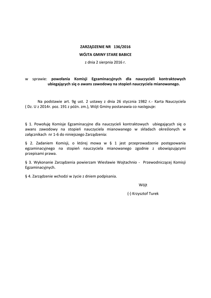 ZARZĄDZENIE NR 136/2016 WÓJTA GMINY STARE BABICE z dnia 2 sierpnia 2016 r. w sprawie: powołania Komisji Egzaminacyjnych dla nauczycieli kontraktowych ubiegających się o awans zawodowy na stopień nauczyciela mianowanego. Na podstawie art. 9g ust. 2 ustawy z dnia 26 stycznia 1982 r.- Karta Nauczyciela ( Dz. U z 2014r. poz. 191 z późn. zm.), Wójt Gminy postanawia co następuje: § 1. Powołuję Komisje Egzaminacyjne dla nauczycieli kontraktowych ubiegających się o awans zawodowy na stopień nauczyciela mianowanego w składach określonych w załącznikach nr 1-6 do niniejszego Zarządzenia: § 2. Zadaniem Komisji, o której mowa w § 1 jest przeprowadzenie postępowania egzaminacyjnego na stopień nauczyciela mianowanego zgodnie z obowiązującymi przepisami prawa. § 3. Wykonanie Zarządzenia powierzam Wiesławie Wojtachnio - Przewodniczącej Komisji Egzaminacyjnych. § 4. Zarządzenie wchodzi w życie z dniem podpisania. Wójt (-) Krzysztof Turek Załącznik Nr 1 do Zarządzenia Nr 136/2015 Wójta Gminy Stare Babice z dnia 2 sierpnia 2016 r. Skład Komisji Egzaminacyjnej do przeprowadzenia postępowania egzaminacyjnego dla nauczycieli: Pani Magdaleny Wielechowskiej i Pana Grzegorza Dryki, zatrudnionych w Gminnym Gimnazjum w Koczargach Starych: 1. Wiesława Wojtachnio - przedstawiciel organu prowadzącego - przewodnicząca 2. Jolanta Sulborska - przedstawiciel organu sprawującego nadzór pedagogiczny 3. Piotr Szczepkowski - dyrektor Gminnego Gimnazjum w Koczargach Starych 4. Katarzyna Janicka - ekspert z listy ustalonej przez Ministra Edukacji Narodowej 5. Tomasz Iwańczuk - ekspert z listy ustalonej przez Ministra Edukacji Narodowej Załącznik Nr 2 do Zarządzenia Nr 136/2015 Wójta Gminy Stare Babice z dnia 2 sierpnia 2016 r. Skład Komisji Egzaminacyjnej do przeprowadzenia postępowania egzaminacyjnego dla nauczyciela Pani Moniki Błądek, zatrudnionej w Gminnym Gimnazjum w Koczargach Starych: 1. Wiesława Wojtachnio - przedstawiciel organu prowadzącego – przewodnicząca 2. Jolanta Sulborska - przedstawiciel organu sprawującego nadzór pedagogiczny 3. Piotr Szczepkowski - dyrektor Gminnego Gimnazjum w Koczargach Starych 4. Katarzyna Janicka - ekspert z listy ustalonej przez Ministra Edukacji Narodowej 5. Regina Kabala-Maziarz - ekspert z listy ustalonej przez Ministra Edukacji Narodowej Załącznik Nr 3 do Zarządzenia Nr 136/2015 Wójta Gminy Stare Babice z dnia 2 sierpnia 2016 r. Skład Komisji Egzaminacyjnej do przeprowadzenia postępowania egzaminacyjnego dla nauczycieli: Pani Katarzyny Kujawka i Pani Doroty Fijoł, zatrudnionych w Szkole Podstawowej im. Henryka Sienkiewicza w Starych Babicach: 1. Wiesława Wojtachnio 2. Jolanta Sulborska 3. Dorota Smolińska 4. Katarzyna Janicka 5. Regina Kabala-Maziarz - przedstawiciel organu prowadzącego – przewodnicząca - przedstawiciel organu sprawującego nadzór pedagogiczny - dyrektor Szkoły Podstawowej w Starych Babicach - ekspert z listy ustalonej przez Ministra Edukacji Narodowej - ekspert z listy ustalonej przez Ministra Edukacji Narodowej Załącznik Nr 4 do Zarządzenia Nr 136/2015 Wójta Gminy Stare Babice z dnia 2 sierpnia 2016 r. Skład Komisji Egzaminacyjnej do przeprowadzenia postępowania egzaminacyjnego dla nauczycieli: Pani Pauliny Zaleskiej, Pani Anny Kozłowskiej i Pani Barbary Kornatowskiej, zatrudnionych w Szkole Podstawowej im. Henryka Sienkiewicza w Starych Babicach: 1. Wiesława Wojtachnio 2. Jolanta Sulborska 3. Dorota Smolińska - przedstawiciel organu prowadzącego – przewodnicząca - przedstawiciel organu sprawującego nadzór pedagogiczny - dyrektor Szkoły Podstawowej w Starych Babicach 4. Katarzyna Janicka - ekspert z listy ustalonej przez Ministra Edukacji Narodowej 5. Ewa Szmytkowska - ekspert z listy ustalonej przez Ministra Edukacji Narodowej Załącznik Nr 5 do Zarządzenia Nr 136/2015 Wójta Gminy Stare Babice z dnia 2 sierpnia 2016 r. Skład Komisji Egzaminacyjnej do przeprowadzenia postępowania egzaminacyjnego dla nauczyciela Pani Natalii Twardowskiej, zatrudnionego w Przedszkolu w Starych Babicach: 1. Wiesława Wojtachnio 2. Jolanta Sulborska 3. Bożenna Pyć - przedstawiciel organu prowadzącego – przewodnicząca - przedstawiciel organu sprawującego nadzór pedagogiczny - dyrektor Przedszkola w Starych Babicach 4. Katarzyna Janicka - ekspert z listy ustalonej przez Ministra Edukacji Narodowej 5. Ewa Szmytkowska - ekspert z listy ustalonej przez Ministra Edukacji Narodowej Załącznik Nr 6 do Zarządzenia Nr 136/2015 Wójta Gminy Stare Babice z dnia 2 sierpnia 2016 r. Skład Komisji Egzaminacyjnej do przeprowadzenia postępowania egzaminacyjnego dla nauczycieli: Pani Katarzyny Sowińskiej i Pani Kingi Anny Goraj, zatrudnionych w Zespole Szkolno Przedszkolnym w Borzęcinie Dużym: 1. Wiesława Wojtachnio - przedstawiciel organu prowadzącego – przewodnicząca 2. Jolanta Sulborska - przedstawiciel organu sprawującego nadzór pedagogiczny 3. Beata Błaszczak - dyrektor Zespołu Szkolno Przedszkolnym w Borzęcinie Dużym 4. Katarzyna Janicka - ekspert z listy ustalonej przez Ministra Edukacji Narodowej 5. Ewa Szmytkowska - ekspert z listy ustalonej przez Ministra Edukacji Narodowej