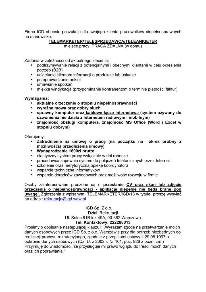 Firma IGD obecnie poszukuje dla swojego klienta pracowników niepełnosprawnych na stanowisko: TELEMARKETER/TELESPRZEDAWCA/TELEANKIETER miejsce pracy: PRACA ZDALNA (w domu) Zadania w zależności od aktualnego zlecenia: • podtrzymywanie relacji z potencjalnymi i obecnymi klientami w celu określenia potrzeb (B2B) • udzielanie klientom informacji o produkcie lub usłudze • przeprowadzanie ankiet • umawianie spotkań • miękka windykacja (przypominanie kontrahentom o terminie płatności faktur) Wymagania: • aktualne orzeczenie o stopniu niepełnosprawności • wyraźna mowa oraz dobry słuch • sprawny komputer oraz kablowe łącze internetowe (system używany do dzwonienia nie działa z Internetem radiowym i mobilnym) • znajomość obsługi komputera, znajomość MS Office (Word i Excel w stopniu dobrym) Oferujemy: • Zatrudnienie na umowę o pracę (na początku na okres próbny z możliwością przedłużenia umowy) • Wynagrodzenie 1600zł brutto • elastyczny system pracy wyłącznie w dni robocze • pracodawca zapewnia system do połączeń telefonicznych przez Internet • szkolenie oraz merytoryczną opiekę koordynatora • wsparcie techniczne informatyków • wsparcie doradców zawodowych oraz możliwość rozwoju w firmie Osoby zainteresowane proszone są o przesłanie CV oraz skan lub zdjęcie orzeczenia o niepełnosprawności - aplikacje niepełne nie będą brane pod uwagę!. Zgłoszenia z wpisanym TELEMARKETER/IGD/13 w tytule proszę wysyłać na adres : [email protected] IGD Sp. Z o.o. Dział Rekrutacji Ul. Solec 81B lok 49A, 00-382 Warszawa Tel. Kontaktowy: 222288013 Prosimy o dopisanie następującej klauzuli: „Wyrażam zgodę na przetwarzanie moich danych osobowych przez IGD Sp. z o.o. Warszawie przy dla potrzeb niezbędnych do realizacji procesu rekrutacyjnego, zgodnie z przepisami ustawy z 29.08.1997 o ochronie danych osobowych (Dz. U. z 2002 r. Nr 101, poz. 926 z późn. zm.) Przyjmuję do wiadomości, że przysługuje mi prawo wglądu do treści moich danych oraz ich poprawiania.“