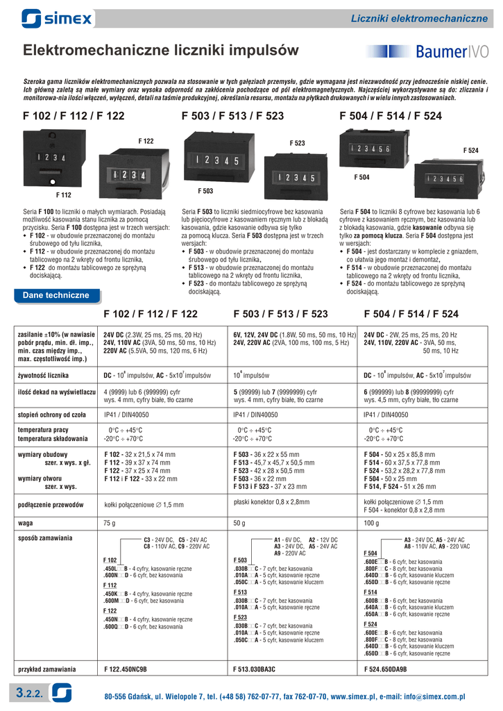 Liczniki elektromechaniczne Elektromechaniczne liczniki impulsów Szeroka gama liczników elektromechanicznych pozwala na stosowanie w tych ga³êziach przemys³u, gdzie wymagana jest niezawodnoœæ przy jednoczeœnie niskiej cenie. Ich g³ówn¹ zalet¹ s¹ ma³e wymiary oraz wysoka odpornoœæ na zak³ócenia pochodz¹ce od pól elektromagnetycznych. Najczêœciej wykorzystywane s¹ do: zliczania i monitorowa-nia iloœci w³¹czeñ, wy³¹czeñ, detali na taœmie produkcyjnej, okreœlania resursu, monta¿u na p³ytkach drukowanych i w wielu innych zastosowaniach. F 102 / F 112 / F 122 F 503 / F 513 / F 523 F 122 F 504 / F 514 / F 524 F 523 F 524 F 504 F 503 F 112 Seria F 100 to liczniki o ma³ych wymiarach. Posiadaj¹ mo¿liwoœæ kasowania stanu licznika za pomoc¹ przycisku. Seria F 100 dostêpna jest w trzech wersjach: w F 102 - w obudowie przeznaczonej do monta¿u œrubowego od ty³u licznika, w F 112 - w obudowie przeznaczonej do monta¿u tablicowego na 2 wkrêty od frontu licznika, w F 122 do monta¿u tablicowego ze sprê¿yn¹ dociskaj¹c¹. Dane techniczne Seria F 503 to liczniki siedmiocyfrowe bez kasowania lub piêciocyfrowe z kasowaniem rêcznym lub z blokad¹ kasowania, gdzie kasowanie odbywa siê tylko za pomoc¹ klucza. Seria F 503 dostêpna jest w trzech wersjach: w F 503 - w obudowie przeznaczonej do monta¿u œrubowego od ty³u licznika, w F 513 - w obudowie przeznaczonej do monta¿u tablicowego na 2 wkrêty od frontu licznika, w F 523 - do monta¿u tablicowego ze sprê¿yn¹ dociskaj¹c¹. Seria F 504 to liczniki 8 cyfrowe bez kasowania lub 6 cyfrowe z kasowaniem rêcznym, bez kasowania lub z blokad¹ kasowania, gdzie kasowanie odbywa siê tylko za pomoc¹ klucza. Seria F 504 dostêpna jest w wersjach: w F 504 - jest dostarczany w komplecie z gniazdem, co u³atwia jego monta¿ i demonta¿, w F 514 - w obudowie przeznaczonej do monta¿u tablicowego na 2 wkrêty od frontu licznika, w F 524 - do monta¿u tablicowego ze sprê¿yn¹ dociskaj¹c¹. F 102 / F 112 / F 122 F 503 / F 513 / F 523 F 504 / F 514 / F 524 zasilanie ±10% (w nawiasie pobór pr¹du, min. d³. imp., min. czas miêdzy imp., max. czêstotliwoœæ imp.) 24V DC (2.3W, 25 ms, 25 ms, 20 Hz) 24V, 110V AC (3VA, 50 ms, 50 ms, 10 Hz) 220V AC (5.5VA, 50 ms, 120 ms, 6 Hz) 6V, 12V, 24V DC (1.8W, 50 ms, 50 ms, 10 Hz) 24V, 220V AC (2VA, 100 ms, 100 ms, 5 Hz) 24V DC - 2W, 25 ms, 25 ms, 20 Hz 24V, 110V, 220V AC - 3VA, 50 ms, 50 ms, 10 Hz ¿ywotnoœæ licznika DC - 10 impulsów, AC - 5x10 impulsów 10 impulsów DC - 10 impulsów, AC - 5x10 impulsów iloœæ dekad na wyœwietlaczu 4 (9999) lub 6 (999999) cyfr wys. 4 mm, cyfry bia³e, t³o czarne 5 (99999) lub 7 (9999999) cyfr wys. 4 mm, cyfry bia³e, t³o czarne 6 (999999) lub 8 (99999999) cyfr wys. 4,5 mm, cyfry bia³e, t³o czarne stopieñ ochrony od czo³a IP41 / DIN40050 IP41 / DIN40050 IP41 / DIN40050 temperatura pracy temperatura sk³adowania 0° C¸ +45° C -20° C¸ +70° C 0° C¸ +45° C -20° C¸ +70° C 0° C¸ +45° C -20° C¸ +70° C wymiary obudowy szer. x wys. x g³. F 102 - 32 x 21,5 x 74 mm F 112 - 39 x 37 x 74 mm F 122 - 37 x 25 x 74 mm F 112 i F 122 - 33 x 22 mm F 503 - 36 x 22 x 55 mm F 513 - 45,7 x 45,7 x 50,5 mm F 523 - 42 x 28 x 50,5 mm F 503 - 36 x 22 mm F 513 i F 523 - 37 x 23 mm F 504 - 50 x 25 x 85,8 mm F 514 - 60 x 37,5 x 77,8 mm F 524 - 53,2 x 28,2 x 77,8 mm F 504 - 50 x 25 mm F 514, F 524 - 51 x 26 mm pod³¹czenie przewodów ko³ki po³¹czeniowe A 1,5 mm p³aski konektor 0,8 x 2,8mm ko³ki po³¹czeniowe A 1,5 mm F 504 - konektor 0,8 x 2,8 mm waga 75 g 50 g 100 g wymiary otworu szer. x wys. sposób zamawiania 8 7 C3 - 24V DC, C5 - 24V AC C8 - 110V AC, C9 - 220V AC F 102 .450L B - 4 cyfry, kasowanie rêczne .600N D - 6 cyfr, bez kasowania F 112 .450K B - 4 cyfry, kasowanie rêczne .600M D - 6 cyfr, bez kasowania F 122 .450N B - 4 cyfry, kasowanie rêczne .600Q D - 6 cyfr, bez kasowania przyk³ad zamawiania 3.2.2. F 122.450NC9B 6 8 A1 - 6V DC, A2 - 12V DC A3 - 24V DC, A5 - 24V AC A9 - 220V AC F 503 .030B C - 7 cyfr, bez kasowania .010A A - 5 cyfr, kasowanie rêczne .050C A - 5 cyfr, kasowanie kluczem F 513 .030B C - 7 cyfr, bez kasowania .010A A - 5 cyfr, kasowanie rêczne F 523 .030B C - 7 cyfr, bez kasowania .010A A - 5 cyfr, kasowanie rêczne .050C A - 5 cyfr, kasowanie kluczem F 513.030BA3C 7 A3 - 24V DC, A5 - 24V AC A8 - 110V AC, A9 - 220 VAC F 504 .600E B - 6 cyfr, bez kasowania .800F C - 8 cyfr, bez kasowania .640D B - 6 cyfr, kasowanie kluczem .650D B - 6 cyfr, kasowanie rêczne F 514 .600B B - 6 cyfr, bez kasowania .640A B - 6 cyfr, kasowanie kluczem .650A B - 6 cyfr, kasowanie rêczne F 524 .600E B - 6 cyfr, bez kasowania .800F C - 8 cyfr, bez kasowania .640D B - 6 cyfr, kasowanie kluczem .650D B - 6 cyfr, kasowanie rêczne F 524.650DA9B 80-556 Gdañsk, ul. Wielopole 7, tel. (+48 58) 762-07-77, fax 762-07-70, www.simex.pl, e-mail: [email protected]