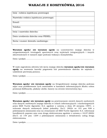 WAKACJE Z KOSZYKÓWKĄ 2016 Imię rodzica (opiekuna prawnego) Nazwisko rodzica (opiekuna prawnego) Email: Telefon: Imię i nazwisko dziecka: Data urodzenia dziecka oraz PESEL: Seria i numer dowodu osobistego: Wyrażam zgodę/ nie wyrażam zgody na uczestnictwo mojego dziecka w zorganizowanych treningach sportowych oraz wyjściach integracyjnych i innych aktywnościach w ramach zajęć podczas wakacji z koszykówką Data i podpis ………………………………………………………………………………………… W razie zagrożenia zdrowia lub życia mojego dziecka wyrażam zgodę/nie wyrażam zgody na wezwanie karetki pogotowia lub przewiezienie dziecka do szpitala i udzielenie pierwszej pomocy. Data i podpis ………………………………………………………………………….……………… Wyrażam zgodę/ nie wyrażam zgody na fotografowanie mojego dziecka podczas zajęć oraz publikowanie tych materiałów w kanałach informacyjnych Klubu celem promocji (billboardy, plakaty ulotki, banery na stronie internetowej itp.) Data i podpis ……………………………………………………………………………..………… Wyrażam zgodę/ nie wyrażam zgody na przetwarzanie swoich danych osobowych oraz danych osobowych mojego dziecka w celach informacyjnych i marketingowych przez KKS Turów Zgorzelec S.A. zgodnie z ustawą z dnia 29 sierpnia 1997r. o ochronie danych osobowych (tekst jednolity: Dz.U. 2002r nr 101 poz 926 z późniejszymi zmianami) oraz na otrzymanie od KKS Turów Zgorzelec S.A. informacji handlowych poprzez sms oraz drogą elektroniczną zgodnie z ustawą z 18.07.2002r (Dz.U. nr 144 poz. 1204 z późniejszymi zmianami) o świadczeniu usług drogą elektroniczną. Data i podpis ……………………………………………………………………………..…………