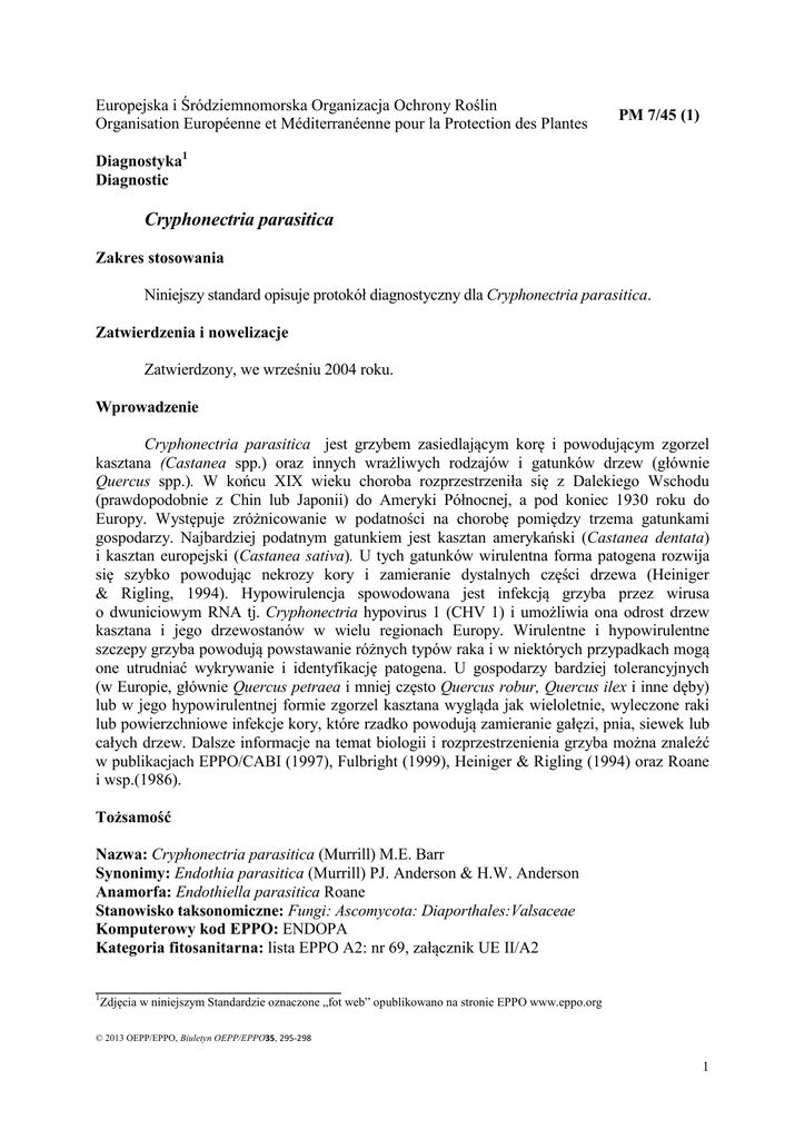 Europejska i Śródziemnomorska Organizacja Ochrony Roślin Organisation Européenne et Méditerranéenne pour la Protection des Plantes PM 7/45 (1) Diagnostyka1 Diagnostic Cryphonectria parasitica Zakres stosowania Niniejszy standard opisuje protokół diagnostyczny dla Cryphonectria parasitica. Zatwierdzenia i nowelizacje Zatwierdzony, we wrześniu 2004 roku. Wprowadzenie Cryphonectria parasitica jest grzybem zasiedlającym korę i powodującym zgorzel kasztana (Castanea spp.) oraz innych wrażliwych rodzajów i gatunków drzew (głównie Quercus spp.). W końcu XIX wieku choroba rozprzestrzeniła się z Dalekiego Wschodu (prawdopodobnie z Chin lub Japonii) do Ameryki Północnej, a pod koniec 1930 roku do Europy. Występuje zróżnicowanie w podatności na chorobę pomiędzy trzema gatunkami gospodarzy. Najbardziej podatnym gatunkiem jest kasztan amerykański (Castanea dentata) i kasztan europejski (Castanea sativa). U tych gatunków wirulentna forma patogena rozwija się szybko powodując nekrozy kory i zamieranie dystalnych części drzewa (Heiniger & Rigling, 1994). Hypowirulencja spowodowana jest infekcją grzyba przez wirusa o dwuniciowym RNA tj. Cryphonectria hypovirus 1 (CHV 1) i umożliwia ona odrost drzew kasztana i jego drzewostanów w wielu regionach Europy. Wirulentne i hypowirulentne szczepy grzyba powodują powstawanie różnych typów raka i w niektórych przypadkach mogą one utrudniać wykrywanie i identyfikację patogena. U gospodarzy bardziej tolerancyjnych (w Europie, głównie Quercus petraea i mniej często Quercus robur, Quercus ilex i inne dęby) lub w jego hypowirulentnej formie zgorzel kasztana wygląda jak wieloletnie, wyleczone raki lub powierzchniowe infekcje kory, które rzadko powodują zamieranie gałęzi, pnia, siewek lub całych drzew. Dalsze informacje na temat biologii i rozprzestrzenienia grzyba można znaleźć w publikacjach EPPO/CABI (1997), Fulbright (1999), Heiniger & Rigling (1994) oraz Roane i wsp.(1986). Tożsamość Nazwa: Cryphonectria parasitica (Murrill) M.E. Barr Synonimy: Endothia parasitica (Murrill) PJ. Anderson & H.W. Anderson Anamorfa: Endothiella parasitica Roane Stanowisko taksonomiczne: Fungi: Ascomycota: Diaporthales:Valsaceae Komputerowy kod EPPO: ENDOPA Kategoria fitosanitarna: lista EPPO A2: nr 69, załącznik UE II/A2 _______________________________ 1 Zdjęcia w niniejszym Standardzie oznaczone „fot web” opublikowano na stronie EPPO www.eppo.org © 2013 OEPP/EPPO, Biuletyn OEPP/EPPO35, 295-298 1 Wykrywanie Rośliny żywicielskie mogą przenosić grzyba w korze lub drewnie. Objawy powodowane przez szczepy wirulentne Choroba w jej typowej, wirulentnej formie jest łatwa do rozpoznania, ponieważ zawsze towarzyszy jej rozległa nekroza kory. U C. sativa uprawianych na owoce (sadzonkach, młodych i ostatnio szczepionych drzewach) objawy na korze (nekrozy) są zróżnicowanie, a ich zabarwienie w porównaniu do naturalnego, oliwkowego koloru nieporażonej kory jest od jasnobrązowego poprzez żółtobrązowy lub pomarańczowy do czerwonobrązowego. Na szczepionych drzewach infekcje są najczęściej znajdowane w miejscach szczepienia, gdzie tworzy się kallus. W sadach lub zagajnikach, infekcje są często umiejscowione u podstawy pnia (pierścienie lub w miejscu szczepienia). Kambium pod zainfekowaną korą jest martwe, a kora może być zapadnięta lub nabrzmiała. Pęknięcia mogą również tworzyć się na porażonej powierzchni kory. Pod korą są zwykle obecne charakterystyczne płowożółte, spłaszczone wachlarze grzybni. W pewnej odległości od zaawansowanej części nekrozy rozwijają się liczne, żółte do żółtopomarańczowych stromy, każda zawierająca jedną, rzadziej więcej konidiomatę (komorowe piknidia). W warunkach wilgotnych, mogą z nich wydobywać się pokręcone, żółto zabarwione wąsy, zawierające lepkie konidia. Wąsy mogą być dłuższe niż 1 cm, a ich tworzenie można sztucznie indukować przez inkubację zainfekowanej kory w komorach wilgotnych. Stroma jest na wpół zagłębiona w korze. Po obfitej produkcji konidiów, w tym samym miejsce tworzy się askostroma. Stara stroma ma zabarwienie ceglano-czerwone do czerwono-brązowego i może zawierać liczne, butelkowatego kształtu perytecja z długimi szyjkami, głęboko osadzone w stromie. Ostiole (ujścia) perytecjów można obserwować za pomocą ręcznego szkła powiększającego i wyglądają one, jak czarne kropki na brodawkowatych wypukłościach powierzchni stromy. Stare infekcje charakteryzują się podłużnymi pęknięciami i martwą korą oraz widocznym pod nią drewnem. Na odkrytym drewnie są często widoczne pozostałości suchych, jasnobrązowych mat grzybni. Sadzonki i młode drzewa Quercus spp. rzadko ulegają infekcji. Objawy są miejscowe i zawierają wolno rozwijające się raki, które ostatecznie mogą powodować zamieranie pojedynczych gałęzi. Plantacje produkcyjne C. sativa i Quercus spp. wykazują objawy, jak opisano wyżej. Na plantacjach często obserwuje się pozostałości pędów przybyszowych, które często rozwijają się zaraz poniżej infekcji i tworzą pierścień wokół drzewa. Porażone części plantacji są często hipertroficzne. W kłodach, w starszej, grubej i popękanej korze mogą nie występować objawy jej przebarwienia. Wachlarze grzybni znajduje się w wewnętrznych i/lub zewnętrznych warstwach luźnej/popękanej kory i/lub warstwy kambium. Niektóre roczne przyrosty bieli podkorowej mogą również ulegać infekcji, chociaż nie tworzą się tam wachlarze grzybni. Na popękanej korze tworzy się stroma z konidiomatą i askomatą. Okorowane drewno C. sativa może być schronieniem dla grzybni (jako pozostałość), i występuje w warstwie kambium i w bielu. Jasnobrązowe, zwykle suche, martwe wachlarze grzybni mogą być widoczne na powierzchni drewna. Stroma lub obnażona konidiomata mogą rozwijać się na bielu podkorowym, najczęściej są powszechne w miejscach cięcia. Fragm