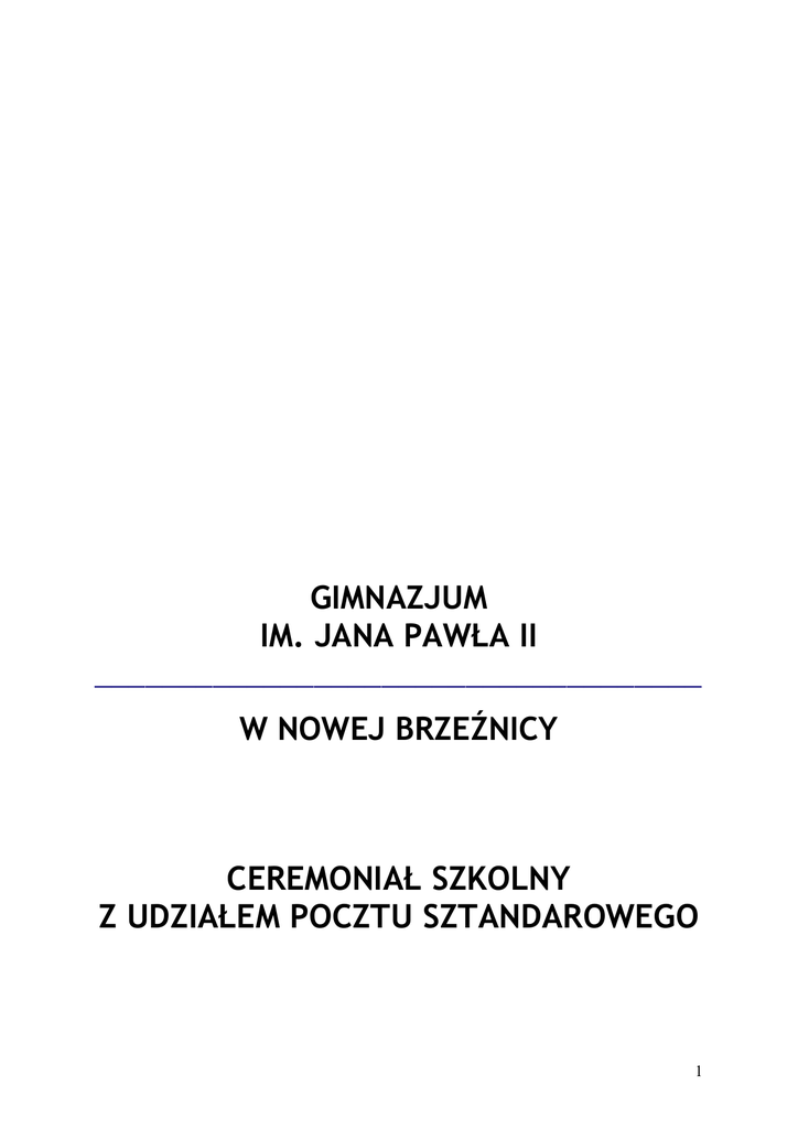 GIMNAZJUM IM. JANA PAWŁA II ____________________________________ W NOWEJ BRZEŹNICY CEREMONIAŁ SZKOLNY Z UDZIAŁEM POCZTU SZTANDAROWEGO 1 Ceremoniał szkolny jest opisem przeprowadzenia uroczystości z udziałem sztandaru szkolnego i samej celebracji sztandaru. Stanowi integralną część z przyjętą tradycją szkolną oraz harmonogramem uroczystości i imprez szkolnych. Jest zbiorem zasad zachowania młodzieŜy w trakcie uroczystości szkolnych dotyczących w szczególności właściwych postaw patriotycznych uczniów oraz szacunku do symboli narodowych i szkolnych. Sztandar szkolny: 1) Sztandar szkolny dla społeczności szkolnej jest symbolem Polski – Narodu – Małej Ojczyzny, jaką jest szkoła i najbliŜsze otoczenie. 2) Uroczystości z udziałem sztandaru wymagają zachowania powagi, a przechowywanie, transport i przygotowanie sztandaru do prezentacji, właściwych postaw jego poszanowania. 3) Sztandar jest przechowywany w zamkniętej gablocie na terenie szkoły. 4) Udział sztandaru w uroczystościach szkolnych: uroczyste rozpoczęcie roku szkolnego ceremonia ślubowania klas pierwszych święto patrona szkoły i inne uroczystości związane z patronem Dzień Edukacji Narodowej uroczystości nawiązujące do rocznic waŜnych wydarzeń historycznych ceremonia przekazania i zaprzysięŜenia nowego pocztu sztandarowego uroczyste zakończenie roku szkolnego uroczyste okolicznościowe akademie szkolne powitanie szczególnych gości odwiedzających szkołę: prezydenta, premiera, marszałka sejmu, ministra oświaty, wojewody, biskupa lub marszałka sejmiku wojewódzkiego uroczyste Msze Święte związane z patronem. 5) W przypadku, gdy poczet sztandarowy uczestniczy w uroczystościach pogrzebowych lub ogłoszono Ŝałobę narodową, sztandar powinien być ozdobiony czarnym kirem. WstąŜkę kiru przywiesza się w miejscu jego zamocowania na drzewcu od lewej górnej strony do prawej. 2 Poczet sztandarowy: 1) Skład osobowy pocztu sztandarowego tworzą: 1 chorąŜy (chłopak) i 2 asystujących (dziewczyny). Powołuje się równieŜ „rezerwowy” skład Pocztu Sztandarowego (1 chorąŜy i 2 asystujących), jako nominalnie równowaŜny rangą. 2) Pełnienie funkcji chorąŜego i osób asystujących jest jedną z najbardziej zaszczytnych funkcji w karierze uczniowskiej. 3) Poczet Sztandarowy powinien być wytypowany spośród uczniów klas II wyróŜniających się w nauce, o nienagannej postawie i wzorowym zachowaniu. W szczególnie uzasadnionych przypadkach dopuszcza się moŜliwość typowania do pocztu sztandarowego uczniów z bardzo dobrą oceną zachowania. 4) Kandydatury do składu pocztu sztandarowego są przedstawione przez wychowawców klas oraz samorząd uczniowski do opiekuna pocztu sztandarowego w terminie do 15 maja danego roku szkolnego. 5) Skład Pocztu Sztandarowego zatwierdza Rada Pedagogiczna na posiedzeniu w terminie do 31 maja danego roku. 6) Kadencja pocztu sztandarowego trwa jeden rok (począwszy od przekazania w dniu uroczystego zakończenia roku szkolnego). 7) O wyborze uczniów do pocztu sztandarowego powiadamia się rodziców/opiekunów prawnych w formie pisemnej. 8) Za niewłaściwe realizowanie obowiązków pocztowego, a w szczególności braku naleŜytego szacunku dla sztandaru i nieprzestrzegania ceremoniału, a takŜe innych uchybień statutu szkolnego (na wniosek opiekuna sztandaru lub innego uprawnionego organu szkoły) decyzją rady pedagogicznej uczniowie mogą być odwołani ze składu pocztu sztandarowego. W takiej sytuacji dokonuje się wyboru uzupełniającego. 9) Ubiór pocztu sztandarowego powinien być odświętny: chorąŜy – ciemny garnitur i biała koszula asystujący – białe bluzki i czarne lub granatowe spódnice oraz ciemne buty 10) Insygnia pocztu sztandarowego: biało-czerwone szarfy przewieszone przez prawe ramię, zwrócone kolorem białym w stronę kołnierza, spięte na lewym biodrze białe rękawiczki 3 11) Insygnia pocztu sztandarowego przechowywane są w sekretariacie szkoły. 12) Poczet sztandarowy wchodzi na miejsce uroczystości w ustawieniu obok siebie, przy czym chorąŜy idzie w środku. Jeśli droga przemarszu jest wąska dopuszcza się przemarsz „gęsiego”, przy czym osoba trzymająca sztandar idzie w środku. Poczet zajmuje miejsce po lewej lub prawej stronie sali, ustawia się przodem do zgromadzonych i podnosi sztandar do pionu. 13) Podczas dłuŜszych przemarszów dopuszcza się moŜliwość trzymania sztandaru na ramieniu. Jednak przy wchodzeniu na salę lub plac uroczystości zawsze naleŜy pochylić go do przodu. 14) W czasie uroczystości kościelnych sztandar jest wprowadzany i wyprowadzany bez podawania komend. W czasie wprowadzania sztandaru wszyscy wstają. Poczet przechodzi przez kościół, trzymając sztandar pod kątem 45º do przodu i staje po lewej lub prawej stronie bokiem do ołtarza i do zgromadzonych ludzi, podnosząc sztandar do pionu. W trakcie Mszy Świętej lub innej uroczystości członkowie pocztu nie klękają, nie przekazują znaku pokoju i nie wykonują Ŝadnych innych gestów. 15) Pochylenie sztandaru pod kątem 45º do przodu w pozycji „Baczność” następuje w sytuacjach: podczas kaŜdego podniesienia Hostii: w czasie Przeistoczenia, przed Komunią Św., oraz w trakcie trzykrotnego podniesienia Monstrancji przy Wystawieniu Najświętszego Sakramentu; podczas ogłoszenia minuty ciszy dla uczczenia czyjejś pamięci; podczas składania wieńców, kwiatów i zniczy przez wyznaczone delegacje; na kaŜde polecenie opuszczenia sztandaru wydane przez księdza lub inną przemawiającą osobę. 16) Poczet sztandarowy opuszcza miejsce uroczystości przed częścią artystyczną. 4 Ceremoniał uroczystości szkolnych z udziałem sztandaru: Postawy Opis chwytu Zastosowanie komendy Postawa zasadnicza Sztandar postawiony na trzewiku drzewca przy prawej nodze na wysokości czubka buta. Drzewce podtrzymywane prawą ręką powyŜej pasa, łokieć prawej ręki lekko przyciśnięty do cia