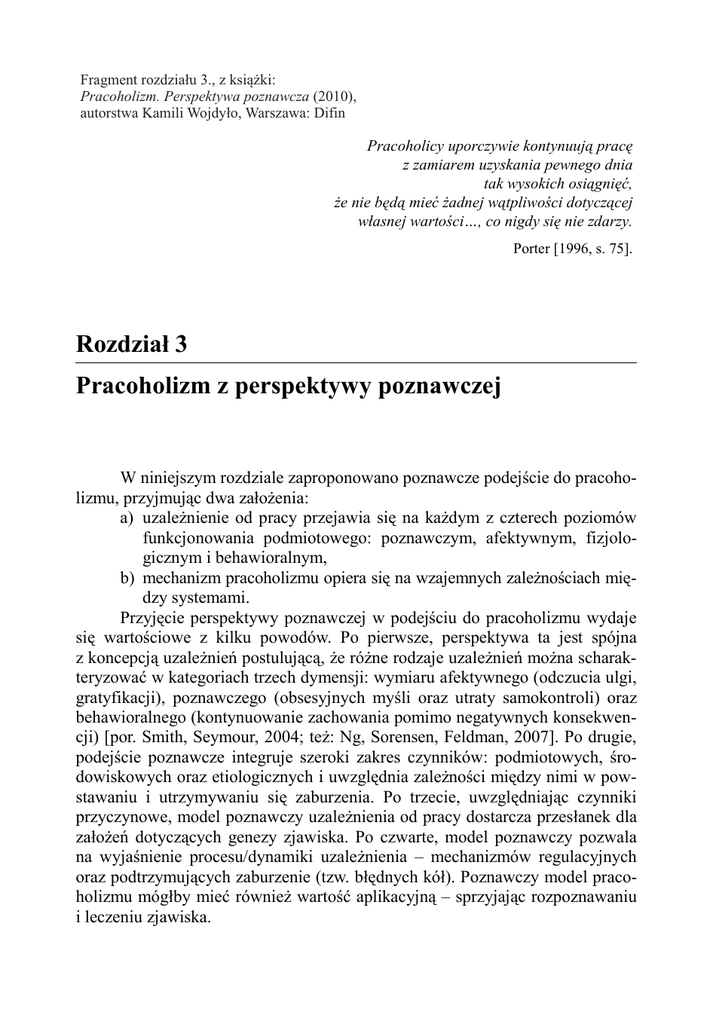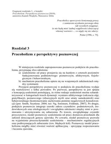 Fragment rozdzia³u 3., z ksi¹¿ki: Pracoholizm. Perspektywa poznawcza (2010), autorstwa Kamili Wojdy³o, Warszawa: Difin Pracoholicy uporczywie kontynuują pracę z zamiarem uzyskania pewnego dnia tak wysokich osiągnięć, że nie będą mieć żadnej wątpliwości dotyczącej własnej wartości…, co nigdy się nie zdarzy. Porter [1996, s. 75]. Rozdział 3 Pracoholizm z perspektywy poznawczej W niniejszym rozdziale zaproponowano poznawcze podejście do pracoholizmu, przyjmując dwa założenia: a) uzależnienie od pracy przejawia się na każdym z czterech poziomów funkcjonowania podmiotowego: poznawczym, afektywnym, fizjologicznym i behawioralnym, b) mechanizm pracoholizmu opiera się na wzajemnych zależnościach między systemami. Przyjęcie perspektywy poznawczej w podejściu do pracoholizmu wydaje się wartościowe z kilku powodów. Po pierwsze, perspektywa ta jest spójna z koncepcją uzależnień postulującą, że różne rodzaje uzależnień można scharakteryzować w kategoriach trzech dymensji: wymiaru afektywnego (odczucia ulgi, gratyfikacji), poznawczego (obsesyjnych myśli oraz utraty samokontroli) oraz behawioralnego (kontynuowanie zachowania pomimo negatywnych konsekwencji) [por. Smith, Seymour, 2004; też: Ng, Sorensen, Feldman, 2007]. Po drugie, podejście poznawcze integruje szeroki zakres czynników: podmiotowych, środowiskowych oraz etiologicznych i uwzględnia zależności między nimi w powstawaniu i utrzymywaniu się zaburzenia. Po trzecie, uwzględniając czynniki przyczynowe, model poznawczy uzależnienia od pracy dostarcza przesłanek dla założeń dotyczących genezy zjawiska. Po czwarte, model poznawczy pozwala na wyjaśnienie procesu/dynamiki uzależnienia – mechanizmów regulacyjnych oraz podtrzymujących zaburzenie (tzw. błędnych kół). Poznawczy model pracoholizmu mógłby mieć również wartość aplikacyjną – sprzyjając rozpoznawaniu i leczeniu zjawiska. 54 Rozdział 3 Podstawą sformułowania poznawczej koncepcji pracoholizmu, prezentowanej w niniejszym rozdziale są dotychczasowe, wybrane wyniki badań empirycznych. 3.1. Model zaburzeń w ujęciu poznawczym 3.1.1. Podstawowe założenia modelu W paradygmacie poznawczym funkcjonowanie człowieka spostrzegane jest w kontekście wzajemnych relacji pomiędzy procesami myślenia, emocjami i zachowaniem. Decydujące znaczenie przypisuje się procesom poznawczym zakładając, że determinują stan emocjonalny, reakcje organizmu oraz sposób zachowania się jednostki. W systemie poznawczym wyróżnia się trzy główne składowe decydujące o optymalnym lub dysfunkcjonalnym funkcjonowaniu podmiotu, tj. powstawaniu i utrzymywaniu się zaburzenia. Są to: myśli automatyczne (najbardziej dostępne poznawczo struktury), przekonania kluczowe (struktury leżące u podstaw myśli zwane również schematami poznawczymi), oraz dysfunkcjonalne założenia (przekonania pośredniczące lub warunkowe) [Beck, 2005; Curwen i in., 2006; też: Kokoszka, 2009; Popiel, Pragłowska, 2008]. Przyjmuje się, że w myślach automatycznych zawarte są zniekształcenia poznawcze, w związku z czym aktywacja treści poznawczych w odpowiedzi na dane zdarzenie wyzwala określone negatywne konsekwencje – stany emocjonalne, fizjologiczne oraz objawy behawioralne (zachowania motoryczne i werbalne), charakterystyczne dla określonego zaburzenia (patrz: rycina 5). Dysfunkcjonalne funkcjonowanie podmiotu jest podtrzymywane, ponieważ wszystkie cztery elementy zwrotnie wzajemnie na siebie oddziałują. Na przykład nieadaptacyjne zachowania (unikanie) podtrzymują zwrotnie określone treści myślowe („Nie jestem dość dobry”). Z analizy wzajemnych zależności między elementami modelu poznawczego, zilustrowanego na rycinie 5, wynika, że powstawanie i utrzymywanie się określonych zaburzonych reakcji jest warunkowane wystąpieniem trzech procesów: aktywacji zdarzenia (A), wyzwalania dezadaptacyjnych treści myślowych (B) oraz występowania określonych konsekwencji (C). Cykl wymienionych procesów, determinujących funkcjonowanie człowieka w podejściu poznawczym określa się zasadą „ABC”. Zasada ta wywodzi się z koncepcji Alberta Ellisa [1999], dotyczącej funkcjonowania osobowości w kategoriach triady (A – wydarzenia aktywizującego, B – przekonań, C – konsekwencji) oraz modelu depresji Aarona Becka [1967]. 55 Pracoholizm z perspektywy poznawczej Rycina 5. Model poznawczy funkcjonowania osobowości B Przekonania kluczowe A Aktywuj¹ce wydarzenie Przekonania poœrednicz¹ce zasady za³o¿enia postawy Myœli automatyczne Emocje Zachowanie Fizjologia C Legenda: A – wydarzenie aktywuj¹ce, B – treœci poznawcze, C – konsekwencje Źródło: Opracowanie własne na podstawie: Ellis [1999]; Beck [1967]. 3.1.2. Poznawcze elementy stanów psychopatologicznych W modelach poznawczych przyjmuje się, że zaburzenia kliniczne można rozróżnić na podstawie konkretnych przekonań (struktur poznawczych) i strategii przetwarzania informacji (procesów poznawczych) [Freeman, Reinecke, 1995]. Trzy rodzaje elementów poznawczych (przekonania, dysfunkcjonalne założenia oraz myśli automatyczne) uznawane są za nieprzystosowawcze wzorce reagowania, nabyte w procesie gromadzenia doświadczenia i obserwacji oraz podlegające restrukturyzacji poznawczej (patrz: rycina 5, „B”). Warto wspomnieć, że przekonania zwane są „gorącymi elementami poznawczymi” (hot cognitions) w odróżnieniu od „zimnych elementów poznawczych” (cold cognitions), do których należą myśli automatyczne oraz procesy poznawcze [Dowd, 2006]. 56 Rozdział 3 Przekonania (np. „Nie jestem dość dobry”, „Nie ma na świecie sprawiedliwości”) stanowią względnie trwałe elementy systemu poznawczego. Są to struktury poznawcze, które powstają w wyniku doświadczeń wczesnego dzieciństwa, definiują tożsamość podmiotu i wyznaczają sposób klasyfikacji, interpretacji i nadawania znaczenia bodźcom. Na podstawie bada