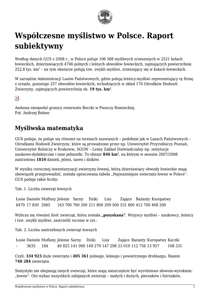 Współczesne myślistwo w Polsce. Raport subiektywny Według danych GUS z 2008 r., w Polsce poluje 106 588 myśliwych zrzeszonych w 2521 kołach łowieckich, dzierżawiących 4746 polnych i leśnych obwodów łowieckich, zajmujących powierzchnię 252,8 tys. km2 – na tym obszarze polują tzw. zwykli myśliwi, zrzeszający się w kołach łowieckich. W zarządzie Administracji Lasów Państwowych, gdzie polują leśnicy-myśliwi reprezentujący tę firmę z urzędu, pozostaje 257 obwodów łowieckich, wchodzących w skład 176 Ośrodków Hodowli Zwierzyny, zajmujących powierzchnię ok. 19 tys. km2. Ambona nieopodal granicy rezerwatu Boczki w Puszczy Rominckiej. Fot. Andrzej Bobiec Myśliwska matematyka GUS podaje, że poluje się również na terenach nazwanych – podobnie jak w Lasach Państwowych – Ośrodkami Hodowli Zwierzyny, które są prowadzone przez np. Uniwersytet Przyrodniczy Poznań, Uniwersytet Rolniczy w Krakowie, SGGW – Leśny Zakład Doświadczalny itp. instytucje naukowo-dydaktyczne i inne jednostki. To obszar 846 km2, na którym w sezonie 2007/2008 zastrzelono 1810 danieli, jeleni, saren i dzików. W wyniku corocznej inwentaryzacji zwierzyny łownej, którą dzierżawiący obwody łowieckie mają obowiązek przeprowadzić, została opracowana tabela „Najważniejsze zwierzęta łowne w Polsce”. GUS podaje takie liczby: Tab. 1. Liczba zwierząt łownych Łosie Daniele Muflony Jelenie Sarny 6479 17 830 2065 Dziki Lisy Zające Bażanty Kuropatwy 163 700 760 200 211 800 209 500 531 800 412 700 408 200 Wylicza się również ilość zwierząt, która została „pozyskana”. Wszyscy myśliwi – naukowcy, leśnicy i tzw. zwykli myśliwi, zastrzelili rocznie w szt.: Tab. 2. Liczba zastrzelonych zwierząt łownych Łosie Daniele Muflony Jelenie Sarny – 3635 184 Dziki Lisy Zające Bażanty Kuropatwy Kaczki 40 825 141 000 149 279 147 298 23 019 112 756 13 957 108 331 Czyli: 334 923 duże zwierzęta i 405 361 polnego, leśnego i powietrznego drobiazgu. Razem 740 284 zwierzęta. Statystyki nie obejmują innych zwierząt, które mają nieszczęście być wyróżnione słowem-wyrokiem: „łowne”. Oto wykaz wszystkich zabijanych zwierząt – małych i dużych, pierzaków i futrzaków, Współczesne myślistwo w Polsce. Raport subiektywny 1 polnych i leśnych: ● ● ● ● ● ● ● ● ● ● ● ● ● ● ● ● ● ● jelenie szlachetne: byki, łanie, cielęta jelenie sika: byki, łanie i cielęta daniele: byki, łanie i cielęta sarny: kozły, kozy i koźlęta dziki wszystkie muflony: tryki, owce i jagnięta borsuki tchórze i kuny leśne i domowe lisy, jenoty, szopy pracze i norka amerykańska piżmaki bażanty: koguty; kury: wyłącznie na terenach OHZ (bażanta) kuropatwy kaczki: krzyżówki, cyraneczki, głowienki i czernice gęsi: gęgawy, zbożowe i białoczelne słonki łyski gołębie grzywacze jarząbki Z tej ogólnej liczby zwierząt zastrzelonych przez wszystkich myśliwych polujących w kraju, „zwykli myśliwi” zabili wg www.pzlow.pl. Tab. 3. Odstrzał ważniejszych zwierząt łownych według województw w sezonie 2006/2007. Obwody dzierżawione przez koła łowieckie Łosie Daniele Muflony Jelenie Sarny – 2333 59 Dziki Lisy Zające Bażanty Kuropatwy Kaczki 31 984 123 113 104 412 136 192 15 732 71 725 12 611 103 732 Po uwzględnieniu zwierząt zastrzelonych w naukowych OHZ-ach i z porównania statystyk wynika, że myśliwi z ALP w swoich obwodach łowieckich zabili 77 688 dużych zwierząt, czyli 23% zabitych w Polsce jeleni, danieli, muflonów, saren i dzików w czasie jednego sezonu łowieckiego. Liczba ta, po uzmysłowieniu sobie, że OHZ-y zarządzane przez Lasy Państwowe zajmują powierzchniowo tylko 7,5%, pokazuje, jak bardzo cenne przyrodniczo i jak bogate w zwierzynę są ich tereny. Po polowaniu. Fot. Grzegorz Bożek Według GUS Tab. 17(139) w parkach narodowych w sezonie 2006/2007 roku zastrzelono 1262 zwierzęta: łosie (10 zwierząt), jelenie, sarny i dziki. Ta liczba odstawionych do skupów ciał zwierzęcych nie jest ujęta przez GUS w tabeli „Odstrzał”, ponieważ według prawa w parkach narodowych nie wolno polować – wolno „regulować pogłowie”, a robią to oczywiście myśliwi podczas jak najbardziej standardowych polowań. Współczesne myślistwo w Polsce. Raport subiektywny 2 Śmiertelne perpetuum mobile Zajmijmy się ponoszonymi przez myśliwych kosztami. Wszak, jak sami to lubią podkreślać, ponoszą wielkie wydatki związane z polowaniem. Tę wielkość kształtują dwie grupy głównych wydatków – szkody łowieckie i dokarmianie. W sezonie 2007/2008 roku myśliwi wypłacili 41,5 mln zł tzw. odszkodowań łowieckich za płody rolne zjedzone przez zwierzynę łowną. Na dokarmianie myśliwi z Polskiego Związku Łowieckiego wydali według danych zamieszczonych na www.pzlow.pl 28,5 mln zł. Do tego dochodzi suma 3,7 mln zł, jaką wydają Ośrodki Hodowli Zwierzyny Administracji Lasów Państwowych. Razem tzw. zwykli myśliwi i myśliwi z OHZ-ów ALP na dokarmianie wydają rocznie ok. 32,2 mln zł. Skąd biorą się te niemałe pieniądze? Głównie ze sprzedaży ciał zastrzelonych zwierząt. Wg GUS Tab. 16(68). Ilość i wartość skupu zwierzyny łownej w 2007 roku wyniosła: 81,8 mln zł. Po odjęciu szkód łowieckich i sum wydanych na odszkodowania zostaje kwota 8,1 mln zł do zagospodarowania przez myśliwych. Tak wygląda ta śmiertelna matematyka. Każde koło łowieckie i OHZ jest małym przedsiębiorstwem, w którym bilans musi wyjść przynajmniej na zero. Z grubsza rzecz biorąc: suma pieniędzy wydanych na odszkodowania i dokarmianie = sumie pieniędzy uzyskanych ze sprzedaży mięsa zabitych zwierząt. Wygląda to na jakieś, z piekła rodem, perpetuum mobile: …dużo karmy = dużo zwierząt do zabicia = dużo pieniędzy = dużo karmy = dużo zwierząt do zabicia… Jedzenie dla zwierząt, na które została wydana suma przeznaczona na dokarmianie, przez dwa, najwyżej trzy zimowe