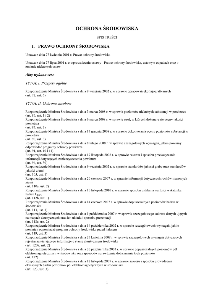 OCHRONA ŚRODOWISKA SPIS TREŚCI I. PRAWO OCHRONY ŚRODOWISKA Ustawa z dnia 27 kwietnia 2001 r. Prawo ochrony środowiska Ustawa z dnia 27 lipca 2001 r. o wprowadzeniu ustawy - Prawo ochrony środowiska, ustawy o odpadach oraz o zmianie niektórych ustaw Akty wykonawcze TYTUŁ I. Przepisy ogólne Rozporządzenie Ministra Środowiska z dnia 9 września 2002 r. w sprawie opracowań ekofizjograficznych (art. 72, ust. 6) TYTUŁ II. Ochrona zasobów Rozporządzenie Ministra Środowiska z dnia 3 marca 2008 r. w sprawie poziomów niektórych substancji w powietrzu (art. 86, ust. 1 i 2) Rozporządzenie Ministra Środowiska z dnia 6 marca 2008 r. w sprawie stref, w których dokonuje się oceny jakości powietrza (art. 87, ust. 3) Rozporządzenie Ministra Środowiska z dnia 17 grudnia 2008 r. w sprawie dokonywania oceny poziomów substancji w powietrzu (art. 90, ust. 3) Rozporządzenie Ministra Środowiska z dnia 8 lutego 2008 r. w sprawie szczegółowych wymagań, jakim powinny odpowiadać programy ochrony powietrza (art. 91, ust. 10 i 11) Rozporządzenie Ministra Środowiska z dnia 19 listopada 2008 r. w sprawie zakresu i sposobu przekazywania informacji dotyczących zanieczyszczenia powietrza (art. 94, ust. 30) Rozporządzenie Ministra Środowiska z dnia 9 września 2002 r. w sprawie standardów jakości gleby oraz standardów jakości ziemi (art. 105, ust. 1) Rozporządzenie Ministra Środowiska z dnia 20 czerwca 2007 r. w sprawie informacji dotyczących ruchów masowych ziemi (art. 110a, ust. 2) Rozporządzenie Ministra Środowiska z dnia 10 listopada 2010 r. w sprawie sposobu ustalania wartości wskaźnika hałasu LDWN (art. 112b, ust. 1) Rozporządzenie Ministra Środowiska z dnia 14 czerwca 2007 r. w sprawie dopuszczalnych poziomów hałasu w środowisku (art. 113, ust. 1) Rozporządzenie Ministra Środowiska z dnia 1 października 2007 r. w sprawie szczegółowego zakresu danych ujętych na mapach akustycznych oraz ich układu i sposobu prezentacji (art. 118a, ust. 2) Rozporządzenie Ministra Środowiska z dnia 14 października 2002 r. w sprawie szczegółowych wymagań, jakim powinien odpowiadać program ochrony środowiska przed hałasem (art. 119, ust. 3) Rozporządzenie Ministra Środowiska z dnia 25 kwietnia 2008 r. w sprawie szczegółowych wymagań dotyczących rejestru zawierającego informacje o stanie akustycznym środowiska (art. 120a, ust. 2) Rozporządzenie Ministra Środowiska z dnia 30 października 2003 r. w sprawie dopuszczalnych poziomów pól elektromagnetycznych w środowisku oraz sposobów sprawdzania dotrzymania tych poziomów (art. 122) Rozporządzenie Ministra Środowiska z dnia 12 listopada 2007 r. w sprawie zakresu i sposobu prowadzenia okresowych badań poziomów pól elektromagnetycznych w środowisku (art. 123, ust. 3) 1 Rozporządzenie Ministra Obrony Narodowej z dnia 9 sierpnia 2002 r. w sprawie szczegółowych zasad sporządzania instrukcji szkoleniowej w zakresie zapewnienia wymogów ochrony zwierząt oraz roślin w toku szkolenia Sił Zbrojnych Rzeczypospolitej Polskiej na poligonach (art. 128, ust. 3) TYTUŁ III. Przeciwdziałanie zanieczyszczeniom Rozporządzenie Ministra Środowiska z dnia 22 kwietnia 2011 r. w sprawie standardów emisyjnych z instalacji (art. 145, ust. 1, pkt 1) Rozporządzenie Ministra Środowiska z dnia 4 listopada 2008 r. w sprawie wymagań w zakresie prowadzenia pomiarów wielkości emisji oraz pomiarów ilości pobieranej wody (art. 148, ust. 1) Rozporządzenie Ministra Środowiska z dnia 19 listopada 2008 r. w sprawie rodzajów wyników pomiarów prowadzonych w związku z eksploatacją instalacji lub urządzenia i innych danych oraz terminów i sposobów ich prezentacji (art. 149, ust. 2 i 4) Rozporządzenie Ministra Środowiska z dnia 2 lipca 2010 r. w sprawie zgłoszenia instalacji wytwarzających pola elektromagnetyczne (art. 152, ust. 9) Rozporządzenie Ministra Środowiska z dnia 2 lipca 2010 r. w sprawie rodzajów instalacji, których eksploatacja wymaga zgłoszenia (art. 153, ust. 1) Rozporządzenie Ministra Środowiska z dnia 9 grudnia 2003 r. w sprawie substancji stwarzających szczególne zagrożenie dla środowiska (art. 160, ust. 3) Rozporządzenie Ministra Gospodarki z dnia 24 czerwca 2002 r. w sprawie wymagań w zakresie wykorzystywania i przemieszczania substancji stwarzających szczególne zagrożenie dla środowiska oraz wykorzystywania i oczyszczania instalacji lub urządzeń, w których były lub są wykorzystywane substancje stwarzające szczególne zagrożenie dla środowiska (art. 163 ust. 1) Rozporządzenie Ministra Gospodarki z dnia 13 grudnia 2010 r. w sprawie wymagań w zakresie wykorzystywania wyrobów zawierających azbest oraz wykorzystywania i oczyszczania instalacji lub urządzeń, w których były lub są wykorzystywane wyroby zawierające azbest (art. 163, ust. 1) Rozporządzenie Ministra Gospodarki z dnia 26 września 2002 r. w sprawie określenia urządzeń, w których mogły być wykorzystywane substancje stwarzające szczególne zagrożenie dla środowiska (art. 163, ust. 4 i 5) Rozporządzenie Ministra Środowiska z dnia 23 lipca 2009 r. w sprawie sposobu przedkładania marszałkowi województwa informacji o występowaniu substancji stwarzających szczególne zagrożenie dla środowiska (art. 163, ust. 6) Rozporządzenie Ministra Środowiska z dnia 23 lipca 2009 r. w sprawie sposobu prowadzenia przez marszałka województwa rejestru dotyczącego PCB (art. 163, ust. 8) Rozporządzenie Ministra Gospodarki i Pracy z dnia 28 grudnia 2004 r. w sprawie produktów objętych obowiązkiem zaopatrzenia w informacje istotne z punktu widzenia ochrony środowiska (art. 167, ust. 3) Rozporządzenie Ministra Gospodarki z dnia 16 stycznia 2007 r. w sprawie szczegółowych wymagań dotyczących ograniczenia emisji lotnych związków organicznych powstających w wyniku wykorzystywania rozpuszczalników organicznych w niektórych farbach i lakierach oraz w mieszaninach1) do odnawiania pojazdów (art. 169, ust.