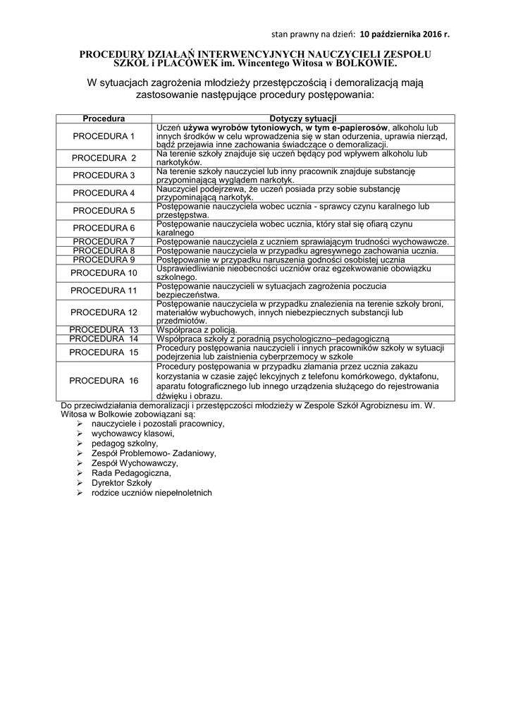 stan prawny na dzień: 10 października 2016 r. PROCEDURY DZIAŁAŃ INTERWENCYJNYCH NAUCZYCIELI ZESPOŁU SZKÓŁ i PLACÓWEK im. Wincentego Witosa w BOLKOWIE. W sytuacjach zagrożenia młodzieży przestępczością i demoralizacją mają zastosowanie następujące procedury postępowania: Procedura Dotyczy sytuacji Uczeń używa wyrobów tytoniowych, w tym e-papierosów, alkoholu lub PROCEDURA 1 innych środków w celu wprowadzenia się w stan odurzenia, uprawia nierząd, bądź przejawia inne zachowania świadczące o demoralizacji. Na terenie szkoły znajduje się uczeń będący pod wpływem alkoholu lub PROCEDURA 2 narkotyków. Na terenie szkoły nauczyciel lub inny pracownik znajduje substancję PROCEDURA 3 przypominającą wyglądem narkotyk. Nauczyciel podejrzewa, że uczeń posiada przy sobie substancję PROCEDURA 4 przypominającą narkotyk. Postępowanie nauczyciela wobec ucznia - sprawcy czynu karalnego lub PROCEDURA 5 przestępstwa. Postępowanie nauczyciela wobec ucznia, który stał się ofiarą czynu PROCEDURA 6 karalnego PROCEDURA 7 Postępowanie nauczyciela z uczniem sprawiającym trudności wychowawcze. PROCEDURA 8 Postępowanie nauczyciela w przypadku agresywnego zachowania ucznia. PROCEDURA 9 Postępowanie w przypadku naruszenia godności osobistej ucznia Usprawiedliwianie nieobecności uczniów oraz egzekwowanie obowiązku PROCEDURA 10 szkolnego. Postępowanie nauczycieli w sytuacjach zagrożenia poczucia PROCEDURA 11 bezpieczeństwa. Postępowanie nauczyciela w przypadku znalezienia na terenie szkoły broni, PROCEDURA 12 materiałów wybuchowych, innych niebezpiecznych substancji lub przedmiotów. PROCEDURA 13 Współpraca z policją. PROCEDURA 14 Współpraca szkoły z poradnią psychologiczno–pedagogiczną Procedury postępowania nauczycieli i innych pracowników szkoły w sytuacji PROCEDURA 15 podejrzenia lub zaistnienia cyberprzemocy w szkole Procedury postępowania w przypadku złamania przez ucznia zakazu korzystania w czasie zajęć lekcyjnych z telefonu komórkowego, dyktafonu, PROCEDURA 16 aparatu fotograficznego lub innego urządzenia służącego do rejestrowania dźwięku i obrazu. Do przeciwdziałania demoralizacji i przestępczości młodzieży w Zespole Szkół Agrobiznesu im. W. Witosa w Bolkowie zobowiązani są: nauczyciele i pozostali pracownicy, wychowawcy klasowi, pedagog szkolny, Zespół Problemowo- Zadaniowy, Zespół Wychowawczy, Rada Pedagogiczna, Dyrektor Szkoły rodzice uczniów niepełnoletnich stan prawny na dzień: 10 października 2016 r. DZIAŁANIA INTERWENCYJNE NAUCZYCIELA w obszarze poszczególnych procedur PROCEDURA 1. W przypadku uzyskania informacji, że uczeń szkoły używa wyrobów tytoniowych, w tym epapierosów, alkoholu lub innych środków w celu wprowadzenia się w stan odurzenia, uprawia nierząd, bądź przejawia inne zachowania świadczące o demoralizacji. 1. Nauczyciel przekazuje uzyskaną informację wychowawcy ucznia. 2. Wychowawca informuje o fakcie dyrektora szkoły oraz przewodniczącego ZESPÓŁU PROBLEMOWO- ZADANIOWEGO. 3. Członkowie ZESPÓŁU PROBLEMOWO- ZADANIOWEGO przeprowadzają rozmowę z uczniem w celu wyjaśnienia okoliczności i motywów jego działania. W przypadku potwierdzenia informacji zobowiązują ucznia do zaniechania negatywnego postępowania. 4. Wychowawca wzywa do szkoły rodziców (prawnych opiekunów ucznia), przekazując uzyskaną informację przeprowadza rozmowę z rodzicami oraz z uczniem w ich obecności, informuje rodziców o stanowisku w tej sprawie członków ZESPÓŁU PROBLEMOWOZADANIOWEGO i zobowiązuje do szczególnego nadzoru nad dzieckiem. Może zaproponować rodzicom skierowanie dziecka do odpowiedniej poradni lub udział dziecka w programie terapeutycznym. 5. Gdy rodzice odmawiają współpracy i nie stawiają się na wezwania, a napływają wiarygodne informację o demoralizacji dziecka, Zespół Wychowawczy przeprowadza rozmowę wyjaśniająco- pouczającą z uczniem. Jeżeli te działania nie odniosą pozytywnego skutku dyrektor szkoły powiadamia pisemnie o zaistniałej sytuacji policję i sąd rodzinny. PROCEDURA 2. W przypadku podejrzenia, że na terenie szkoły znajduje się uczeń będący pod wpływem alkoholu lub narkotyków. (Należy dążyć do zapewnienia obecności dorosłego świadka podczas trwania procedury) 1. Powiadamia o swych przypuszczeniach wychowawcę klasy. 2. Odizolowuje ucznia od reszty klasy, ale ze względu na jego bezpieczeństwo nie pozostawia go samego, zapewniając ochronę jego życia i zdrowia. 3. W uzgodnieniu z dyrektorem szkoły wzywa lekarza, gdy uczeń swoim zachowaniem stwarza zagrożenie dla swojego życia lub zdrowia, w celu stwierdzenia stanu trzeźwości lub odurzenia, ewentualnie udziela pomocy medycznej. 4. Zawiadamia o tym fakcie rodziców/opiekunów, których zobowiązuje do niezwłocznego odebrania ucznia ze szkoły. Gdy rodzice/opiekunowie odmawiają odebrania dziecka, o pozostawieniu ucznia w szkole, czy przewiezieniu do placówki służby zdrowia, albo przekazaniu go funkcjonariuszom policji - decyduje lekarz po ustaleniu stanu zdrowia ucznia i w porozumieniu z dyrektorem szkoły. 5. Dyrektor szkoły zawiadamia policję, gdy rodzice ucznia będącego pod wpływem alkoholu odmawiają przyjścia do szkoły, a on jest agresywny, bądź swoim zachowaniem daje powód do zgorszenia, albo zagraża życiu lub zdrowiu innych osób. Policja ma możliwość przewiezienia ucznia do izby wytrzeźwień, o czym powiadamia rodziców/opiekunów. 6. Jeżeli powtarzają się przypadki przebywania ucznia na terenie szkoły pod wpływem alkoholu lub narkotyków, dyrektor ma obowiązek powiadomienia policji bądź sądu rodzinnego. 7. Z chwilą, gdy ustanie stan niedyspozycji ucznia spowodowany spożyciem środków odurzających lub alkoholu, możliwie jak najszybciej z uczniem przeprowadzają rozmowę członkowie ZESPÓŁU PROBLEMOWO-ZADANIOWEGO, którzy określają dalszy tok postępowania. stan prawny na dzień: 10 października 2016 r. P