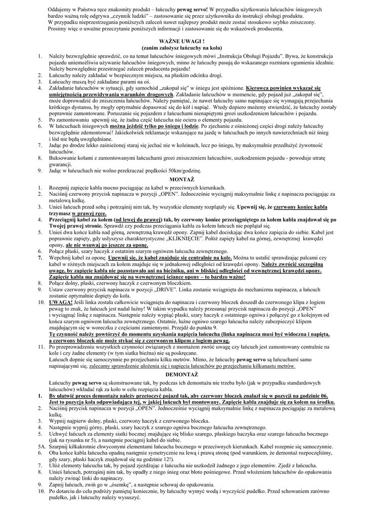 Oddajemy w Państwa ręce znakomity produkt – łańcuchy pewag servo! W przypadku uŜytkowania łańcuchów śniegowych bardzo waŜną rolę odgrywa „czynnik ludzki” – zastosowanie się przez uŜytkownika do instrukcji obsługi produktu. W przypadku nieprzestrzegania poniŜszych zaleceń nawet najlepszy produkt moŜe zostać stosukowo szybko zniszczony. Prosimy więc o uwaŜne przeczytanie poniŜszych informacji i zastosowanie się do wskazówek producenta. WAśNE UWAGI ! (zanim załoŜysz łańcuchy na koła) 1. 2. 3. 4. 5. 6. 7. 8. 9. NaleŜy bezwzględnie sprawdzić, co na temat łańcuchów śniegowych mówi „Instrukcja Obsługi Pojazdu”. Bywa, Ŝe konstrukcja pojazdu uniemoŜliwia uŜywanie łańcuchów śniegowych, mimo Ŝe łańcuchy pasują do wskazanego rozmiaru ogumienia idealnie. NaleŜy bezwzględnie przestrzegać zaleceń producenta pojazdu! Łańcuchy naleŜy zakładać w bezpiecznym miejscu, na płaskim odcinku drogi. Łańcuchy muszą być zakładane parami na oś. Zakładanie łańcuchów w sytuacji, gdy samochód „zakopał się” w śniegu jest spóźnione. Kierowca powinien wykazać się umiejętnością przewidywania warunków drogowych. Zakładanie łańcuchów w momencie, gdy pojazd juŜ „zakopał się”, moŜe doprowadzić do zniszczenia łańcuchów. NaleŜy pamiętać, Ŝe nawet łańcuchy samo napinające się wymagają przejechania krótkiego dystansu, by mogły optymalnie dopasować się do kół i napiąć. Wtedy dopiero moŜemy stwierdzić, Ŝe łańcuchy zostały poprawnie zamontowane. Poruszanie się pojazdem z łańcuchami nienapiętymi grozi uszkodzeniem łańcuchów i pojazdu. Po zamontowaniu upewnij się, Ŝe Ŝadna część łańcucha nie ociera o elementy pojazdu. W łańcuchach śniegowych moŜna jeździć tylko po śniegu i lodzie. Po zjechaniu z ośnieŜonej części drogi naleŜy łańcuchy bezwzględnie zdemontować! Jakiekolwiek reklamacje wskazujące na jazdę w łańcuchach po innych nawierzchniach niŜ śnieg i lód nie będą uwzględniane. Jadąc po drodze lekko zaśnieŜonej staraj się jechać nie w koleinach, lecz po śniegu, by maksymalnie przedłuŜyć Ŝywotność łańcuchów. Buksowanie kołami z zamontowanymi łańcuchami grozi zniszczeniem łańcuchów, uszkodzeniem pojazdu - powoduje utratę gwarancji. Jadąc w łańcuchach nie wolno przekraczać prędkości 50km/godzinę. MONTAś 1. 2. Rozepnij zapięcie kabla mocno pociągając za kabel w przeciwnych kierunkach. Naciśnij czerwony przycisk napinacza w pozycji „OPEN”. Jednocześnie wyciągnij maksymalnie linkę z napinacza pociągając za metalową kulkę. 3. Unieś łańcuch przed sobą i potrząśnij nim tak, by wszystkie elementy rozplątały się. Upewnij się, Ŝe czerwony koniec kabla trzymasz w prawej ręce. 4. Przeciągnij kabel za kołem (od lewej do prawej) tak, by czerwony koniec przeciągniętego za kołem kabla znajdował się po Twojej prawej stronie. Sprawdź czy podczas przeciągania kabla za kołem łańcuch nie poplątał się. 5. Unieś dwa końce kabla nad górną, zewnętrzną krawędź opony. Zapnij kabel dociskając dwa końce zapięcia do siebie. Kabel jest poprawnie zapięty, gdy usłyszysz charakterystyczne „KLIKNIĘCIE”. PołóŜ zapięty kabel na górnej, zewnętrznej krawędzi opony, ale nie wsuwaj go jeszcze za oponę. 6. Połącz płaski, szary haczyk z ostatnim szarym ogniwem łańcucha zewnętrznego. 7. Wepchnij kabel za oponę. Upewnij się, Ŝe kabel znajduje się centralnie na kole. MoŜna to ustalić sprawdzając palcami czy kabel w róŜnych miejscach za kołem znajduje się w jednakowej odległości od krawędzi opony. NaleŜy zwrócić szczególną uwagę, by zapięcie kabla nie pozostawało ani na bieŜniku, ani w bliskiej odległości od wewnętrznej krawędzi opony. Zapięcie kabla ma znajdować się na wewnętrznej ściance opony – to bardzo waŜne! 8. Połącz dolny, płaski, czerwony haczyk z czerwonym bloczkiem. 9. Ustaw czerwony przycisk napinacza w pozycji „DRIVE”. Linka zostanie wciągnięta do mechanizmu napinacza, a łańcuch zostanie optymalnie dopięty do koła. 10. UWAGA! Jeśli linka została całkowicie wciągnięta do napinacza i czerwony bloczek doszedł do czerwonego klipa z logiem pewag to znak, Ŝe łańcuch jest nadal luźny! W takim wypadku naleŜy przesunąć przycisk napinacza do pozycji „OPEN” i wyciągnąć linkę z napinacza. Następnie naleŜy wypiąć płaski, szary haczyk z ostatniego ogniwa i połączyć go z kolejnym od końca szarym ogniwem łańcucha zewnętrznego. Ostatnie, luźne ogniwo szarego łańcucha naleŜy zabezpieczyć klipem znajdującym się w woreczku z częściami zamiennymi. Przejdź do punktu 9. Tę czynność naleŜy powtórzyć do momentu uzyskania napięcia łańcucha (linka napinacza musi być widoczna i napięta, a czerwony bloczek nie moŜe stykać się z czerwonym klipem z logiem pewag. 11. Po przeprowadzeniu wszystkich czynności związanych z montaŜem zwróć uwagę czy łańcuch jest zamontowany centralnie na kole i czy Ŝadne elementy (w tym siatka bieŜna) nie są poskręcane. Łańcuch dopnie się samoczynnie po przejechaniu kilku metrów. Mimo, Ŝe łańcuchy pewag servo są łańcuchami samo napinającymi się, zalecamy sprawdzenie ułoŜenia się i napięcia łańcuchów po przejechaniu kilkunastu metrów. DEMONTAś Łańcuchy pewag servo są skonstruowane tak, by podczas ich demontaŜu nie trzeba było (jak w przypadku standardowych łańcuchów) wkładać rąk za koło w celu rozpięcia kabla. 1. By ułatwić proces demontaŜu naleŜy przetoczyć pojazd tak, aby czerwony bloczek znalazł się w pozycji na godzinie 06. Jest to pozycja koła odpowiadająca tej, w jakiej łańcuch był montowany. Zapięcie kabla znajduje się za kołem na środku. 2. Naciśnij przycisk napinacza w pozycji „OPEN”. Jednocześnie wyciągnij maksymalnie linkę z napinacza pociągając za metalową kulkę. 3. Wypnij najpierw dolny, płaski, czerwony hacz