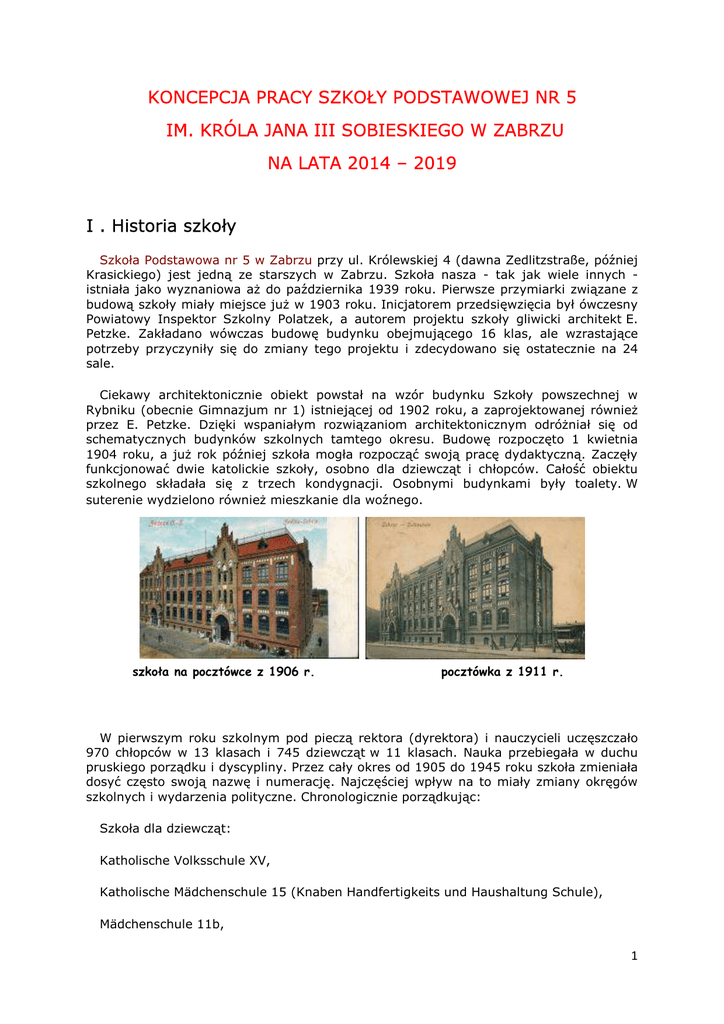KONCEPCJA PRACY SZKOŁY PODSTAWOWEJ NR 5 IM. KRÓLA JANA III SOBIESKIEGO W ZABRZU NA LATA 2014 – 2019 I . Historia szkoły Szkoła Podstawowa nr 5 w Zabrzu przy ul. Królewskiej 4 (dawna Zedlitzstraße, później Krasickiego) jest jedną ze starszych w Zabrzu. Szkoła nasza - tak jak wiele innych istniała jako wyznaniowa aż do października 1939 roku. Pierwsze przymiarki związane z budową szkoły miały miejsce już w 1903 roku. Inicjatorem przedsięwzięcia był ówczesny Powiatowy Inspektor Szkolny Polatzek, a autorem projektu szkoły gliwicki architekt E. Petzke. Zakładano wówczas budowę budynku obejmującego 16 klas, ale wzrastające potrzeby przyczyniły się do zmiany tego projektu i zdecydowano się ostatecznie na 24 sale. Ciekawy architektonicznie obiekt powstał na wzór budynku Szkoły powszechnej w Rybniku (obecnie Gimnazjum nr 1) istniejącej od 1902 roku, a zaprojektowanej również przez E. Petzke. Dzięki wspaniałym rozwiązaniom architektonicznym odróżniał się od schematycznych budynków szkolnych tamtego okresu. Budowę rozpoczęto 1 kwietnia 1904 roku, a już rok później szkoła mogła rozpocząć swoją pracę dydaktyczną. Zaczęły funkcjonować dwie katolickie szkoły, osobno dla dziewcząt i chłopców. Całość obiektu szkolnego składała się z trzech kondygnacji. Osobnymi budynkami były toalety. W suterenie wydzielono również mieszkanie dla woźnego. szkoła na pocztówce z 1906 r. pocztówka z 1911 r. W pierwszym roku szkolnym pod pieczą rektora (dyrektora) i nauczycieli uczęszczało 970 chłopców w 13 klasach i 745 dziewcząt w 11 klasach. Nauka przebiegała w duchu pruskiego porządku i dyscypliny. Przez cały okres od 1905 do 1945 roku szkoła zmieniała dosyć często swoją nazwę i numerację. Najczęściej wpływ na to miały zmiany okręgów szkolnych i wydarzenia polityczne. Chronologicznie porządkując: Szkoła dla dziewcząt: Katholische Volksschule XV, Katholische Mädchenschule 15 (Knaben Handfertigkeits und Haushaltung Schule), Mädchenschule 11b, 1 Volksschule 6, Szkoła dla chłopców: Katholische Volksschule XIV, Katholische Knabenschule 14, Knabenschule 11a, Volksschule 5. Dokładniejszych przyczyn zmian nie sposób ustalić. Oprócz tych istniała jeszcze jedna nazwa – Zedlitzschule, najbardziej popularna, najdłużej używana i historycznie przetrwała do dzisiaj.Pod koniec 1944 roku z powodu nasilenia się działań wojennych wiele szkół zawiesiło działalność. Nauka w naszej szkole również została wstrzymana, a budynek dostosowano do potrzeb szpitala wojskowego (Lazaret). Uczniowie zostali przeniesieni do pobliskich szkół (między innymi ówczesnej Kath. Volksschule IX/X, późniejsza Szkoła Podstawowa nr 7 przy ul. Wolności, obecnie w tym miejscu nie istniejąca). Po zdobyciu Zabrza przez żołnierzy Armii Czerwonej 24 stycznia 1945 roku, aż do 1959 roku mieściły się tutaj dwie szkoły, nr 5 i nr 6. Jest to kontynuacja ostatniej numeracji szkoły wprowadzonej około 1940 roku. W budynku przy ulicy Królewskiej powstały dwie szkoły – Publiczna Szkoła Powszechna nr 5 (dla chłopców) i nr 6 (dla dziewcząt). W pierwszej zapisano 120 chłopców. Nauczycieli było dwóch: Wacław Obraziński - kierownik szkoły i Teofil Czech. Klasy łączone tak, że jeden nauczyciel uczył klasy I-IV, a drugi V-VII. W tym czasie „szóstka” również podjęła trud rozpoczęcia nowego roku szkolnego. W szkole tej uczyli wówczas m.in.: Bożenna Bardzińska (poprawna pisownia imienia!), Józefa Mierzejewska, Małgorzata Mnich, Jadwiga Drozd, a kierownikiem zostaje Aniela Szymaszek. Według informacji zaczerpniętych z kroniki SP 5 z tamtego okresu wynika, że właściwie rok szkolny 1945/46 rozpoczął się 4 października. Było 300 uczniów, a ich stan w styczniu wzrósł do 538. Brak sprzętów szkolnych, usuniętych w czasie wojny w związku z przeznaczeniem budynku na szpital wojskowy, utrudniał pracę szkoły. Dnia 1 marca 1946 roku kierownikiem szkoły został mianowany Ryszard Kuliński, którego zdemobilizowano z Wojska Polskiego. Pełnił tę funkcję najdłużej bo do roku 1970. widok szkoły z ok.1945 r. akwarela szkoły z lat 1940-44 Od 1 września 1954 roku SP 5 staje się szkołą koedukacyjną. Nastąpiło pewne wymieszanie uczniów. Grupa dziewcząt z sąsiedniej szkoły nr 6 przyszła do „piątki”, a część chłopców przeszła do „szóstki”. 12 grudnia 1959 roku wyprowadziła się z budynku Szkoła Podstawowa nr 6, w związku z oddaniem do eksploatacji budynku szkoły na Osiedlu Matejki. Dzięki temu poprawiły się warunki nauki (do tej pory często klasy liczyły 2 po 50 uczniów). Na okres ten przypada kolejny remont i modernizacja szkoły wybudowanie ubikacji w szkole, a zlikwidowanie starych przedwojennych toalet stojących na podwórzu. W roku 1964 rozpoczęto budowę sali gimnastycznej i świetlicy szkolnej. Budowę ukończono i uroczyście oddano do użytku 12 października 1965 r., w rocznicę powstania Wojska Polskiego. 28 kwietnia 1965 r. w szkole podjęto uchwałę o nadaniu placówce imienia bojownika komunistycznego okresu II wojny światowej – Janka Krasickiego i przemianowania ulicy Królewskiej na Krasickiego. Po roku 1995 patrona zniesiono, a ulica odzyskała swoją dawną nazwę. Rok 2004/2005 był dla nas rokiem szczególnym. 1 października 2004uchwałą Rady Miejskiej nadano szkole imię Króla Jana III Sobieskiego. Uroczyste nadanie imienia zostało połączone z obchodami 100-lecia szkoły oraz 60 lecia szkoły polskiej, które zaplanowano na 22 kwietnia 2005 roku. Uświetniło ją między innymi poświęcenie sztandaru. Podniosłe chwile na akademiach poprzedzone będą odśpiewaniem hymnu szkolnego,którego autorkami są nauczycielki naszej szkoły. (Jeżeli chcesz poznać całą historię szkoły to zajrzyj do monografii wydanej z okazji stulecia szkoły. Można ją wypożyczyć w bibliotece szkolnej. Gorąco zapraszamy do tej ciekawej książeczki.)