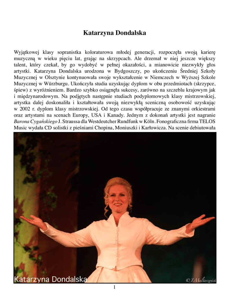 Katarzyna Dondalska Wyjątkowej klasy sopranistka koloraturowa młodej generacji, rozpoczęła swoją karierę muzyczną w wieku pięciu lat, grając na skrzypcach. Ale drzemał w niej jeszcze większy talent, który czekał, by go wydobyć w pełnej okazałości, a mianowicie niezwykły głos artystki. Katarzyna Dondalska urodzona w Bydgoszczy, po ukończeniu Średniej Szkoły Muzycznej w Olsztynie kontynuowała swoje wykształcenie w Niemczech w Wyższej Szkole Muzycznej w Würzburgu. Ukończyła studia uzyskując dyplom w obu przedmiotach (skrzypce, śpiew) z wyróżnieniem. Bardzo szybko osiągnęła sukcesy, zarówno na szczeblu krajowym jak i międzynarodowym. Na podjętych następnie studiach podyplomowych klasy mistrzowskiej, artystka dalej doskonaliła i kształtowała swoją niezwykłą sceniczną osobowość uzyskując w 2002 r. dyplom klasy mistrzowskiej. Od tego czasu współpracuje ze znanymi orkiestrami oraz artystami na scenach Europy, USA i Kanady. Jednym z dokonań artystki jest nagranie Barona Cygańskiego J. Straussa dla Westdeutcher Rundfunk w Köln. Fonograficzna firma TELOS Music wydała CD solistki z pieśniami Chopina, Moniuszki i Karłowicza. Na scenie debiutowała 1 2 jako Królowa nocy w 1995 r. w Detmold. W latach 1998-2000 była solistką Opery w Heidelbergu. Później podziwiano jej pięknie brzmiący sopran w Alte Oper we Frankfurcie nad Menem , Staattstheater: Mainz, Karlsruhe i Darmstad oraz Nationaltheater Mannheim. Największe uznanie przyniosły jej partie koloraturowe: Królowa Nocy, Zerbinetta, Blonda i Konstancja. 3