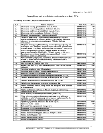 Załącznik nr 1 do SIWZ Szczegółowy opis przedmiotu zamówienia oraz kody CPV. Materiały biurowe i papiernicze (zadanie nr 1): L.p. 1. 2. 3. 4. 5. 6. Kod PCV 30192125-3 30192125-3 30192125-3 30192125-3 30192121-5 30192121-5 Ilość 100 30 30 30 10 120 30192121-5 200 30192100-2 40 22816300-6 100 24910000-6 30199230-1 60 400 12. 13. 14. 15. 16. Nazwa artykułu Cienkopis czarny, grubość linii max. 0,4 mm. Cienkopis czerwony, grubość linii max. 0,4 mm. Cienkopis niebieski, grubość linii max. 0,4 mm. Cienkopis zielony, grubość linii max. 0,4 mm. Długopis samoprzylepny na lince, niebieski. Długopis wykonany z nierdzewnej stali pokrytej czarnym, matowym lakierem, z klipsem w kolorze srebrnym, długopis włączany mechanizmem obrotowym. Wkład w kolorze niebieskim. Długopis żelowy, szybkoschnący, wodoodporny, odporny na blaknięcie tusz, długopis z wymiennym wkładem, grubość linii pisma 0,4 mm (± 0,2mm), średnica kulki piszącej 0,7 mm (± 0,2 mm), automatycznie chowany wkład, gumka w miejscu trzymania długopis. (Niebieski – 100 szt., czarny – 100 szt.). Gumka dwuczęściowa (część ścierająca ołówek i część ścierająca atrament, długopis). Karteczki samoprzylepne, papierowe. Wielkość karteczki 20 x 50 mm (± 6 mm kolor/kolory dowolne). Ilość karteczek w opakowaniu min. 100 szt. Klej biurowy w sztyfcie, min. 22g. Koperty B4 RBD brąz rozszerzana wymiar 250x350x40 papier 130g/m2 Korektor w taśmie, min. 12 m taśmy. Korektor w długopisie z metalową końcówką Koszulki foliowe, A4 (twarde), /A100/ Mazaki wodoodporne ścięte czarne (12 szt.) i białe (13 szt.) Okładki do bindownicy - foliowe przezroczyste A4, /A100/ 30192160-0 30192160-0 44174000-0 30192125-3 30192500-6 30 30 10 25 2 17. Okładki do bindownicy - twarde matowe, A4, /A100/ 33198100-5 2 18. 19. Okładka na dokumenty, składana, z klipsem, A4 Papier ozdobny, bardzo jasny krem, A4, 160g/m2, min. 250 szt. w opakowaniu. Papier toaletowy, bielony, śr. 19 cm, miękki, 2-warstwowy. Pendrrive min 4 GB Pióro żelowe, kolor czarny i niebieski (po 60 szt.) 22852100-8 30197630-1 5 5 33761000-2 30234600-4 39292400-4 400 30 120 30192122-2 10 24. 25. 26. 27. 28. 29. 30. Pióro wieczne, stalowy korpus pokryty czarnym lakierem, stalówka ze stali nierdzewnej, chromowane wykończenia, do używania zarówno z tłoczkiem jak i z nabojami. Ręczniki papierowe, składane ZZ, białe - opak. Spinacze małe – opak. Ściereczki do czyszczenia komputera Środek do czyszczenia komputera Środek do czyszczenia monitorów Taśma bezbarwna klejąca, szer. 22 mm (+/- 3 mm) Taśma biała klejąca 5 cm 33763000-6 30197220-4 39525800-6 39830000-9 39831400-0 44424200-0 44424200-0 1000 100 4 2 2 100 50 31. 32. Taśma dwustronnie klejąca Wkład do długopisu Parker 44424200-0 30125100-2 6 50 7. 8. 9. 10. 11. 20. 21. 22. 23. 1z2 Załącznik Nr 1 do SIWZ - Zadanie nr 1 – Dostawa materiałów biurowych i papierniczych 33. Zakreślacze 30192125-3 80 34. Zeszyt w kratkę A5, 80 kart 22830000-7 10 35. 36. 37. 38. 39. 40. 41. 42. 43. Zeszyt w kratkę A5, 96 kart Zeszyt w kratkę A5, 96 kart /twarda oprawa/ Zeszyt w kratkę A4, 80 kart Zeszyt w kratkę A4, 96 kart /twarda oprawa/ Folia do laminowania A3, 100 mic, 100 szt. w opakowaniu. Papier w roli, 80 g, 257x50 do plotera Papier w roli, 80 g, 420x50 do plotera Papier w roli, 80 g, 914x50 do plotera Papier w roli, 80 g, 610x100 do plotera 22830000-7 22830000-7 22830000-7 22830000-7 44174000-0 30197642-8 30197642-8 30197642-8 30197642-8 10 20 10 10 2 2 1 4 4 2z2 Załącznik Nr 1 do SIWZ - Zadanie nr 1 – Dostawa materiałów biurowych i papierniczych