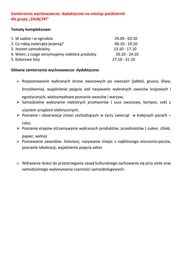 Zamierzenia wychowawczo- dydaktyczne na miesiąc październik dla grupy „ZAJĄCZKI” Tematy kompleksowe: 1. W sadzie i w ogrodzie 2. Co robią zwierzęta jesienią? 3. Jestem samodzielny 4. Wiem, z czego otrzymujemy niektóre produkty 5. Kolorowe listy 29.09 - 03.10 06.10 - 10.10 13.10 - 17.10 20.10 - 24.10 27.10 - 31.10 Główne zamierzenia wychowawczo- dydaktyczne: Rozpoznawanie wybranych drzew owocowych po owocach (jabłoń, grusza, śliwa, brzoskwinia), wyjaśnienie pojęcia sad nazywanie wybranych owoców krajowych i egzotycznych, wielozmysłowe poznanie owoców i warzyw; Samodzielne wykonanie niektórych przetworów ( susz owocowy, kompot, sok) z użyciem urządzeń elektrycznych; Poznanie i obserwacja zmian zachodzących w życiu zwierząt w kolejnych porach – roku; Poznanie etapów otrzymywania wybranych produktów, przedmiotów ( cukier, chleb, papier, wełna) Poznawanie zawodów- listonosz, nazywanie miejsc z najbliższego otoczenia-poczta, poznanie lokalizacji, wyjaśnienie pojęcia adres • Wdrażanie dzieci do przestrzegania zasad kulturalnego zachowania się przy stole oraz samodzielnego wykonywania czynności samoobsługowych: PIOSENKA CHODZI LISTONOSZ sł. B. Lewandowska, muz. F. Leszczyńska Chodzi listonosz tu i tam, Puka do mieszkań stu. Ja listonosza dobrze znam -Dzień dobry- mówię mu. REF.: Dzień dobry, Dzień dobry witam pana! -Czy niesie pan w torbie listy dla nas? Torba jest wypchana aż do dna I dla nas, i dla nas list pan ma! Wysłał marynarz listy dwa, Listy zza siedmiu mórz! Już je listonosz w torbie ma, Dzieciom odnosi już! REF.: Dzień dobry, Dzień dobry witam pana!... Chodzi listonosz całe dnie, Drogę ma długą, złą. Więc gdy u ciebie zjawi się, Ładnie przywitaj go! WIERSZ CO LUBIMY ? B. Forma Lubimy jabłuszka I słodziutkie gruszki, Na śliwki jesteśmy Wielkie łakomczuszki. Marchewkę chrupiemy Jak małe zajączki Pomidory też zjadamy Gdy nam wpadną w rączki