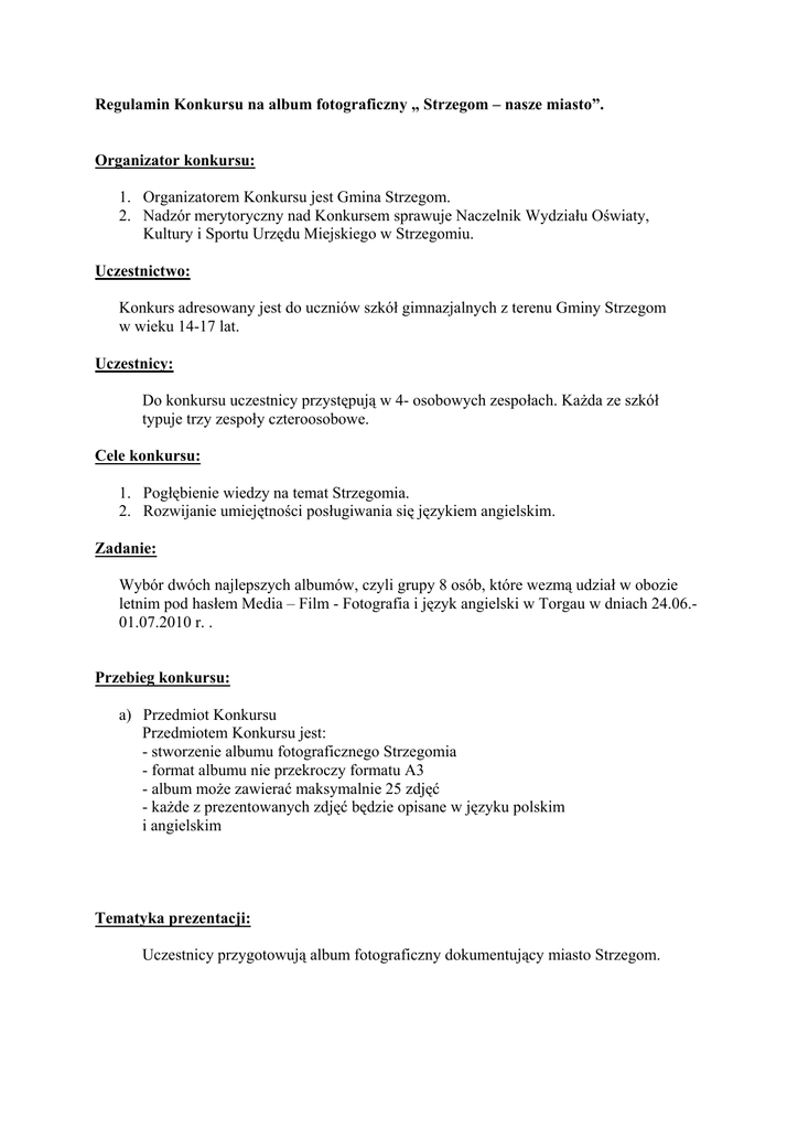 Regulamin Konkursu na album fotograficzny „ Strzegom – nasze miasto”. Organizator konkursu: 1. Organizatorem Konkursu jest Gmina Strzegom. 2. Nadzór merytoryczny nad Konkursem sprawuje Naczelnik Wydziału Oświaty, Kultury i Sportu Urzędu Miejskiego w Strzegomiu. Uczestnictwo: Konkurs adresowany jest do uczniów szkół gimnazjalnych z terenu Gminy Strzegom w wieku 14-17 lat. Uczestnicy: Do konkursu uczestnicy przystępują w 4- osobowych zespołach. Każda ze szkół typuje trzy zespoły czteroosobowe. Cele konkursu: 1. Pogłębienie wiedzy na temat Strzegomia. 2. Rozwijanie umiejętności posługiwania się językiem angielskim. Zadanie: Wybór dwóch najlepszych albumów, czyli grupy 8 osób, które wezmą udział w obozie letnim pod hasłem Media – Film - Fotografia i język angielski w Torgau w dniach 24.06.01.07.2010 r. . Przebieg konkursu: a) Przedmiot Konkursu Przedmiotem Konkursu jest: - stworzenie albumu fotograficznego Strzegomia - format albumu nie przekroczy formatu A3 - album może zawierać maksymalnie 25 zdjęć - każde z prezentowanych zdjęć będzie opisane w języku polskim i angielskim Tematyka prezentacji: Uczestnicy przygotowują album fotograficzny dokumentujący miasto Strzegom. Termin: Czas trwania Konkursu od dnia 10.03.2010 r. do dnia 30.04.2010r. Albumy fotograficzne należy złożyć do dnia 05.05.2010 r. w Urzędzie Miejskim w Strzegomiu w pok.26. Albumy fotograficzne nie podlegają zwrotowi po zakończeniu procedury konkursowej. Ocena i ostateczne wyniki: maj 2010 r. Kryteria oceniania: 1. Przejrzysty i uporządkowany układ albumu. 2. Estetyka wykonania. 3. Kreatywność. 4. Wartość i poprawność merytoryczna. 5. Strona bibliograficzna. Komisja sporządza protokół z przebiegu Konkursu zawierający wyniki Konkursu. Nagrody: Wyjazd i udział w obozie letnim w Torgau pod hasłem Media- Film – Fotografia i język angielski w dniach 24.06.-01.07.2010 r . Warunki przystąpienia do konkursu: 1. Warunkiem przystąpienia do Konkursu jest wypełnienie Karty Zgłoszenia Zespołu oraz posiadanie przez każdego uczestnika aktualnego paszportu. 2. Karta Zgłoszenia oraz oświadczenia członków zespołu powinny zostać złożone do dnia 20.03.2010 r. w Urzędzie Miejskim w Strzegomiu w pok. 26. 3. Warunkiem wzięcia udziału w Konkursie jest przekazanie (przeniesienie) praw autorskich dotyczących stworzonego albumu fotograficznego na organizatora Konkursu. Postanowienia końcowe: 1. Organizator zastrzega sobie prawo ostatecznej interpretacji i ewentualnych zmian w treści i wykładni regulaminu. 2. Ocena Komisji Konkursowej jest ostateczna i nie podlega jakimkolwiek odwołaniom. 3. Rozstrzygnięcie Konkursu nastąpi dnia 14.05.2010 r. 4. Wyniki Konkursu zostaną opublikowane na stronie internetowej www.strzegom.pl 5. Regulamin wchodzi w życie z dniem podpisania. KARTA ZGŁOSZENIA NAZWA PLACÓWKI: DANE ZESPOŁU: 1. IMIĘ: NAZWISKO: ADRES: DATA URODZENIA: PESEL: 2. IMIĘ: NAZWISKO: ADRES: DATA URODZENIA: PESEL: 3.IMIĘ: NAZWISKO: ADRES: DATA URODZENIA: PESEL: 4. IMIĘ: NAZWISKO: ADRES: DATA URODZENIA: PESEL: Oświadczenie o wyrażeniu zgody na przekazanie (przeniesienie) praw autorskich Wyrażam zgodę na przekazanie (przeniesienie) praw autorskich dotyczących stworzonego albumu fotograficznego na Organizatora Konkursu, Gminę Strzegom na następujących polach eksploatacji: użyczenie lub najem oryginału, publiczne wystawienie, a także publiczne udostępnianie w taki sposób, aby każdy mógł mieć do niego dostęp w miejscu i w czasie przez siebie wybranym. (miejscowość i data) (czytelne podpisy członków zespołu) Oświadczenie o wyrażeniu zgody na przetwarzanie danych osobowych Wyrażam zgodę na przetwarzanie danych osobowych zgodnie z przepisami ustawy z dnia 29 sierpnia 1997 r. o ochronie danych osobowych (Dz. U. z 2002 r. nr 101, poz. 926 z późn. zm.). (miejscowość i data) (czytelne podpisy członków zespołu)
