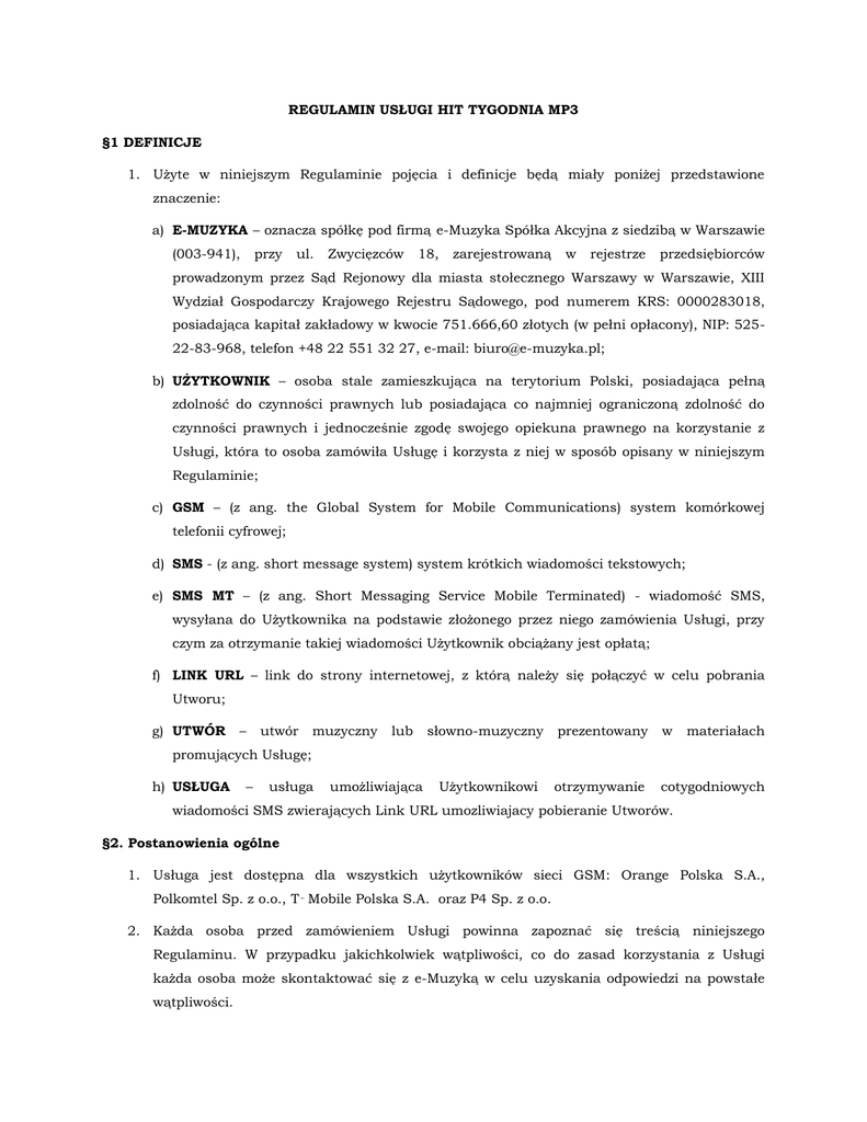 REGULAMIN USŁUGI HIT TYGODNIA MP3 §1 DEFINICJE 1. Użyte w niniejszym Regulaminie pojęcia i definicje będą miały poniżej przedstawione znaczenie: a) E-MUZYKA – oznacza spółkę pod firmą e-Muzyka Spółka Akcyjna z siedzibą w Warszawie (003-941), przy ul. Zwycięzców 18, zarejestrowaną w rejestrze przedsiębiorców prowadzonym przez Sąd Rejonowy dla miasta stołecznego Warszawy w Warszawie, XIII Wydział Gospodarczy Krajowego Rejestru Sądowego, pod numerem KRS: 0000283018, posiadająca kapitał zakładowy w kwocie 751.666,60 złotych (w pełni opłacony), NIP: 52522-83-968, telefon +48 22 551 32 27, e-mail: [email protected]; b) UŻYTKOWNIK – osoba stale zamieszkująca na terytorium Polski, posiadająca pełną zdolność do czynności prawnych lub posiadająca co najmniej ograniczoną zdolność do czynności prawnych i jednocześnie zgodę swojego opiekuna prawnego na korzystanie z Usługi, która to osoba zamówiła Usługę i korzysta z niej w sposób opisany w niniejszym Regulaminie; c) GSM – (z ang. the Global System for Mobile Communications) system komórkowej telefonii cyfrowej; d) SMS - (z ang. short message system) system krótkich wiadomości tekstowych; e) SMS MT – (z ang. Short Messaging Service Mobile Terminated) - wiadomość SMS, wysyłana do Użytkownika na podstawie złożonego przez niego zamówienia Usługi, przy czym za otrzymanie takiej wiadomości Użytkownik obciążany jest opłatą; f) LINK URL – link do strony internetowej, z którą należy się połączyć w celu pobrania Utworu; g) UTWÓR – utwór muzyczny lub słowno-muzyczny prezentowany w materiałach Użytkownikowi otrzymywanie cotygodniowych promujących Usługę; h) USŁUGA – usługa umożliwiająca wiadomości SMS zwierających Link URL umozliwiajacy pobieranie Utworów. §2. Postanowienia ogólne 1. Usługa jest dostępna dla wszystkich użytkowników sieci GSM: Orange Polska S.A., Polkomtel Sp. z o.o., T‑ Mobile Polska S.A. oraz P4 Sp. z o.o. 2. Każda osoba przed zamówieniem Usługi powinna zapoznać się treścią niniejszego Regulaminu. W przypadku jakichkolwiek wątpliwości, co do zasad korzystania z Usługi każda osoba może skontaktować się z e-Muzyką w celu uzyskania odpowiedzi na powstałe wątpliwości. 3. Każda osoba, która zamawia Usługę przyjmuje do wiadomości i akceptuje warunki niniejszego Regulaminu oraz zobowiązuje się do przestrzegania jego postanowień. Na życzenie każdego Użytkownika e-Muzyka dodatkowo udostępnia treść niniejszego Regulaminu przesyłając go na adres e-mail podany przez Użytkownika. 4. Usługa jest dla Użytkownika odpłatna. Użytkownik obciążany jest za każdą wysłaną otrzymaną od e-Muzyki wwiadomość SMS MT. Opłata za otrzymanie wiadomości SMS MT od e-Muzyki z numeru 60168 wynosi 1 złoty netto (1,23 złotych brutto), za wyjątkiem pierwszej wiadomości SMS MT, której wysłanie nie powoduje obciążenia Użytkownika żadnymi kosztami. Koszt otrzymania wiadomości SMS MT jest doliczany do rachunku za świadczenie usług telekomunikacyjnych świadczonych przez operatora telekomunikacyjnego, w którego sieci aktywowana jest karta SIM, z wykorzystywaniem której Użytkownik korzysta z Usługi lub też pomniejsza dostępne na jego koncie u danego operatora telekomunikacyjnego dostępne środki. 5. Do korzystania z Usługi niezbędne jest posiadanie przez Użytkownika telefonu komórkowego, aktywowanego w jednej z sieci GSM na terytorium Polski, pozwalającego na dostęp do sieci Internet, posiadającego możliwość odtwarznia plików w formacie mp3. Użytkownicy iPhone oraz telefonów z systemem Windows (oraz innych, które nie pozwalają na zapisanie pamięci urządzenia plików mp3), powinni przepisać link otrzymany na telefon do przeglądarki i pobrać plik zawierający Utwór na komputer, a potem skopiować na telefon dostarczonym przez producenta telefonu oprogramowaniem. 6. e-Muzyka dokłada najwyższej staranności, by Usługa świadczona były na najwyższym poziomie, jednakże nie wyklucza możliwości czasowego zawieszenia dostępności Usługi w przypadku konieczności koniecznością przeprowadzenia modernizacji lub konserwacji, rozbudowy Usługi. przeglądu e-Muzyka lub w dokłada związku z najwyższej staranności, aby przerwy techniczne nie były uciążliwe dla Użytkowników oraz aby planowe przerwy techniczne związane z konserwacją Usługi oraz sprzętu telekomunikacyjnego i serwerów wykorzystywanych przez e-Muzyka na potrzeby Usługi, w miarę możliwości, planowane były na godziny nocne. O terminie i przewidywanej długości trwania przerwy eMuzyka w miarę możliwości technicznych informuje Użytkowników z kilkugodzinnym wyprzedzeniem. 7. W ramach Usługi Użytkownik otrzymuje od e-Muzyki, za pośrednictwem SMS MT, Linki URL umożliwiające pobieranie wybranych przez e-Muzyke Utworów. Wiadomości SMS MT wysyłane są raz w tygodniu. Użytkownik zamawiając Usługę wyraża zgodę na otrzymywanie odpłatnych wiadomości SMS MT. 8. Użytkownik, który dokona aktywacji Usługi korzysta z Usługi do momentu rezygnacji z Usługi. 9. Warunkiem otrzymania SMS MT jest posiadanie przez Użytkownika włączonego telefonu w czasie wysłania przez e-Muzykę wiadomości SMS MT oraz w przypadku osób korzystających z kart typu pre-paid, posiadanie odpowiedniej ilości środków na koncie pozwalających na pokrycie kosztów wysłania wiadomości SMS. §3 Zasady zamawiania, korzystania i rezygonwania z Usługi 1. Do zamówienia Usługi konieczne jest przesłanie do e-Muzyki wiadomości SMS o treści START MP3 oraz <KOD BEZPŁATNEGO UTWORU> (na przykład: START MP3 abcd12345) zgodnie z informacjami wskazanymi na stronie internetowej Usługi lub w materiałach promujących Usługę. 2. Po zamówieniu Usługi Użytkownik otrzymywać będzie od e-Muzyki na numer telefonu z którego zostało dokonane zamówienie Linki URL umożliwiające pobranie Utworów. Z chwilą wysłania przez e-Muzykę pi