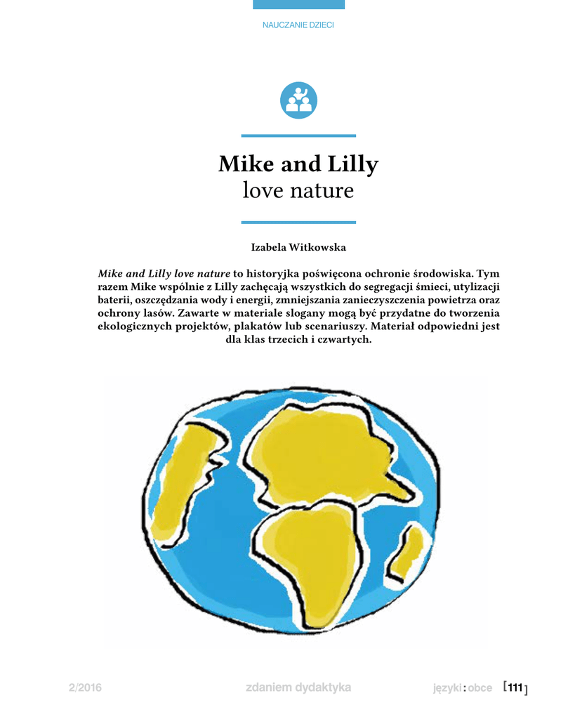 nauczanie dzieci Mike and Lilly love nature Izabela Witkowska Mike and Lilly love nature to historyjka poświęcona ochronie środowiska. Tym razem Mike wspólnie z Lilly zachęcają wszystkich do segregacji śmieci, utylizacji baterii, oszczędzania wody i energii, zmniejszania zanieczyszczenia powietrza oraz ochrony lasów. Zawarte w materiale slogany mogą być przydatne do tworzenia ekologicznych projektów, plakatów lub scenariuszy. Materiał odpowiedni jest dla klas trzecich i czwartych. 2/2016 zdaniem dydaktyka [ 111 ] nauczanie dzieci [ 112 ] It is easy to be green and keep the countryside clean. Rubbish is everywhere! Collect it if you care. Find a special rubbish bin to put your litter in. Paper, glass and plastic. Recycling is fantastic! Place old batteries here. Be positive, my dear! But it is not enough. Take a shower, not a bath. zdaniem dydaktyka 2/2016 nauczanie dzieci Park the car. Ride your bike. Look at Lilly and Mike. Plant a tree, save the wood. Respect nature, be good! Take a cloth bag to the store. Don’t use plastic any more. Are you sleepy? Good night, but first switch off the light. Remember, it is worth protecting Mother Earth. 2/2016 zdaniem dydaktyka [ 113 ] nauczanie dzieci Recycle, Reuse and Reduce Warto jest wprowadzić te trzy słowa, gdyż mogą one posłużyć do określenia tego, co można zrobić z produktami, które zagrażają środowisku lub których nadużywanie może być przyczyną wielu problemów ekologicznych. W tekście wyszukujemy nazwy produktów i dzielimy je według kategorii. Recycle: Paper, Glass, Plastic, Battery Reuse: Bags Reduce: Water, Light Uczniowie mogą dodawać swoje pomysły i uzupełniać notatkę. Complete the sentences Każde ze zdań należy uzupełnić słowem lub wyrażeniem podanym w ramce. Zdania pochodzą z tekstu. jedna grupa zastanawia się nad przedmiotami papierowymi, druga szklanymi, a trzecia plastikowymi. Następnie karteczki są mieszane, umieszczane na środku klasy, uczniowie je segregują i wrzucają do konkretnego pojemnika. Paper: book, notebook, newspaper, magazine, cardboard box, envelope Glass: bottle, jar, cup, plate, mug, vase, jug Plastic: toy, plastic bottle, plastic bag, candy (US)/sweet (UK) wrapper Przygotowane do zajęć pojemniki mogą później posłużyć jako kosze, do których uczniowie będą wrzucać prawdziwe śmieci. Materiał dla ucznia Wersja dla ucznia Izabela Witkowska old batteries, green, plant, cloth bag, switch off Nauczycielka języka angielskiego w szkole podstawowej. Jej hobby, z którego 1. 2. 3. 4. 5. Place . . . . . . . . . . . . . . . . . here. Take a . . . . . . . . . . . . . . . . . to the store. It is easy to be . . . . . . . . . . . . . . . . . . Good night, but first . . . . . . . . . . . . . . . . . the light. . . . . . . . . . . . . . . . . . a tree, save the wood. czerpie wiele satysfakcji, jest pisanie rymowanych bajek i wierszyków. Dziecięcy entuzjazm, zachwyt oraz słowa: Proszę pani, jeszcze raz są dla niej największą motywacją do pracy. Jest autorką wielu podobnych materiałów edukacyjnych. Wersja dla nauczyciela (z odpowiedziami) 1. Place old batteries here. 2. Take a cloth bag to the store. 3. It is easy to be green. 4. Good night, but first switch off the light. 5. Plant a tree, save the wood. Classroom recycling Możemy zaproponować uczniom klasowy recykling, który nie tylko zachęci wszystkich do podejmowania działań na rzecz ochrony środowiska, ale też utrwali znane uczniom słowa lub przybliży znaczenie innych. Dobrze jest przygotować trzy pojemniki, np. kartonowe lub plastikowe pudełka, następnie odpowiednio je pokolorować i oznaczyć etykietkami: paper, glass, plastic. Następnie uczniowie w trzech grupach przygotowują na karteczkach nazwy przedmiotów z materiału, który wcześniej przydzielił im nauczyciel, czyli [ 114 ] zdaniem dydaktyka 2/2016