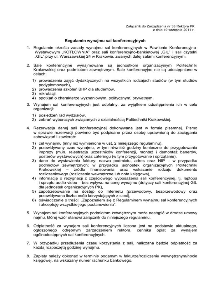 Załącznik do Zarządzenia nr 38 Rektora PK z dnia 19 września 2011 r. Regulamin wynajmu sal konferencyjnych 1. Regulamin określa zasady wynajmu sal konferencyjnych w Pawilonie KonferencyjnoWystawowym „KOTŁOWNIA” oraz sali konferencyjno-bankietowej „GIL” i sali czytelni „GIL” przy ul. Warszawskiej 24 w Krakowie, zwanych dalej salami konferencyjnymi. 2. Sale konferencyjne wynajmowane są jednostkom organizacyjnym Politechniki Krakowskiej oraz podmiotom zewnętrznym. Sale konferencyjne nie są udostępniane w celach: 1) prowadzenia zajęć dydaktycznych na wszystkich rodzajach studiów (w tym studiów podyplomowych), 2) prowadzenia szkoleń BHP dla studentów, 3) rekrutacji, 4) spotkań o charakterze wyznaniowym, politycznym, prywatnym. 3. Wynajem sal konferencyjnych jest odpłatny, za wyjątkiem udostępnienia ich w celu organizacji: 1) posiedzeń rad wydziałów, 2) zebrań wyborczych związanych z działalnością Politechniki Krakowskiej. 4. Rezerwacja danej sali konferencyjnej dokonywana jest w formie pisemnej. Pismo w sprawie rezerwacji powinno być podpisane przez osobę uprawnioną do zaciągania zobowiązań i zawierać: 1) cel wynajmu (inny niż wymienione w ust. 2 niniejszego regulaminu), 2) przewidywany czas wynajmu, w tym również godziny konieczne do przygotowania imprezy (m.in. rejestracja uczestników konferencji, montaż i demontaż banerów, posterów wystawowych) oraz cateringu (w tym przygotowanie i sprzątanie), 3) dane do wystawienia faktury: nazwa podmiotu, adres oraz NIP – w przypadku podmiotów zewnętrznych; w przypadku jednostek organizacyjnych Politechniki Krakowskiej – źródło finansowania oraz wskazanie rodzaju dokumentu rozliczeniowego (rozliczenie wewnętrzne lub nota księgowa), 4) informację o rezygnacji z częściowego wyposażenia sali konferencyjnej, tj. laptopa i sprzętu audio-video – bez wpływu na cenę wynajmu (dotyczy sali konferencyjnej GIL dla jednostek organizacyjnych PK), 5) zapotrzebowanie na dostęp do Internetu (przewodowy, bezprzewodowy oraz przewidywana liczba osób korzystających z sieci), 6) oświadczenie o treści: „Zapoznałem się z Regulaminem wynajmu sal konferencyjnych i akceptuję wszystkie jego postanowienia”. 5. Wynajem sal konferencyjnych podmiotom zewnętrznym może nastąpić w drodze umowy najmu, której wzór stanowi załącznik do niniejszego regulaminu. 6. Odpłatność za wynajem sali konferencyjnych liczona jest na podstawie aktualnego, ogłoszonego odrębnym zarządzeniem rektora, cennika opłat za wynajem ogólnodostępnych sal konferencyjnych. 7. W przypadku przedłużenia czasu korzystania z sali, naliczana będzie odpłatność za każdą rozpoczętą godzinę wynajmu. 8. Zapłaty należy dokonać w terminie podanym w fakturze/rozliczeniu wewnętrznym/nocie księgowej, na wskazany numer rachunku bankowego. 9. Sala konferencyjno-bankietowa „GIL” udostępniana jest: 1) jako sala bankietowa/obiadowa bez multimediów w stałym układzie mebli, według cennika, 2) jako sala konferencyjna z multimediami i wliczoną w cenę obsługą techniczną, według cennika. 10. W ramach odpłatności za wynajem udostępniany jest parking oraz szatnia: 1) szatnia w sali konferencyjnej „KOTŁOWNIA” w terminie październik – kwiecień, 2) szatnia w sali konferencyjno-bankietowej „GIL”: całoroczna, samoobsługowa. 11. Wynajmujący nie odpowiada za rzeczy pozostawiane przez najemcę w szatni oraz w sali konferencyjnej. 12. Najemca zobowiązany jest do używania sal konferencyjnych w sposób zgodny z ich przeznaczeniem. Najemca zostanie obciążony kosztami naprawy uszkodzeń sali lub sprzętu, powstałymi w wyniku ich niewłaściwego użytkowania. 13. Najemca zobowiązany jest do przestrzegania przepisów BHP i przeciwpożarowych obowiązujących w budynku. 14. Sala czytelni „GIL” z wyposażeniem multimedialnym wynajmowana jest w sytuacjach wyjątkowych – wyłącznie wtedy, gdy pozostałe sale są zajęte. Załącznik do Regulaminu wynajmu sal konferencyjnych UMOWA NAJMU zawarta w dniu r. w Krakowie pomiędzy Politechniką Krakowską im. Tadeusza Kościuszki, 31-155 Kraków, ul. Warszawska 24, reprezentowaną przez: z kontrasygnatą finansową zwaną w dalszej części umowy Wynajmującym a ………………………………………………………………………………………………………… reprezentowanym przez: zwanym w dalszej części umowy Najemcą. §1 Przedmiotem niniejszej umowy jest wynajem sali konferencyjnej Politechniki Krakowskiej ……………………….. przy ul. Warszawskiej 24 w Krakowie, w dniu ………….., w godzinach od ……… do ………. wraz z obsługą techniczną* w celu ………………………. .Wynajmujący umożliwi korzystanie z parkingu i znajdujących się w budynku sanitariatów i szatni (w terminie: październik – kwiecień) oraz zapewni miejsce do przygotowania cateringu na potrzeby imprezy: „………….....................................................................................................”. §2 Strony ustalają czynsz za wynajem w wysokości ………… zł netto (słownie: ..…..................... ……………………………). §3 Czynsz za wynajem, o którym mowa w §2, jest powiększony o należny podatek VAT, zgodnie z obowiązującymi przepisami. §4 Należność płatna będzie na podstawie wystawionej faktury VAT na konto Wynajmującego, w terminie ……… dni od daty jej wystawienia. Za datę zapłaty uznaje się datę wpływu należności na konto Wynajmującego. §5 Najemca oświadcza, że jest płatnikiem podatku VAT oraz posiada następujący NIP: ……………………… i upoważnia Wynajmującego do wystawienia faktury VAT bez podpisu Najemcy. §6 Umowa niniejsza zawarta zostaje na czas oznaczony, tj. w dniach …………………….… §7 Najemca nie może przenosić praw i obowiązków wynikających z niniejszej umowy na rzecz podmiotów trzecich. §8 W przypadku 