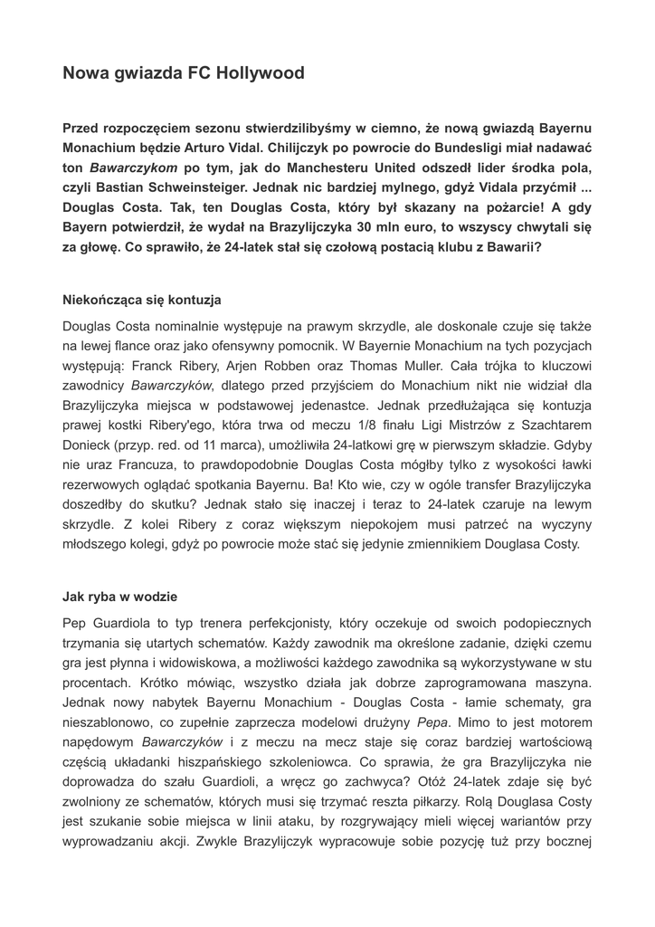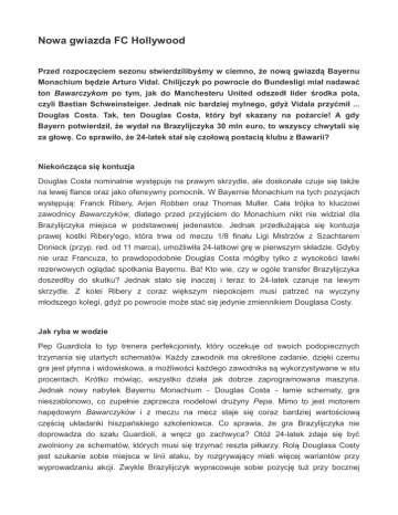 Nowa gwiazda FC Hollywood Przed rozpoczęciem sezonu stwierdzilibyśmy w ciemno, że nową gwiazdą Bayernu Monachium będzie Arturo Vidal. Chilijczyk po powrocie do Bundesligi miał nadawać ton Bawarczykom po tym, jak do Manchesteru United odszedł lider środka pola, czyli Bastian Schweinsteiger. Jednak nic bardziej mylnego, gdyż Vidala przyćmił ... Douglas Costa. Tak, ten Douglas Costa, który był skazany na pożarcie! A gdy Bayern potwierdził, że wydał na Brazylijczyka 30 mln euro, to wszyscy chwytali się za głowę. Co sprawiło, że 24-latek stał się czołową postacią klubu z Bawarii? Niekończąca się kontuzja Douglas Costa nominalnie występuje na prawym skrzydle, ale doskonale czuje się także na lewej flance oraz jako ofensywny pomocnik. W Bayernie Monachium na tych pozycjach występują: Franck Ribery, Arjen Robben oraz Thomas Muller. Cała trójka to kluczowi zawodnicy Bawarczyków, dlatego przed przyjściem do Monachium nikt nie widział dla Brazylijczyka miejsca w podstawowej jedenastce. Jednak przedłużająca się kontuzja prawej kostki Ribery'ego, która trwa od meczu 1/8 finału Ligi Mistrzów z Szachtarem Donieck (przyp. red. od 11 marca), umożliwiła 24-latkowi grę w pierwszym składzie. Gdyby nie uraz Francuza, to prawdopodobnie Douglas Costa mógłby tylko z wysokości ławki rezerwowych oglądać spotkania Bayernu. Ba! Kto wie, czy w ogóle transfer Brazylijczyka doszedłby do skutku? Jednak stało się inaczej i teraz to 24-latek czaruje na lewym skrzydle. Z kolei Ribery z coraz większym niepokojem musi patrzeć na wyczyny młodszego kolegi, gdyż po powrocie może stać się jedynie zmiennikiem Douglasa Costy. Jak ryba w wodzie Pep Guardiola to typ trenera perfekcjonisty, który oczekuje od swoich podopiecznych trzymania się utartych schematów. Każdy zawodnik ma określone zadanie, dzięki czemu gra jest płynna i widowiskowa, a możliwości każdego zawodnika są wykorzystywane w stu procentach. Krótko mówiąc, wszystko działa jak dobrze zaprogramowana maszyna. Jednak nowy nabytek Bayernu Monachium - Douglas Costa - łamie schematy, gra nieszablonowo, co zupełnie zaprzecza modelowi drużyny Pepa. Mimo to jest motorem napędowym Bawarczyków i z meczu na mecz staje się coraz bardziej wartościową częścią układanki hiszpańskiego szkoleniowca. Co sprawia, że gra Brazylijczyka nie doprowadza do szału Guardioli, a wręcz go zachwyca? Otóż 24-latek zdaje się być zwolniony ze schematów, których musi się trzymać reszta piłkarzy. Rolą Douglasa Costy jest szukanie sobie miejsca w linii ataku, by rozgrywający mieli więcej wariantów przy wyprowadzaniu akcji. Zwykle Brazylijczyk wypracowuje sobie pozycję tuż przy bocznej linii, by przy prostopadłym podaniu mieć więcej miejsca. Wówczas "ciągnie" piłkę aż na wysokość pola karnego i posyła dośrodkowanie za plecy obrońców. Z kolei gdy nadarzy się okazja do strzału, to uderza swoją lepszą, lewą nogą na dalszy słupek. Przy takim stylu gry Douglasowi Coście pomaga jego szybkość oraz wyszkolenie techniczne. Samym sprintem 24-latek potrafi wprawić obronę przeciwnika w osłupienie i wywalczyć kilka cennych metrów. A gdy ktoś stanie mu na drodze, to mija dryblingiem rywali jak tyczki. Brazylijczyk zachwyca także dośrodkowaniami, które są bardzo przemyślane i dokładne. Ponadto wykonuje je zewnętrzną częścią stopy, co jest ewenementem nawet na skalę światową. Takie zagranie przyniosło efekty, chociażby w wygranym meczu z HSV (5:0), gdy to dobiegł do piłki, którą większość widziała już na aucie i zagrał właśnie zewnętrzną częścią stopy prosto na głowę Mullera. To wszystko potwierdza, że założenia taktyczne opracowywane przez Guardiolę jak najbardziej odpowiadają Douglasowi Coście, który czuje się w Bayernie jak ryba w wodzie. Ponadto po raz kolejny potwierdza się teza, że hiszpański szkoleniowiec potrafi z przeciętnego piłkarza uczynić gwiazdę światowego formatu. Współpraca Przychodząc do Bayernu Monachium, nie jest łatwo zdobyć zaufanie kolegów z drużyny, którzy w meczu często decydowaliby się grać do nowego zawodnika. Przekonał się o tym Lewandowski, który co prawda strzelił 17 goli i naprawdę zaliczył świetny debiutancki sezon, ale pozostawił niedosyt. Wszystko przez słabą współpracę na początku kampanii, gdy to Polak musiał sam stwarzać sobie sytuacje, bo Muller, Ribery i Robben woleli grać między sobą. Dopiero pod koniec sezonu Lewandowski zdobył zaufanie Niemca i razem konstruowali ciekawe akcje. Inaczej sytuacja wygląda w przypadku Douglasa Costy, który od samego początku nie ma problemów z ilością kierowanych do niego zagrań. Gdy środek jest zbytnio zagęszczony, to 24-latek jest ratunkiem dla rozgrywających, gdyż gra tuż przy linii bocznej. Dlatego Xabi Alonso, Vidal, Thiago czy Muller nie wahają się rozszerzyć gry przez prostopadłe lub crossowe podanie. Dodatkowo Brazylijczyk jest bardzo szybki, więc zwykle po zagraniu do niego zobaczymy groźną wrzutkę lub uderzenie. Na to w polu karnym czekają Lewandowski, Robben, a nawet Muller, którzy finalizują wrzutkę groźnym strzałem. Początek przygody w Bayernie Monachium ułożył się dla Douglasa Costy wręcz idealnie. Brazylijczyk szybko porozumiał się z nowymi kolegami, a taktyka Guardioli pasuje do jego stylu gry. Zespół wygrywa, a 24-latek popisuje się raz po raz sztuczkami technicznymi, efektownymi akcjami oraz golami. Podczas debiutu w Bundeslidze Douglas Costa strzelił gola oraz zaliczył asystę, a ponadto znalazł się w jedenastce kolejki. Brazylijczyk to niewątpliwie wielkie odkrycie Bawarczyków, które przyćmiło nawet debiut Vidala oraz sprawiło, że przedłużająca się kontuzja Ribery'ego nie jest już zmartwieniem. Jednak teraz przed 24-latkiem najtrudniejsze zadanie, gdyż będzie musiał udowodnić swoją wartość. Czy mu się uda? Przekonamy się już w najbliższym czasie