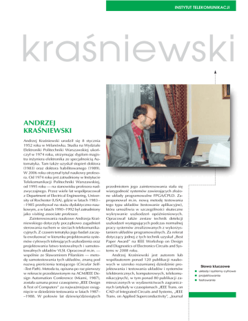 INSTYTUT TELEKOMUNIKACJI kraśniewski ANDRZEJ KRAŚNIEWSKI Andrzej Kraśniewski urodził się 8 stycznia 1952 roku w Milanówku. Studia na Wydziale Elektroniki Politechniki Warszawskiej ukończył w 1974 roku, otrzymując dyplom magistra inżyniera elektronika ze specjalnością Automatyka. Tam także uzyskał stopień doktora (1983) oraz doktora habilitowanego (1989). W 2006 roku otrzymał tytuł naukowy profesora. Od 1974 roku jest zatrudniony w Instytucie Telekomunikacji Politechniki Warszawskiej, od 1995 roku — na stanowisku profesora nadzwyczajnego. Przez wiele lat współpracował z Department of Electrical Engineering, University of Rochester (USA), gdzie w latach 1983 – –1985 przebywał na stażu dydaktyczno-naukowym, a w latach 1990–1992 był zatrudniony jako visiting associate professor. Zainteresowania naukowe Andrzeja Kraśniewskiego dotyczyły początkowo zagadnień sterowania ruchem w sieciach telekomunikacyjnych. Z czasem tematyka jego badań zaczęła ewoluować w kierunku projektowania systemów cyfrowych tolerujących uszkodzenia oraz projektowania łatwo testowalnych i samotestowalnych układów VLSI. Opracował m.in. — wspólnie ze Sławomirem Pilarskim — metodę samotestowania tych układów, znaną pod nazwą pierścienia testującego (Circular Self-Test Path). Metoda ta, opisana po raz pierwszy w referacie przedstawionym na ACM/IEEE Design Automation Conference (Miami, 1987), została uznana przez czasopismo „IEEE Design & Test of Computers” za najważniejsze osiągnięcie w dziedzinie testowania w latach 1987– –1988. W połowie lat dziewięćdziesiątych przedmiotem jego zainteresowania stała się wiarygodność systemów zawierających złożone układy programowalne FPGA/CPLD. Zaproponował m.in. nową metodę testowania tego typu układów (testowanie aplikacyjne), która umożliwia w szczególności skuteczne wykrywanie uszkodzeń opóźnieniowych. Opracował także zestaw technik detekcji uszkodzeń występujących podczas normalnej pracy systemów zrealizowanych z wykorzystaniem układów programowalnych. Za referat dotyczący jednej z tych technik uzyskał „Best Paper Award” na IEEE Workshop on Design and Diagnostics of Electronics Circuits and Systems w 2008 roku. Andrzej Kraśniewski jest autorem lub współautorem ponad 120 publikacji naukowych w szeroko rozumianej dziedzinie projektowania i testowania układów i systemów (elektronicznych, komputerowych, telekomunikacyjnych), w tym ponad 80 publikacji zamieszczonych w wydawnictwach zagranicznych (artykuły w czasopismach „IEEE Trans. on CAD of Integrated Circuits and Systems, „IEEE Trans. on Applied Superconductivity”, „Journal Słowa kluczowe n układy i systemy cyfrowe n projektowanie n testowanie INSTYTUT TELEKOMUNIKACJI K of System Architecture”, „Int. Journal of Computer Systems Science & Engineering”, „Microprocessors and Microsystems”; rozdziały w książkach wydanych przez Ablex Publishing Corp., Pergamon — Elsevier Science, Springer Verlag, Chapman and Hall). Andrzej Kraśniewski był członkiem komitetów sterujących i komitetów programowych około 30 międzynarodowych konferencji naukowych (w tym 4 konferencji w 2010 roku), recenzował artykuły dla wielu czasopism (w tym 5 czasopism wydawanych przez IEEE). Był także recenzentem wniosków o zatrudnienie na stanowisku profesora skiero-wanych do zaopiniowania przez 5 uczelni w USA i Kanadzie. Jest członkiem (senior member) IEEE (USA) oraz członkiem (fellow) Institution of Electrical Engineers — obecnie Institution of Engineering and Technology (UK). W ramach działalności dydaktycznej Andrzej Kraśniewski opracował kilkanaście przedmiotów prowadzonych na macierzystym Wydziale, dotyczących projektowania i testowania układów i systemów cyfrowych, a także przedmioty kształtujące umiejętności w zakresie technik komunikowania się. Ponadto prowadził cztery przedmioty w University of Rochester (za prowadzenie przedmiotu „Computer Systems I” uzyskał według ocen studentów czwarty wynik w Department of Electrical Engineering). Za osiągnięcia w pracy dydaktycznej otrzymał Medal Komisji Edukacji Narodowej (1999). Został także nagrodzony przez studentów w konkursie „Złotej Kredy” (2005). W latach 1993 –1999 Andrzej Kraśniewski był prodziekanem ds. organizacji Wydziału, odpowiedzialnym za wdrożenie systemu studiów trzystopniowych, a od 1999 roku pełni funkcję kierownika Studiów Doktoranckich, stale udoskonalając funkcjonujący na Wydziale model kształcenia doktorantów (model ten stał się wzorem dla rozwiązań przyjętych w Politechnice Warszawskiej, a także w innych uczelniach). W 2010 roku otrzymał nagrodę indywidualną I stopnia Ministra Nauki i Szkolnictwa Wyższego „za wdrożenie i upowszechnienie nowatorskich rozwiązań podnoszących standardy kształcenia na studiach doktoranckich oraz ich promocję na forum międzynarodowym”. Andrzej Kraśniewski jest od wielu lat zaangażowany w działalność organizacyjną na poziomie Uczelni. Był członkiem komisji senackich: Komisji ds. Organizacji Uczelni (1996 –1999, pełnił funkcję sekretarza Komisji), Komisji ds. Kształcenia (1996 –1999, 2002–2005), Komisji ds. Współpracy z Zagranicą (2005–2008). Od 2005 roku pełni funkcję pełnomocnika Rektora ds. wdrażania Procesu Bolońskiego; jest ponadto członkiem Uczelnianej Rady ds. Jakości Kształcenia oraz Rady Programowej Centrum Studiów Zaawansowanych. Od lutego 2010 roku bierze udział w opracowywaniu Strategii Rozwoju Politechniki Warszawskiej. Andrzej Kraśniewski jest cenionym w kraju i za granicą ekspertem w zakresie kształcenia inżynierów i ogólnych zagadnień szkolnictwa wyższego. Jest autorem lub współautorem około 55 publikacji poświęconych problematyce szkolnictwa wyższego — artykułów (m.in. w czasopismach „IEEE Trans. on Education” i „Higher Education in Europe”), rozdziałów w książkach (m.in. EU