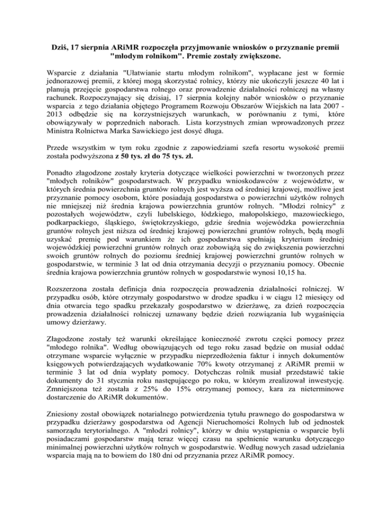 Dziś, 17 sierpnia ARiMR rozpoczęła przyjmowanie wniosków o przyznanie premii "młodym rolnikom". Premie zostały zwiększone. Wsparcie z działania "Ułatwianie startu młodym rolnikom", wypłacane jest w formie jednorazowej premii, z której mogą skorzystać rolnicy, którzy nie ukończyli jeszcze 40 lat i planują przejęcie gospodarstwa rolnego oraz prowadzenie działalności rolniczej na własny rachunek. Rozpoczynający się dzisiaj, 17 sierpnia kolejny nabór wniosków o przyznanie wsparcia z tego działania objętego Programem Rozwoju Obszarów Wiejskich na lata 2007 2013 odbędzie się na korzystniejszych warunkach, w porównaniu z tymi, które obowiązywały w poprzednich naborach. Lista korzystnych zmian wprowadzonych przez Ministra Rolnictwa Marka Sawickiego jest dosyć długa. Przede wszystkim w tym roku zgodnie z zapowiedziami szefa resortu wysokość premii została podwyższona z 50 tys. zł do 75 tys. zł. Ponadto złagodzone zostały kryteria dotyczące wielkości powierzchni w tworzonych przez "młodych rolników" gospodarstwach. W przypadku wnioskodawców z województw, w których średnia powierzchnia gruntów rolnych jest wyższa od średniej krajowej, możliwe jest przyznanie pomocy osobom, które posiadają gospodarstwa o powierzchni użytków rolnych nie mniejszej niż średnia krajowa powierzchnia gruntów rolnych. "Młodzi rolnicy" z pozostałych województw, czyli lubelskiego, łódzkiego, małopolskiego, mazowieckiego, podkarpackiego, śląskiego, świętokrzyskiego, gdzie średnia wojewódzka powierzchnia gruntów rolnych jest niższa od średniej krajowej powierzchni gruntów rolnych, będą mogli uzyskać premię pod warunkiem że ich gospodarstwa spełniają kryterium średniej wojewódzkiej powierzchni gruntów rolnych oraz zobowiążą się do zwiększenia powierzchni swoich gruntów rolnych do poziomu średniej krajowej powierzchni gruntów rolnych w gospodarstwie, w terminie 3 lat od dnia otrzymania decyzji o przyznaniu pomocy. Obecnie średnia krajowa powierzchnia gruntów rolnych w gospodarstwie wynosi 10,15 ha. Rozszerzona została definicja dnia rozpoczęcia prowadzenia działalności rolniczej. W przypadku osób, które otrzymały gospodarstwo w drodze spadku i w ciągu 12 miesięcy od dnia otwarcia tego spadku przekazały gospodarstwo w dzierżawę, za dzień rozpoczęcia prowadzenia działalności rolniczej uznawany będzie dzień rozwiązania lub wygaśnięcia umowy dzierżawy. Złagodzone zostały też warunki określające konieczność zwrotu części pomocy przez "młodego rolnika". Według obowiązujących od tego roku zasad będzie on musiał oddać otrzymane wsparcie wyłącznie w przypadku nieprzedłożenia faktur i innych dokumentów księgowych potwierdzających wydatkowanie 70% kwoty otrzymanej z ARiMR premii w terminie 3 lat od dnia wypłaty pomocy. Dotychczas rolnik musiał przedstawić takie dokumenty do 31 stycznia roku następującego po roku, w którym zrealizował inwestycję. Zmniejszona też została z 25% do 15% otrzymanej pomocy, kara za nieterminowe dostarczenie do ARiMR dokumentów. Zniesiony został obowiązek notarialnego potwierdzenia tytułu prawnego do gospodarstwa w przypadku dzierżawy gospodarstwa od Agencji Nieruchomości Rolnych lub od jednostek samorządu terytorialnego. A "młodzi rolnicy", którzy w dniu wystąpienia o wsparcie byli posiadaczami gospodarstw mają teraz więcej czasu na spełnienie warunku dotyczącego minimalnej powierzchni użytków rolnych w gospodarstwie. Według nowych zasad udzielania wsparcia mają na to bowiem do 180 dni od przyznania przez ARiMR pomocy. Agencja przypomina, że każdy "młody rolnik", który zamierza starać się o premię musi posiadać wykształcenie rolnicze, gwarantujące dobre przygotowanie do zawodu lub inne wykształcenie i odpowiedni staż pracy w rolnictwie. Możliwe jest również uzupełnienie wykształcenia w ciągu trzech lat od doręczenia decyzji o przyznaniu pomocy. Termin rozpoczęcia przyjmowania wniosków w tegorocznym naborze został ogłoszony 2 sierpnia przez Prezesa Agencji Restrukturyzacji i Modernizacji Rolnictwa, Tomasza Kołodzieja w dzienniku o zasięgu ogólnopolskim, a także na stronie internetowej Agencji. Wnioski o przyznanie finansowego wsparcia dla "młodych rolników" można składać osobiście lub przez upoważnioną osobę w oddziałach regionalnych ARiMR, a także wysłać listem poleconym lub pocztą kurierską. Do wykorzystania w tegorocznym naborze wniosków na to działanie jest ponad 387 mln zł. Podział środków na poszczególne województwa przedstawia poniższa tabela. Województwo Dolnośląskie Kujawsko-pomorskie Lubelskie Lubuskie Łódzkie Małopolskie Mazowieckie Opolskie Podkarpackie Podlaskie Pomorskie Śląskie Świętokrzyskie Warmińsko-mazurskie Wielkopolskie Zachodniopomorskie Razem Limit środków finansowych (zł) 16 860 165 29 883 189 43 720 152 7 402 969 34 883 100 14 302 071 64 843 807 10 542 448 12 015 290 30 580 851 16 046 226 9 650 991 16 782 647 18 488 043 49 417 725 12 170 326 387 590 000 Termin składania wniosków o przyznanie pomocy upływa z końcem dnia roboczego następującego po dniu podania do publicznej wiadomości na stronie internetowej www.arimr.gov.pl informacji określającej, że zapotrzebowanie na środki finansowe wynikające z już złożonych wniosków w 2010 r. osiągnęło 120% dostępnych środków w danym województwie, lecz nie później niż 31 grudnia 2010 roku. Departament Komunikacji Społecznej